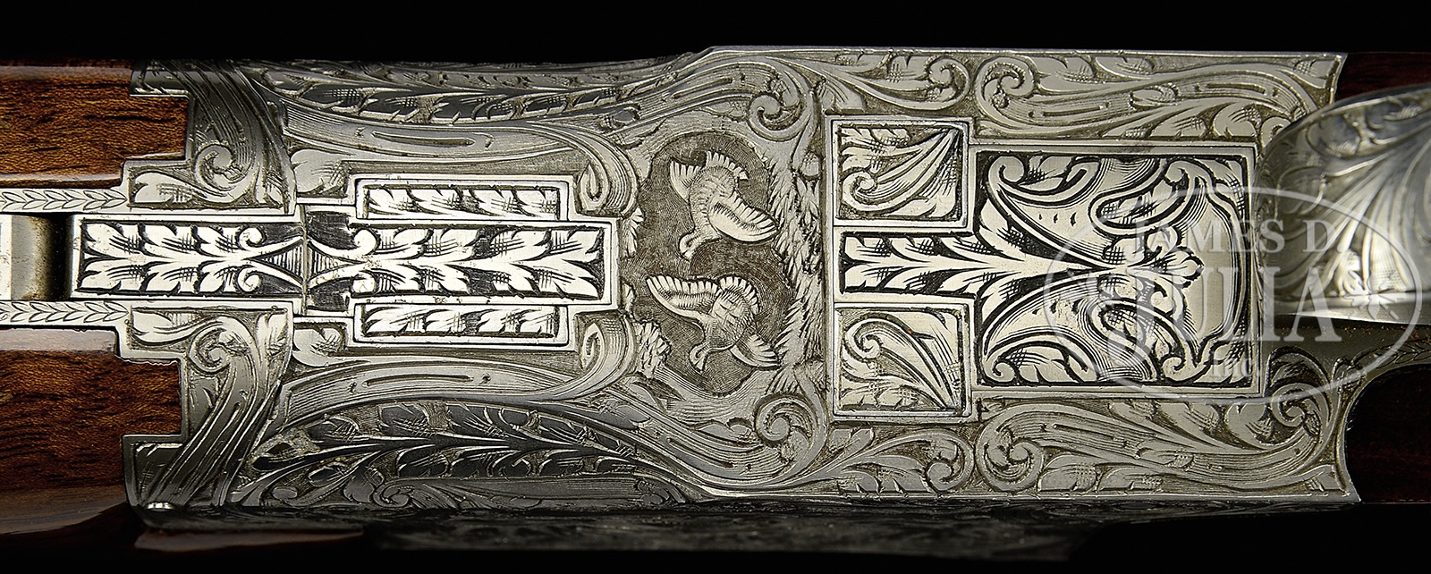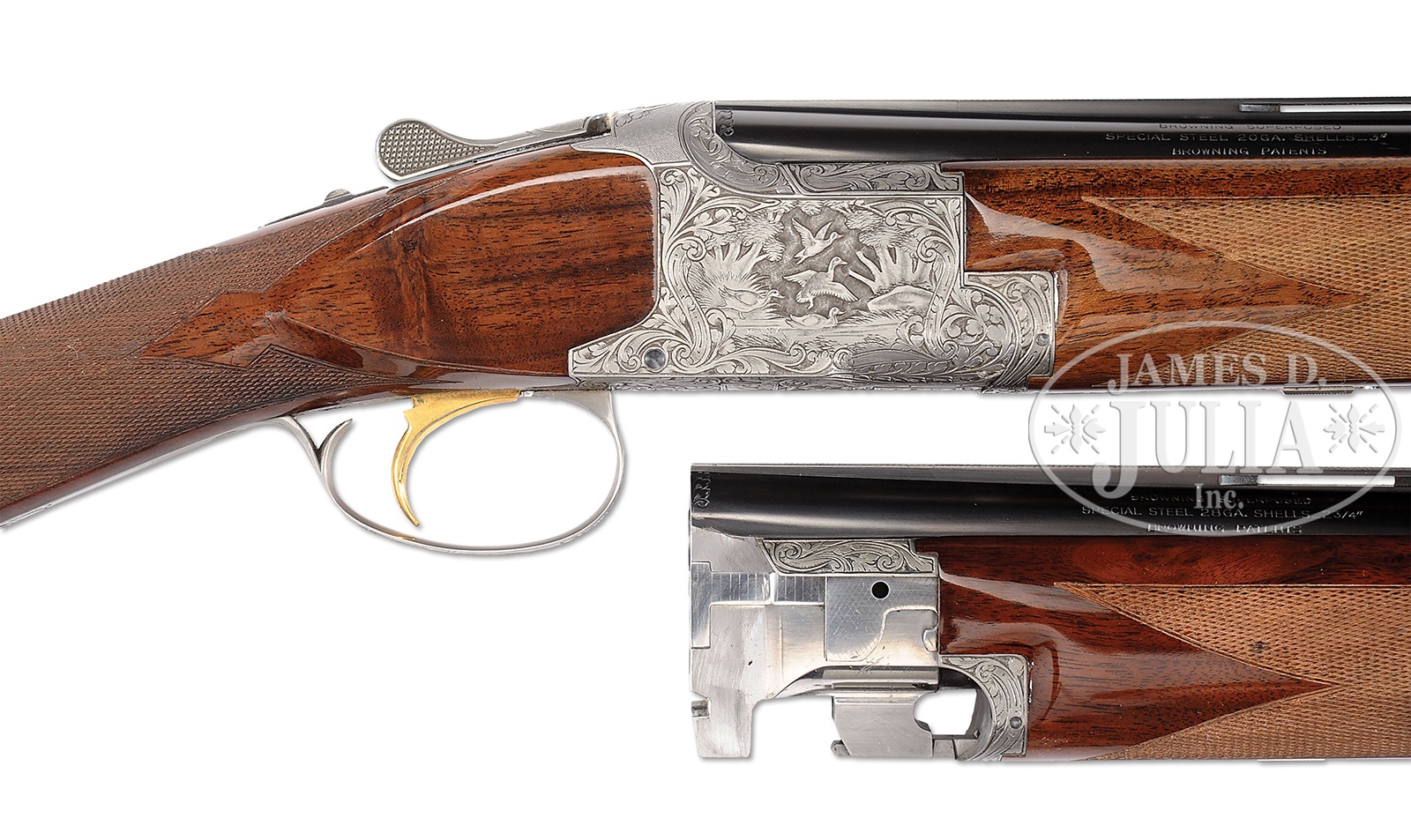 *UNUSUAL BROWNING SUPERPOSED “DIANA” GRADE SUPERLIGHT 20/ 28 GAUGE SHOTGUN SET WITH ENGRAVING BY LEWANCZYK AND CASE.SN 299IV73. (1973) Cal. 20 ga. 3″ Chambers and 28 ga. 2-3/4″ chambers. Both 26-1/2″ bbls have narrow, matted ventilated ribs and are marked with marked with Morgan Utah and Montreal PQ addresses. Rear sides of bbls are stamped with SNs and “1” or “2”. 20 ga set “1” are marked for chokes “skeet and IMod”, and 28 ga set “2” are marked for “IC and Mod”. Typical coin finished, superposed action squared at bottom rear portion, is engraved with nearly full coverage large strap work scroll with acanthus highlights surrounding vignettes of game birds; pheasants on left, ducks on right, and grouse on bottom, in usual “Diana” style. Engraving on this gun is signed “Lewanczyk” at bottom rear of duck scene. Trigger guard is engraved with a pair of rabbits. Very fine, crotch figured claro walnut straight grip Superlight buttstock measures 14-1/4″ over dark brown leather covered pad. Modified point pattern checkering is at grip. A gold oval on toe line is engraved “CGV”. Each bbl set has its own Superlight type schnabeled forend, that match well. 20 GA BBL SET “1”: Bore diameter: top -.620, bottom – .623. Bore restrictions: top – .021 (Imod), bottom – .006 (IC). Drop at heel: 2-3/8″, drop at comb: 1-1/2″. Cast: Neutral. Weight: 6 lbs. 2 oz. LOP: 14-1/4″. 28 GA BBL SET “2”: Bore diameter: top -.552, bottom – .548. Bore restrictions: top – .022 (full), bottom – .012 (mod). Drop at heel: 2-3/8″, drop at comb: 1-1/2″. Cast: Neutral. Weight: 6 lbs. 9 oz. LOP: 14-1/4″. Hartmann case with space for action and two bbls, is lined in faux fur. PROVENANCE: Remarkable William Larkin Moore Private Estate Collection of Fine Sporting Arms. CONDITION: Excellent, with only a few very light handling and assembly marks in all wood and metal finishes; most notably dulling of coin finish on trigger guard tang. Checkering on grip is darkening, still light on both forends. Checkering on forend of 20 ga bbls, is missing many diamonds. Mechanically crisp. Case is excellent with some light rubs. Interior is very lightly soiled from bbls. 50594-112 MGM90 (10,000-15,000) – Lot 3564