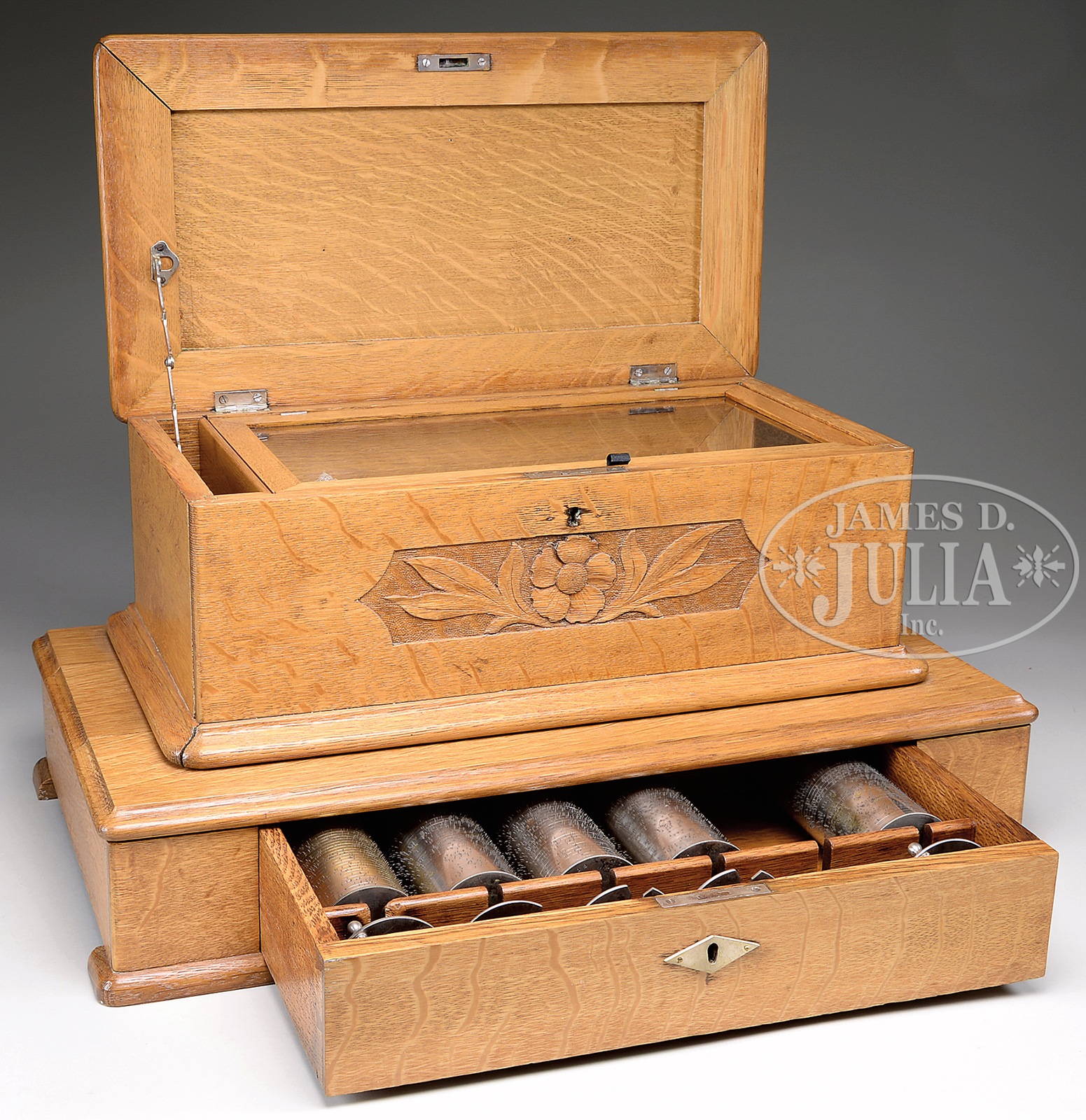 A great sounding cylinder music box with six interchangeable cylinders of six tunes each, a zither attachment mounted on musical lyre with flowers and leaves, and tune indicator. Single spring motor with jeweled governor, automatic stop, and safety check for spring barrel. Mounted in a quarter sawn oak case with drawer for six cylinders. Case has carved flower with leaves on front. Celluloid tag with name and address of dealer that sold it. SIZE: 25-1/2″ w x 14-1/2″d x 12-1/2″ h. CONDITION: Nice older restoration. Everything nice and clean. Polished original nickel. Oak case has been refinished golden oak. Tune card is missing. Has original winding crank. Lid has a few spots of discoloration. Miter joints on corners of wood are a little open. 1-13520 (2,000-3,000) – Lot 3565