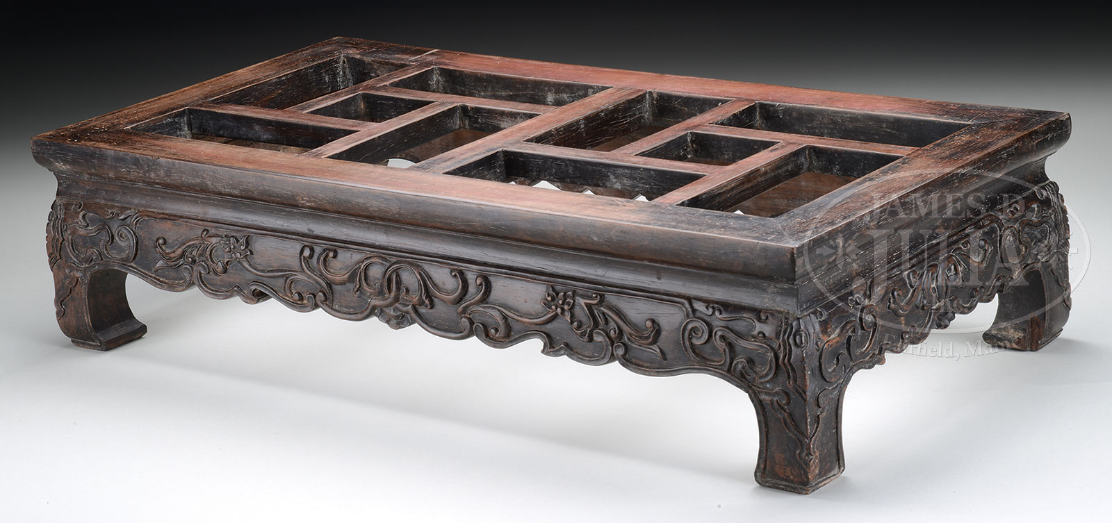 China. Early 20th century. The low rectangular stand with openwork top standing on in-turned feet with aprons carved with elegant lotus scroll. SIZE: 27-1/2″l x 13-1/2″ w x 6-1/2″ h. CONDITION: Wear to the finish, one foot with chip to corner. 51819-1 (100-200) – Lot 3565