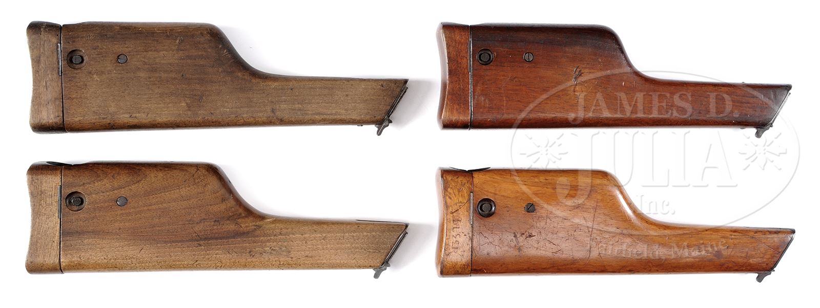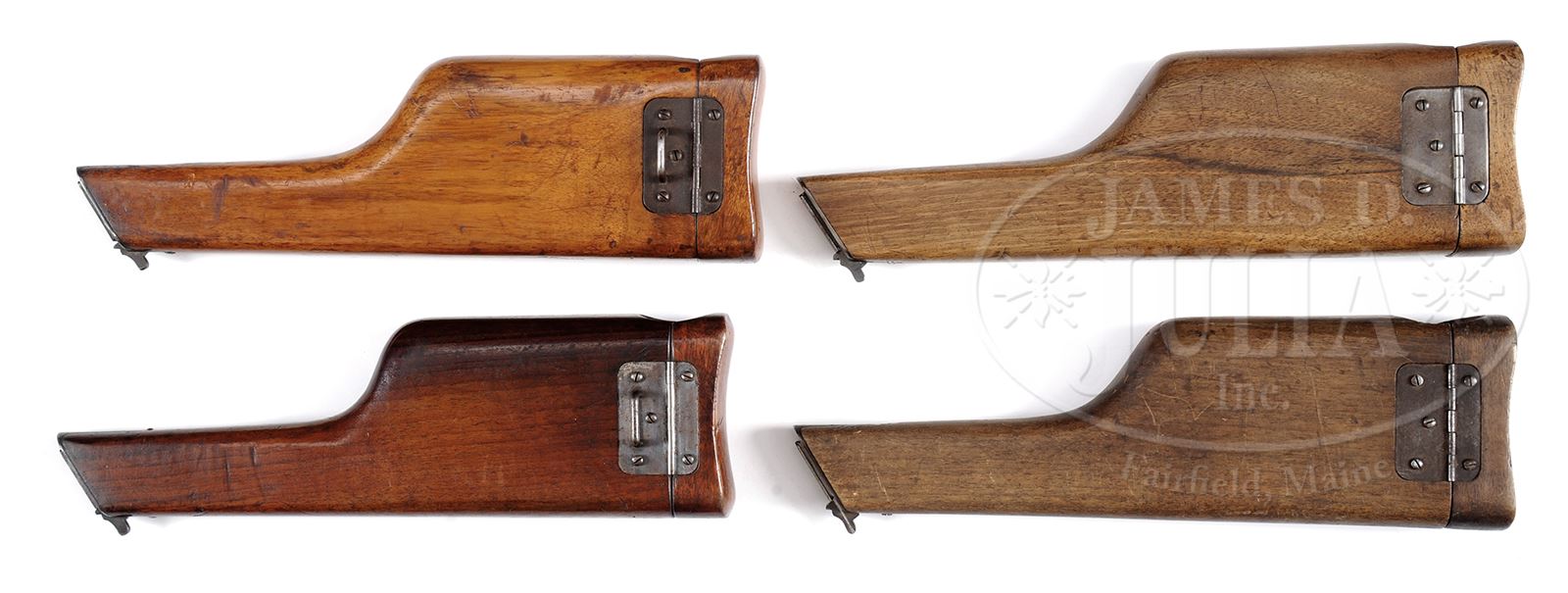 FOUR MAUSER C96 WOOD HOLSTER/STOCKS.Standard Mauser C96 wood holster/stocks with metal stock lugs and serrated metal release buttons to open lids. One is unnumbered, others are SN 336, 302, and 402. SN 402 has military Crown/U inspector mark. PROVENANCE: Collection of Dr. Geoffrey Sturgess. CONDITION: Very good, normal wear on edges and corners with scattered light dings and dents. Good orig blue on metal with scattered corrosion. 43475-1074 BWS (2,000-3,000) – Lot 3566