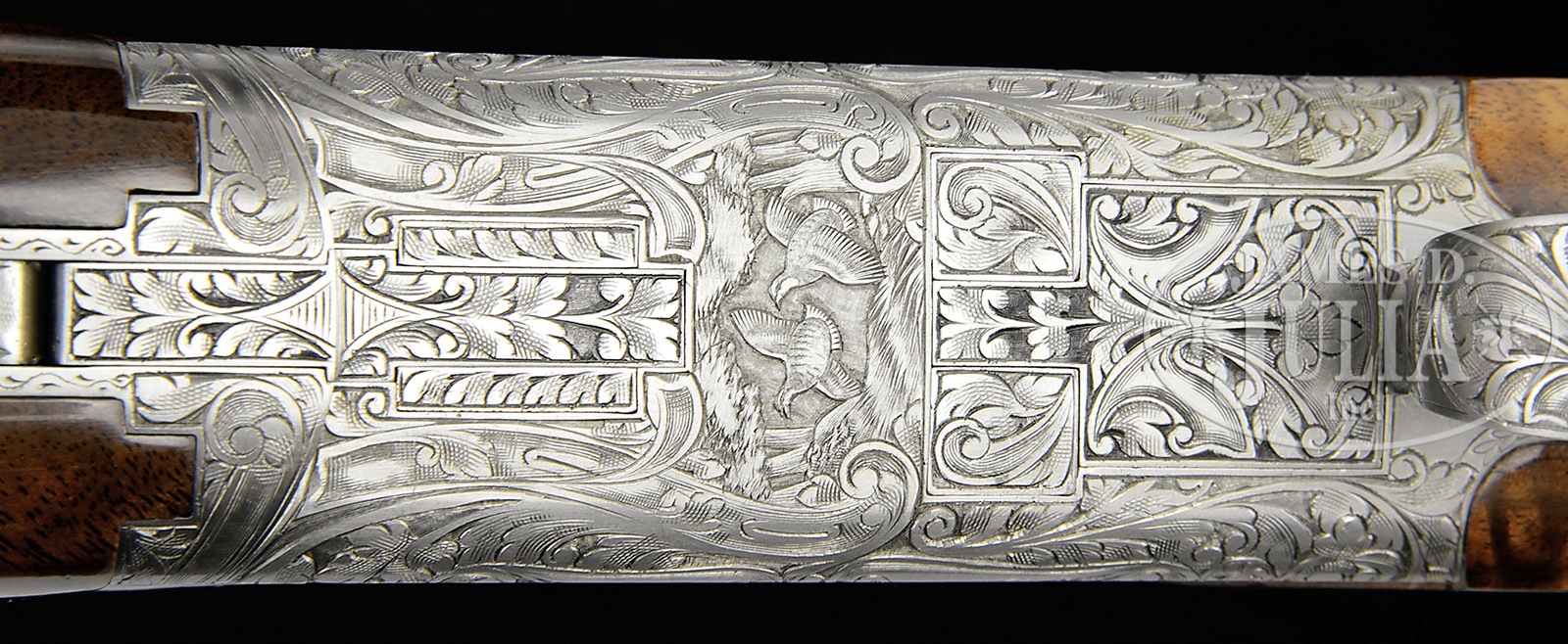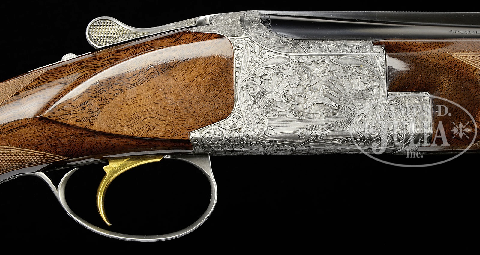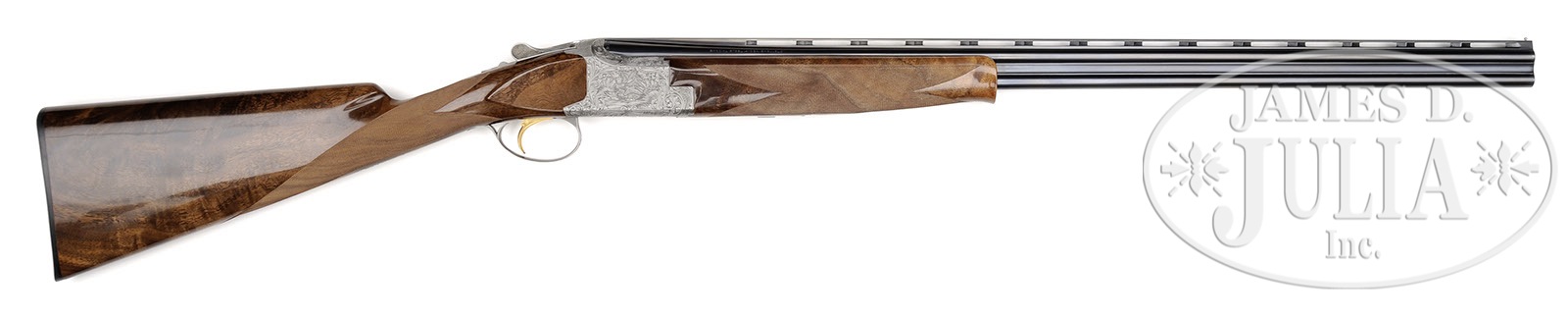 *RARE .410 BELGIAN BROWNING SUPERPOSED SUPERLIGHT DIANA GRADE WITH BOX.SN 544J83. Cal. .410. 3″ Chambers. 28″ Bbls with ventilated rib are choked modified and full, and are marked with usual Browning Arms addresses and information on top bbl. Typical gray finished action is engraved with large, scrolled acanthus with shaded background, framing vignettes of five pheasants on left, four ducks in marsh on right, and a pair of quail on bottom of action. A pair of rabbits is on trigger guard bow. Engravers signature, G. Kozlowski, is on trigger plate. Boldly marbled and finely figured claro walnut straight grip buttstock measures 14-1/4″ over Browning composition buttplate. Modified point pattern checkering is at grip. Schnabeled superlight one piece forend matches buttstock well. Drop at heel: 2-1/16″, drop at comb: 1-5/16″. Weight: 6 lbs. 6 oz. LOP: 14-1/4″. Shiny black and gold Browning box has correct end label for this gun, and contains instruction manual and wrapping tissue. PROVENANCE: Letter from Jaqua’s Fine Guns indicating that this is one of the “final series of all Belgian .410’s” and consignor states that it “originated from the Robert Peterson Museum.” CONDITION: Excellent, essentially as new, appears unfired except for proof, and only the lightest of rubs and a couple of light marks in gloss finish of stock, mostly on forend. Mechanically crisp. Box is very fine with some light chipping of edges and corners. End label is excellent. 4-51906 MGM201 (15,000-25,000) – Lot 3568