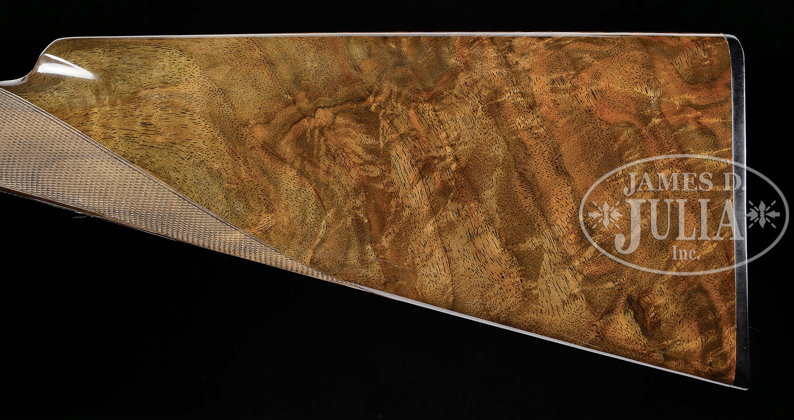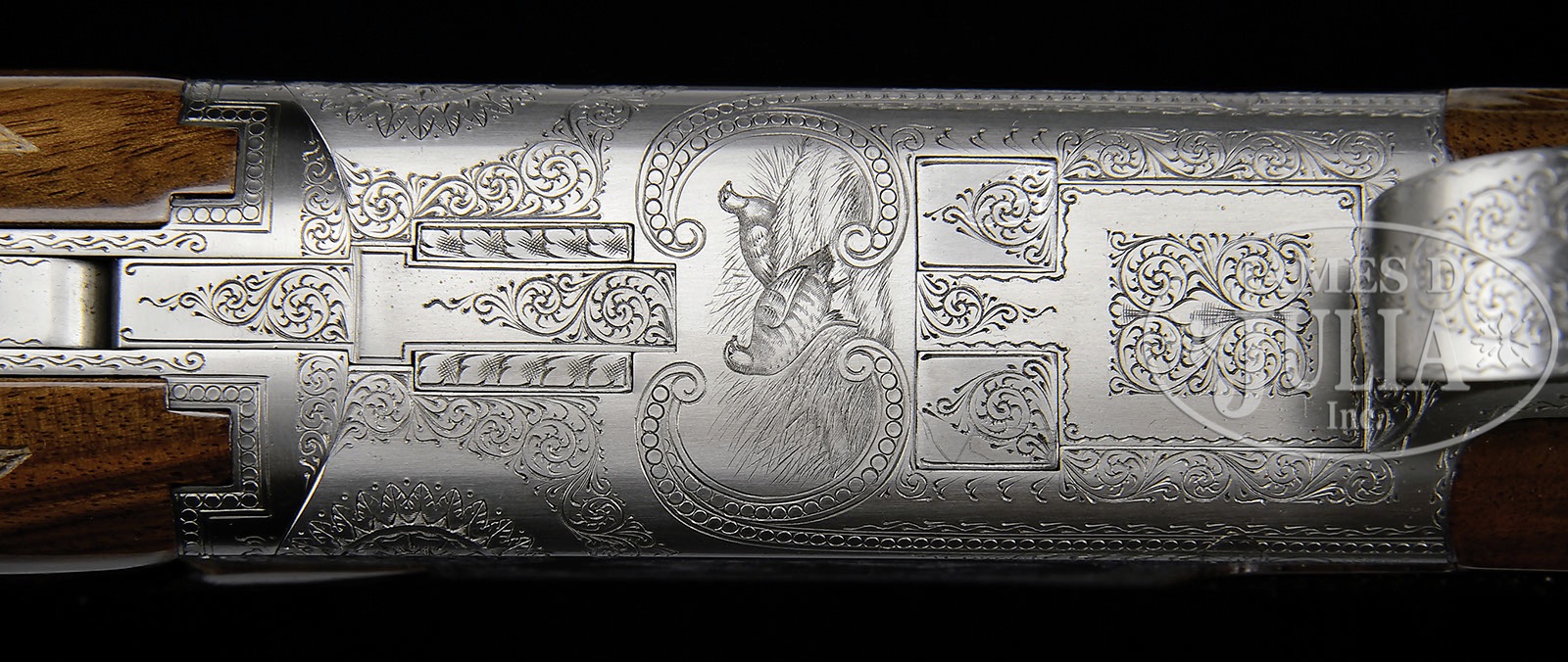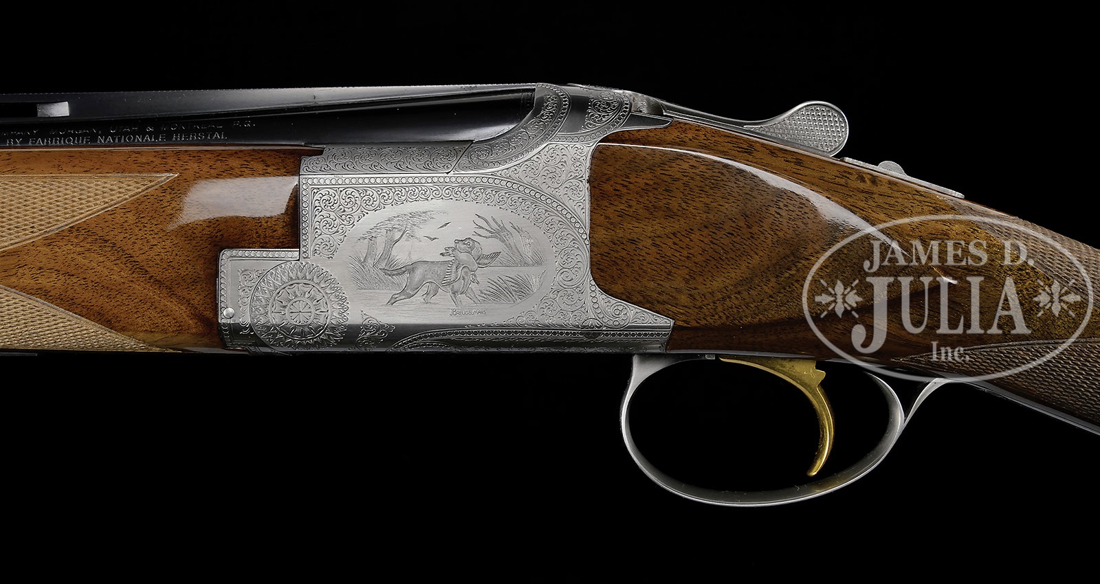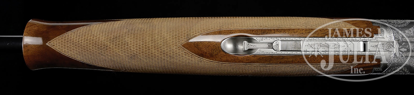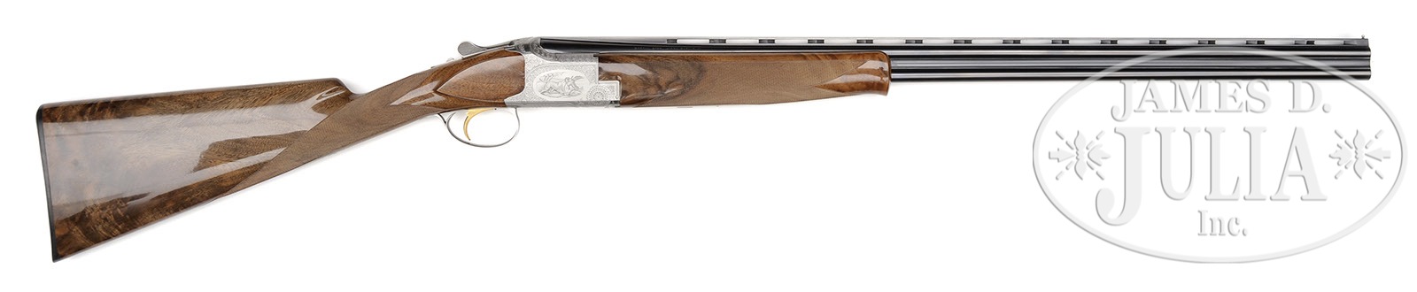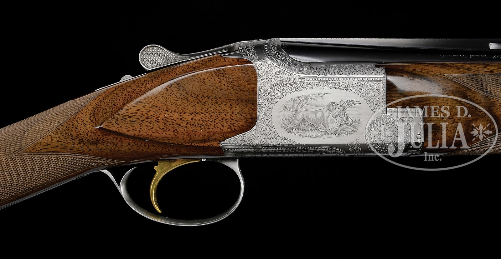 *RARE .410 BROWNING SUPERPOSED SUPERLIGHT POINTER GRADE ENGRAVED BY J. BREUGELMANS, WITH BOX.SN 467J83. Cal. .410. 3″ Chambers. 28″ Bbls with ventilated rib are choked modified and full, and are marked with usual Browning Arms addresses and information on top bbl along with “MADE IN BELGIUM”. Typical gray finished action is engraved with small shaded scroll with beaded borders framing vignettes of dogs retrieving birds; a Labrador has mallard on left, and a pointer is retrieving a pheasant on right. Bottom of action depicts a pair of grouse, and a pair of pheasant, one resting, the other flushing, on trigger guard bow. Engraver’s signature, J. Breugelmans, is at bottom of both scenes. Fine stump figured claro walnut straight grip buttstock measures 14-1/4″ over Browning composition buttplate. Modified point pattern checkering is at grip. Schnabeled superlight forend matches buttstock well, but is a bit lighter in color. Drop at heel: 2-1/4″, drop at comb: 1-3/8″. Weight: 6 lbs. 10 oz. LOP: 14-1/4″. Black and gold cardboard box with correct end label for this gun contains instruction booklet and wrapping tissue. PROVENANCE: Factory letter indicating that it was shipped March 15, 1984. Letter from Jaqua’s Fine Guns indicating that this is one of the “final series of all Belgian .410’s.” and consignor states that it “originated from Robert Peterson Museum”. CONDITION: Excellent, essentially as new, appears unfired except for proof, with only the slightest hint of assembly mark on bottom bbl, and one or two of the faintest marks in gloss finish of stock. Mechanically crisp, with some discoloration of mating surfaces of bbl sides. Box is very fine with a number of chips on edges, and with some tape. End label is lifting. 4-51914 MGM192 (17,500-27,500) – Lot 3569