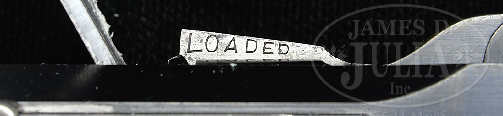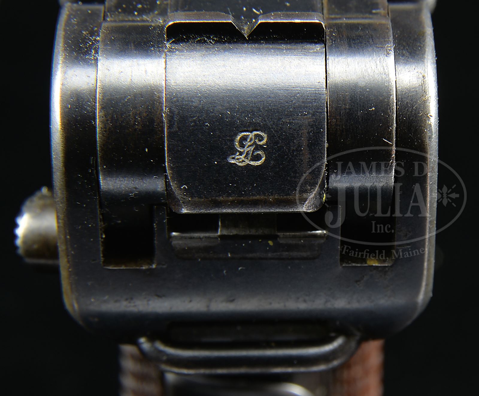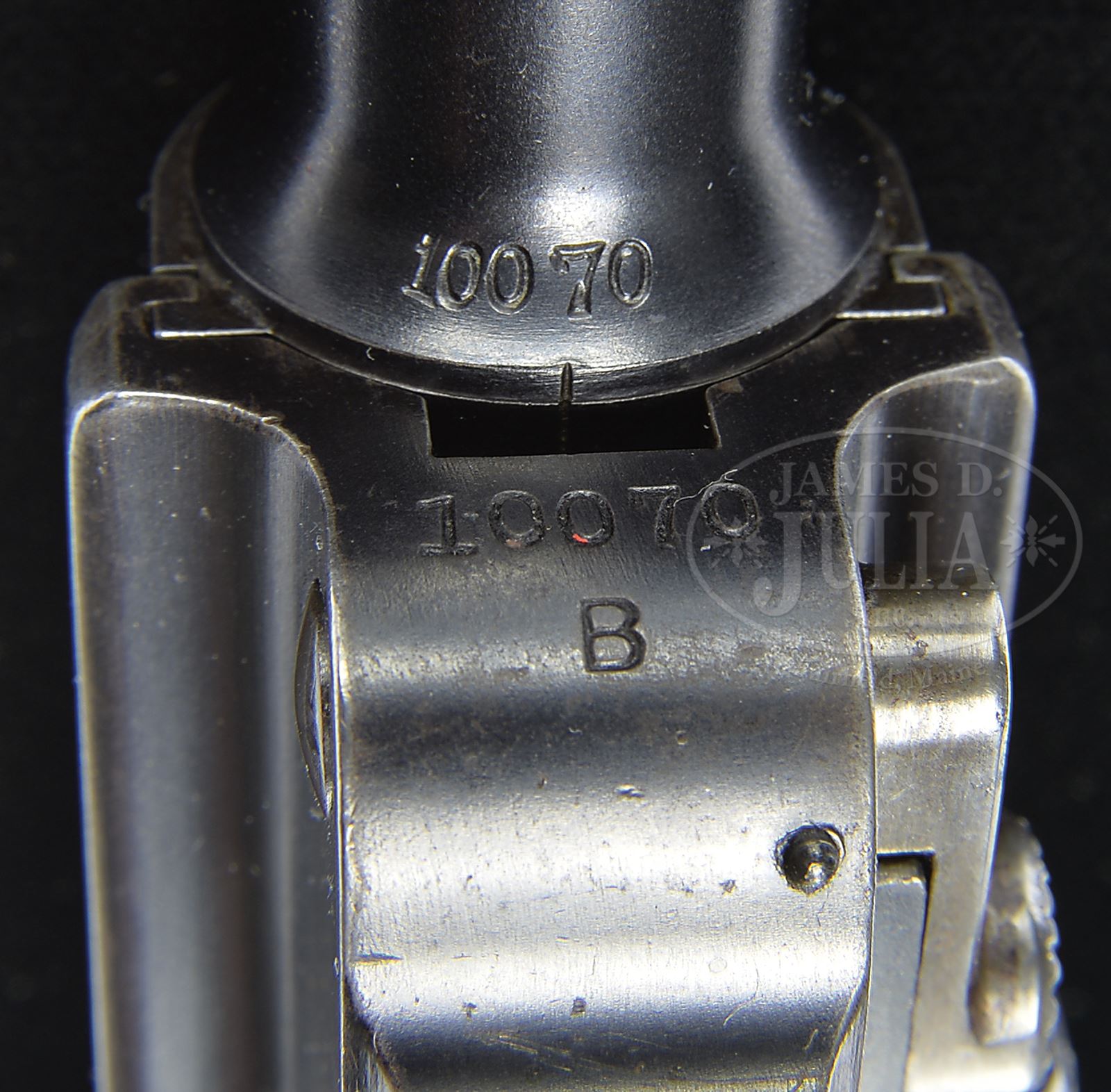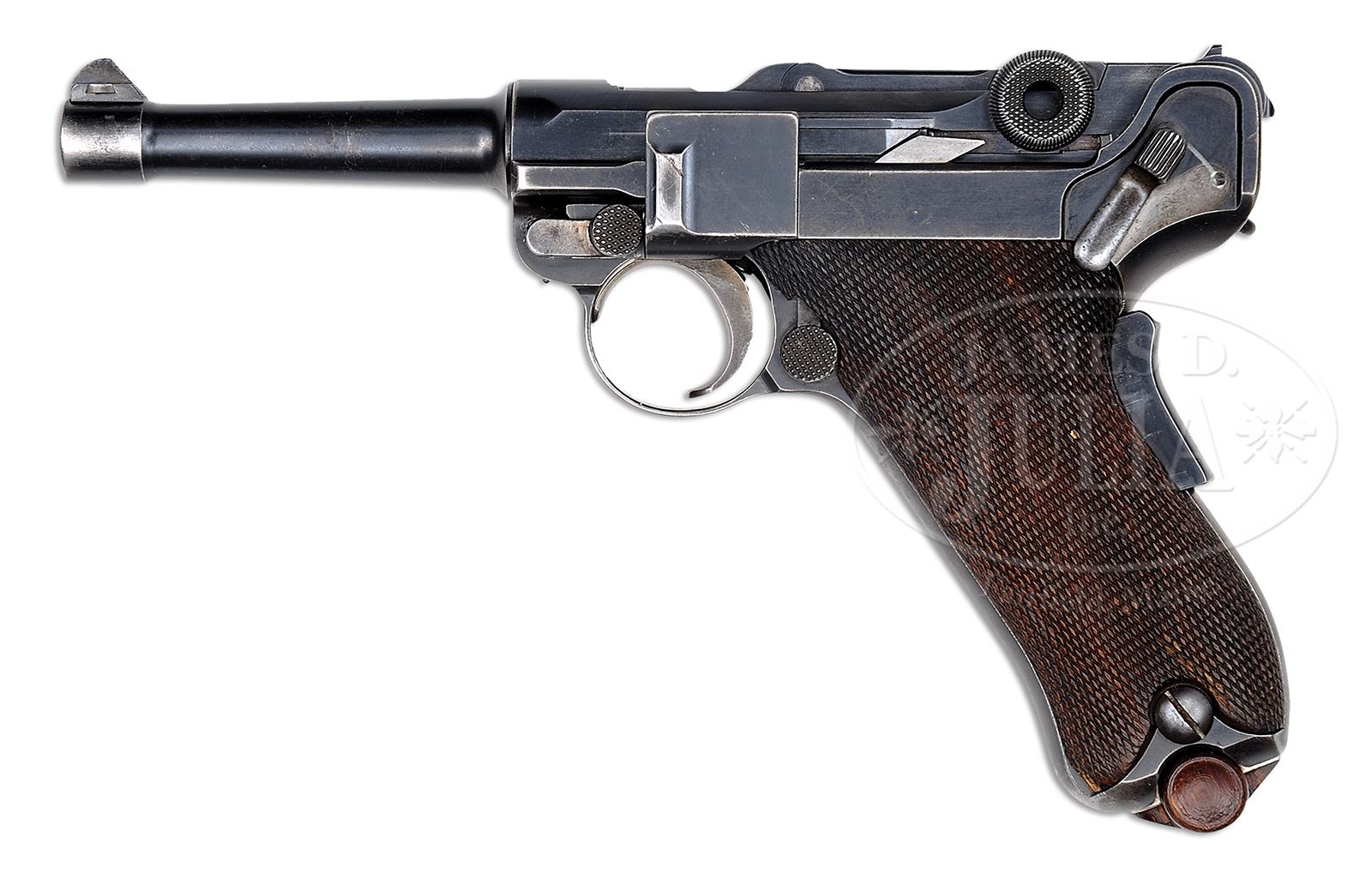 SN 10070B. Cal. 9mm. 4″ bbl with full SN on bottom of bbl. DWM scroll on center toggle link. “GL” on back of rear toggle link. Flat checkered New Model toggles without toggle lock. Modified frame without toggle latch. Unique extractor which is the same ear width as production New Model component, but has ears which are 0.5 mm thicker, preventing interchangeability with production guns. “LOADED” marking on extractor indicates that this gun was prepared for submission for U.S. evaluation (10069B is mechanically identical, documented to have been evaluated by the U.S. Board of Ordnance, and is still in the Springfield Armory Collection). Matching numbers on toggle assembly. Firing pin is unnumbered. Takedown lever, trigger, hold open, safety lever and grip safety are unnumbered. Receiver has 2-digit matching number on stop lug. 1900 short frame modified by addition of brazed in upper spring seat to coil spring (same as 1905 Dutch Trials guns). Full SN on front of frame. Matching numbered checkered walnut grips. Proper plain wood bottom mag. This gun is featured on pp. 223, 228, 261, 283, 290, 291 and 300 of Borchardt & Luger Automatic Pistols by Joachim Gortz and Dr. Geoffrey Sturgess. PROVENANCE: Collection of Dr. Geoffrey Sturgess. CONDITION: Fine, retaining 90% orig blue with wear on sharp edges and corners. Extra wear on sides of muzzle, frame rails and high part of sideplate. Light corrosion starting on left side. Gripstraps are stained and fading to brown. 50% straw with scattered corrosion and very light pits on safety lever. Grips are oil soaked and moderately worn. There is a small chip on front corner of left grip. Mag is excellent with little wear. Bore is sharp with light frosting. Mechanics are fine. 43475-500 BWS17 (20,000-35,000) – Lot 3569