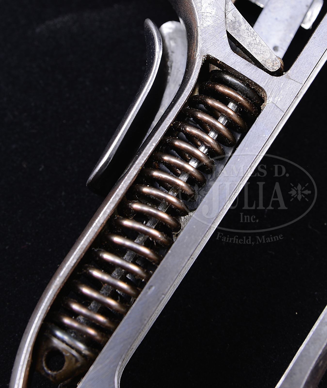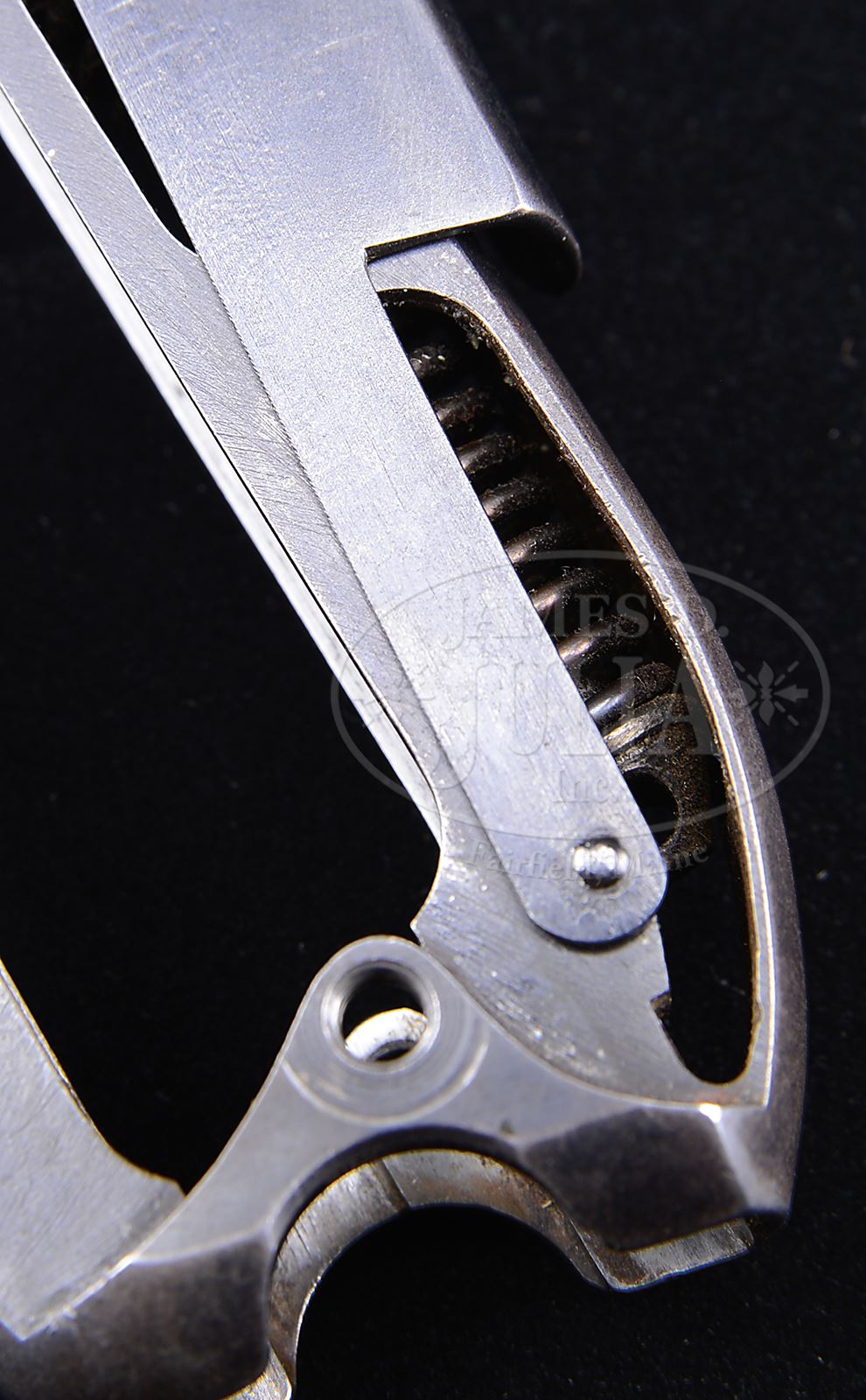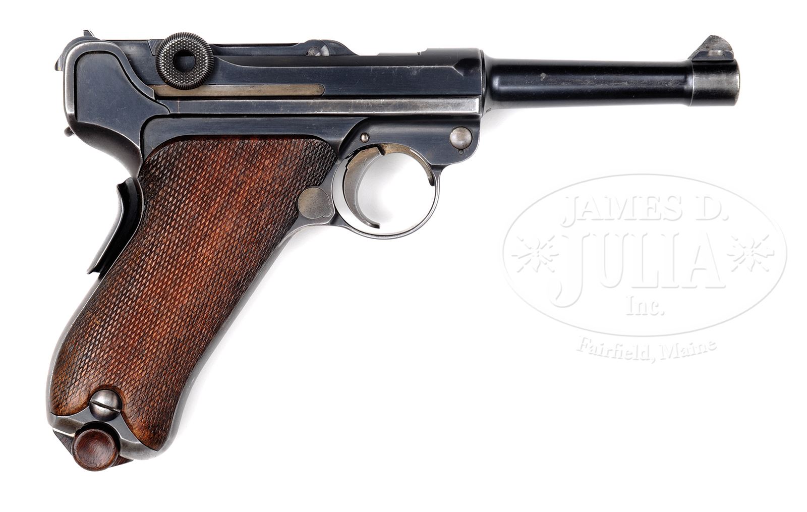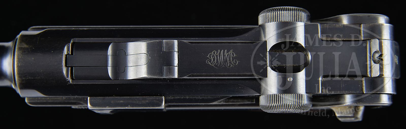 SN 10070B. Cal. 9mm. 4″ bbl with full SN on bottom of bbl. DWM scroll on center toggle link. “GL” on back of rear toggle link. Flat checkered New Model toggles without toggle lock. Modified frame without toggle latch. Unique extractor which is the same ear width as production New Model component, but has ears which are 0.5 mm thicker, preventing interchangeability with production guns. “LOADED” marking on extractor indicates that this gun was prepared for submission for U.S. evaluation (10069B is mechanically identical, documented to have been evaluated by the U.S. Board of Ordnance, and is still in the Springfield Armory Collection). Matching numbers on toggle assembly. Firing pin is unnumbered. Takedown lever, trigger, hold open, safety lever and grip safety are unnumbered. Receiver has 2-digit matching number on stop lug. 1900 short frame modified by addition of brazed in upper spring seat to coil spring (same as 1905 Dutch Trials guns). Full SN on front of frame. Matching numbered checkered walnut grips. Proper plain wood bottom mag. This gun is featured on pp. 223, 228, 261, 283, 290, 291 and 300 of Borchardt & Luger Automatic Pistols by Joachim Gortz and Dr. Geoffrey Sturgess. PROVENANCE: Collection of Dr. Geoffrey Sturgess. CONDITION: Fine, retaining 90% orig blue with wear on sharp edges and corners. Extra wear on sides of muzzle, frame rails and high part of sideplate. Light corrosion starting on left side. Gripstraps are stained and fading to brown. 50% straw with scattered corrosion and very light pits on safety lever. Grips are oil soaked and moderately worn. There is a small chip on front corner of left grip. Mag is excellent with little wear. Bore is sharp with light frosting. Mechanics are fine. 43475-500 BWS17 (20,000-35,000) – Lot 3569