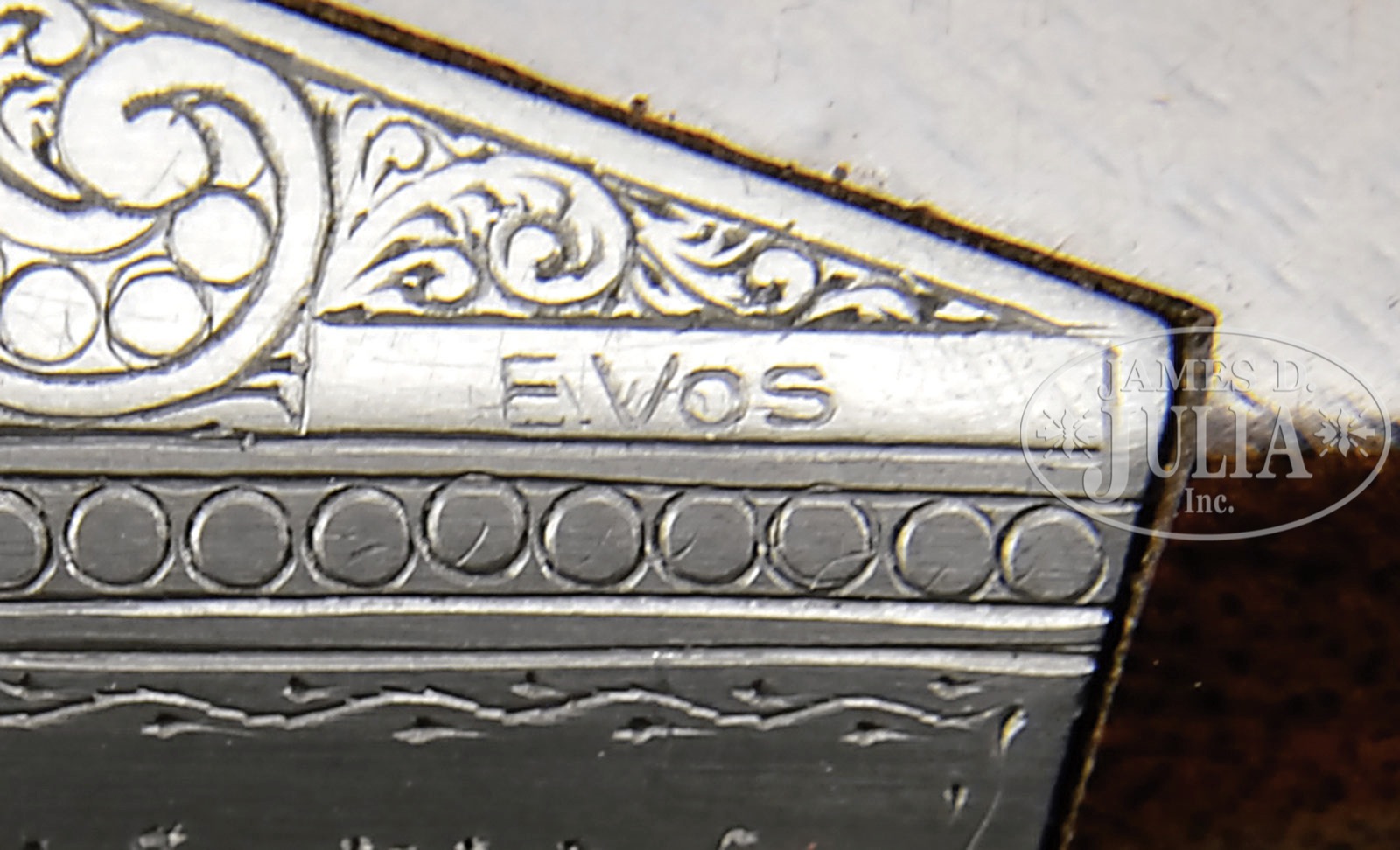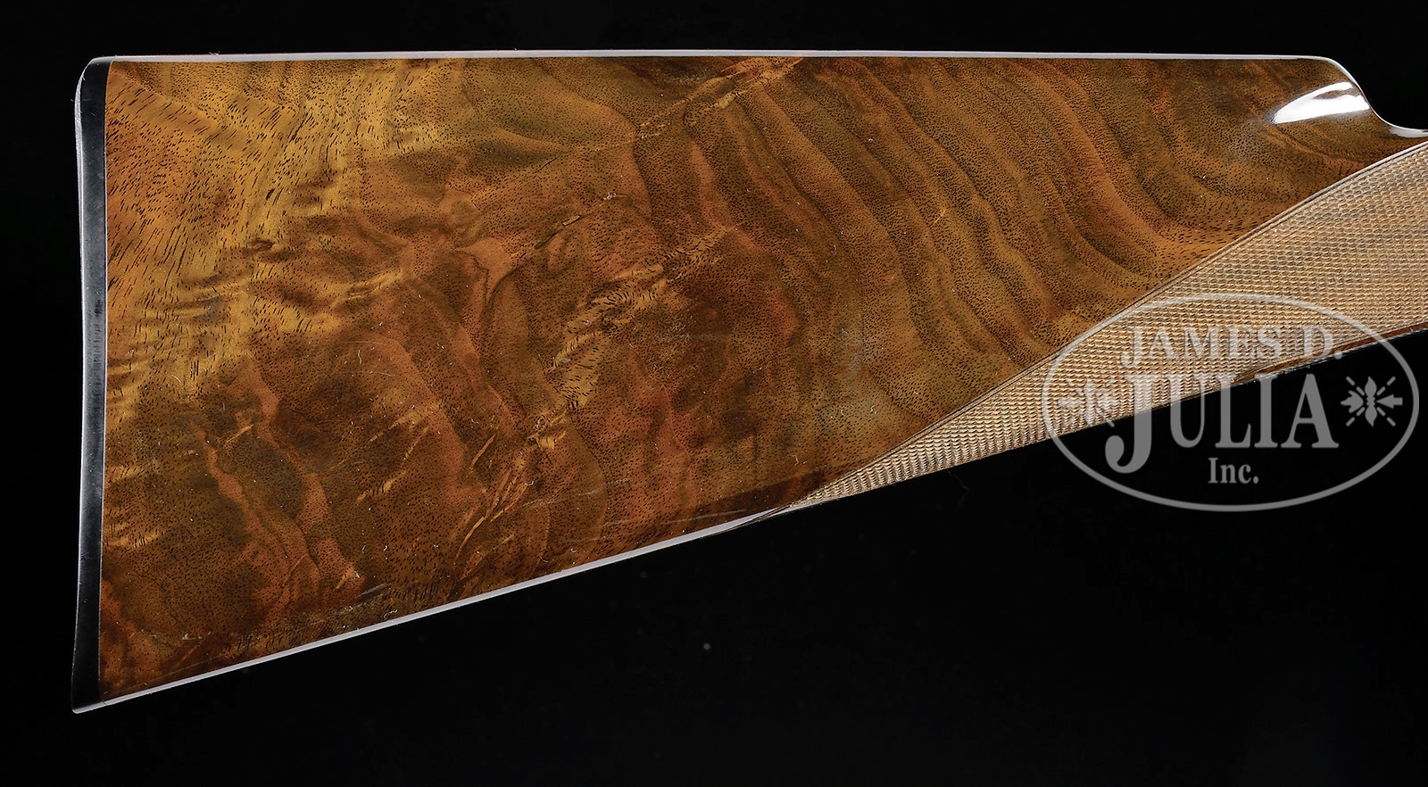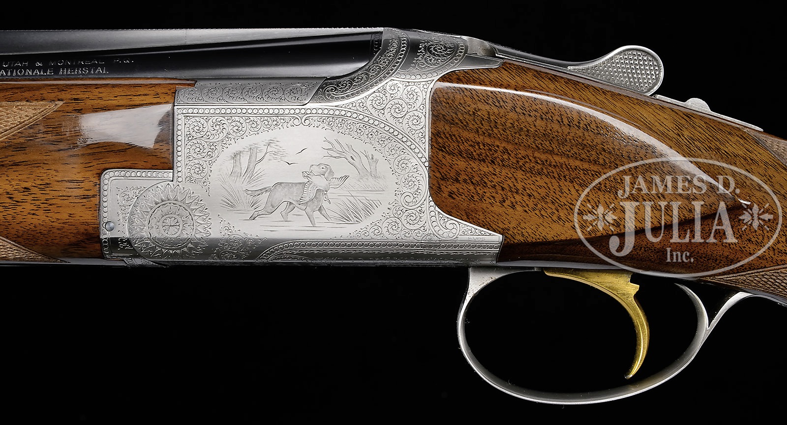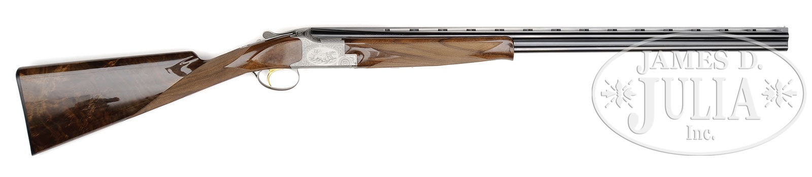 SN 460J83. Cal. .410. 3″ Chambers. 28″ Bbls with ventilated rib are choked modified and full, and are marked with usual Browning Arms addresses and information on top bbl along with “MADE IN BELGIUM”. Typical gray finished action is engraved with small shaded scroll with beaded borders framing vignettes of dogs retrieving birds; a setter has mallard on left, and a pointer is retrieving a pheasant on right. Bottom of action depicts a pair of grouse, and a pair of pheasant, one resting, the other flushing, is on trigger guard bow. Engraver’s signature, E. Vos, is in rectangle on bottom right of left side action. Nicely stump figured claro walnut straight grip buttstock measures 14-1/4″ over Browning composition buttplate. Modified point pattern checkering is at grip. Schnabeled superlight forend matches buttstock well. Drop at heel: 2-5/16″, drop at comb: 1-3/8″. Weight: 6 lbs. 12 oz. LOP: 14-1/4″. PROVENANCE: Factory letter indicating that it was shipped Feb. 16, 1984. Letter from Jaqua’s Fine Guns indicating that this is one of the “final series of all Belgian .410’s.” and consignor states that it “originated from Robert Peterson Museum”. CONDITION: Excellent, essentially as new, appears unfired except for proof, with only the slightest hint of assembly mark on bottom bbl, and some light rubs and a couple of marks in gloss finish of stock. Mechanically crisp.   4-51913 MGM193 (17,500-27,500) – Lot 3570