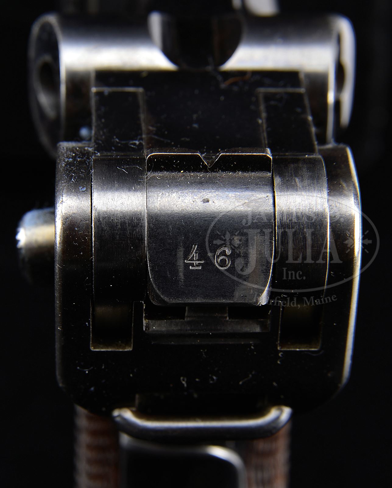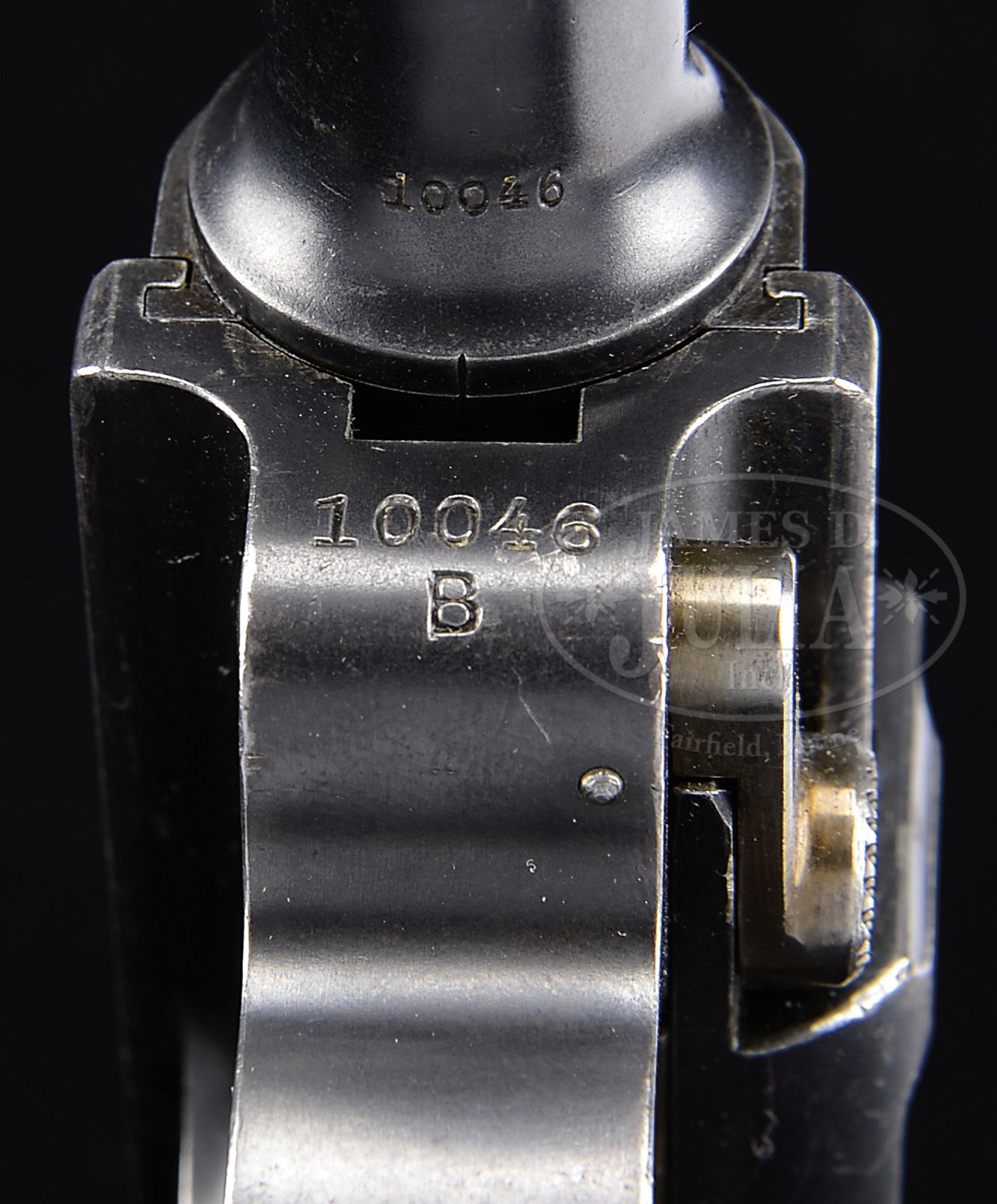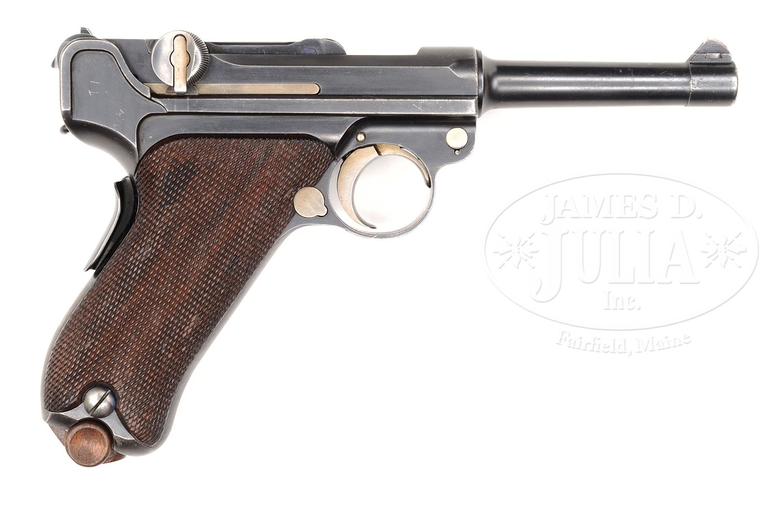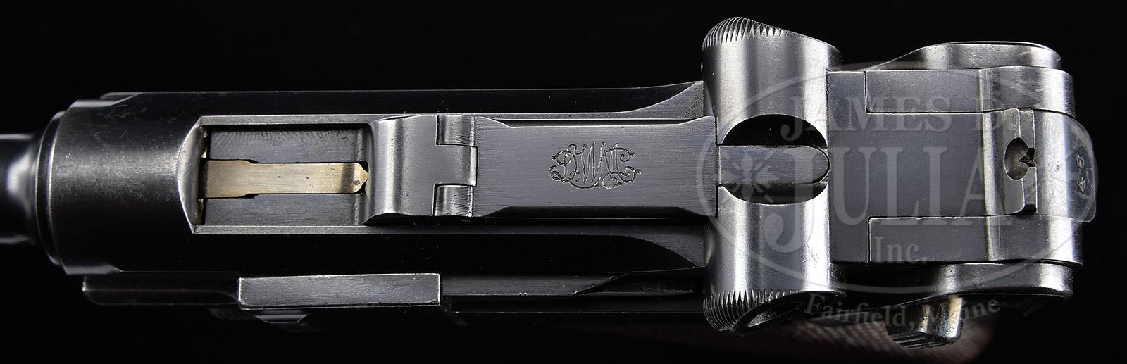 *◊ IMPORTANT DWM DUTCH TRIALS PROTOTYPE LUGER SERIAL NUMBER 10046B.SN 10046B. 4″ 7.65 mm Cal bbl of the distinctive prototype light military pattern with ramped foresight. DWM scroll on center toggle link. Dished toggles with toggle latch. Unmarked safety area. Grip safety. Unnumbered wood bottom magazine. All numbered parts are matching down to the checkered walnut grips. This is possibly the first surviving short frame prototype, which was converted from a long frame and is mechanically identical to the Dutch 1904 trials pistols, of which it is probably the internal factory prototype. This gun is featured on pp. 99, 101, 223, 225, 229 and 264 of The Borchardt & Luger Automatic Pistols by Joachim Gortz & Dr. Geoffrey Sturgess. PROVENANCE: Collection of Dr. Geoffrey Sturgess. CONDITION: Excellent. Retaining about 90% blue with silvering on sharp edges. Scattered scratches and fading on grip straps. Retains about 70% straw, some having been reheated. Bore is bright with light wear. Dark grips show some wood grain and have some dings and chips in the checkering. Magazine is excellent with very little wear. Mechanics are excellent. 43475-497 BWS8 (12,000-20,000) – Lot 3571