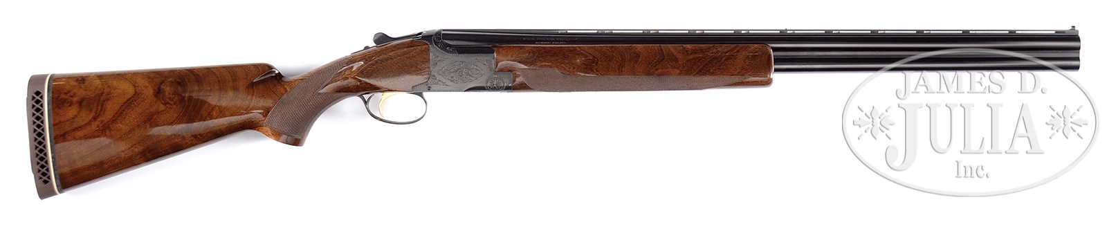*BROWNING SUPERPOSED LIGHTNING GRADE ONE OVER/UNDER SKEET SHOTGUN.SN 21543S73. Cal. 12 ga. 26-1/2″ vent rib bbl with white Bradley front sight and white mid bead. Fixed SKEET & SKEET chokes. 2-3/4″ chambers. Blued action with grade one scroll engraving. Gold plated single selective trigger and auto ejectors. Target forearm with flat knob long tang of checkered walnut. LOP: 14-3/8″ over Browning ventilated skeet pad. 1973 Belgian manufacture. CONDITION: Near excellent. Retaining nearly all of its orig blue. Orig stock finish shows a few small marks with area of mildew spotting near toe. Very good bright bores. 50610-5 DS (1,500-2,500) – Lot 3571