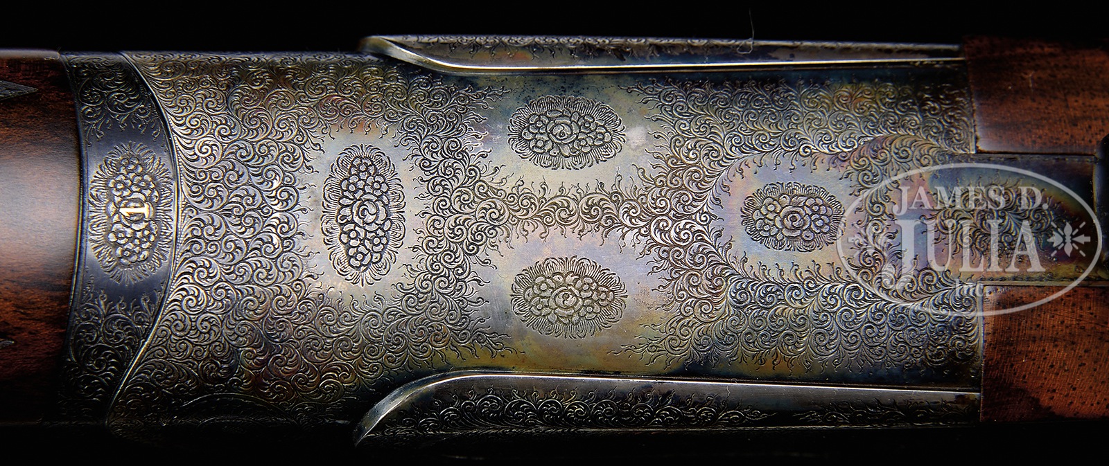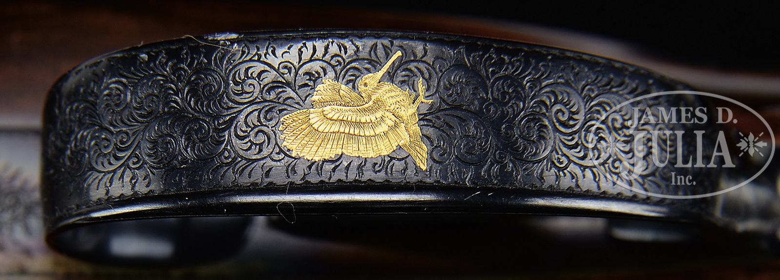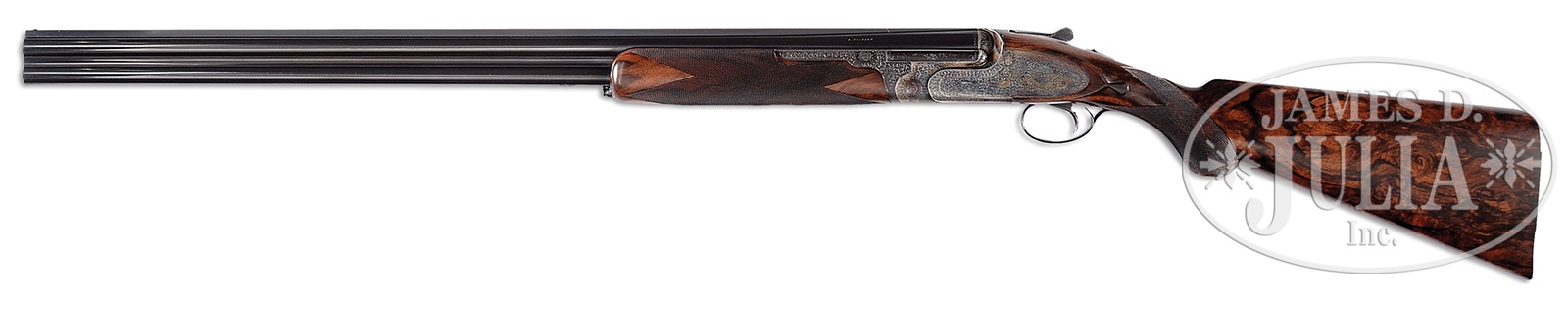 Please Note: Great News!! Current replacement cost on this model is north of $75,000.00 and a one to two year wait; very rare to find one in a 16 bore with these options. *EXCEPTIONALLY FINE A. GALAZAN OVER-UNDER, ROUND BODIED, PINLESS SIDELOCK EJECTOR, SINGLE TRIGGER GAME GUN.SN G201. Cal. 16 ga. 2-3/4″ Chambers. This fine hand made gun incorporating Tony Galazan’s ingenious adaptation of the vaunted Boss OU, features 29-1/2″ demi-bloc bbls, with slightly raised, matted, solid rib marked “A. GALAZAN” on left side of top bbl, and “CONNECTICUT SHOTGUN MFG. CO.” and “N. B. CT U.S.A.” on right. Bbl flat is engraved with SN, gauge, chamber length, and “1”. Gun is one of a pair with the “1′ inlaid in gold at rear portion of rib, on top lever pivot, and on bottom exterior of forend iron. Round bodied, case hardened, low profile, OU action is fitted with pinless sidelocks with hidden access flaps for lock removal at tops of each lockplate. Automatic safety has “S” inlaid in gold. Gun is fitted with single non-selective trigger. Action and lockplates are hand engraved in classic English style rose and scroll, mimicking Boss’s style, with 12 rose bouquets. “GALAZAN” is on scrolled terminated riband on each lockplate. Single beaded, blued trigger guard has well done flush gold inlaid woodcock surrounded by scroll on bow. SN is on tang. Wonderfully marbled and nicely burl figured European walnut round knob pistol grip buttstock measures 14-1/4″ over checkered wood butt with engraved steel heel and toe plates. Stock features classic drop points, borderless point pattern closely spaced checkering, and a vacant gold oval on knob of grip. Matching ejector forend has iron shaped to resemble Boss’s ejector housing, and Anson type release. Bore diameter: top -.661, bottom – .661. Bore restrictions: top – .019 (mod), bottom – .009 (IC). Drop at heel: 2-1/2″, drop at comb: 1-9/16″. Cast: Neutral. Weight: 7 lbs. 14 oz. LOP: 14-1/4″. CONDITION: Excellent. Bbls retain approx 95% orig blue, silvering at muzzles and along sides of rib, with a number of light marks. Action retains over 90% orig case hardening color, silvering on sharp edges and beads, thinning slightly on bottom from normal hand wear. Thumbpiece is slightly silvered, as are edges of trigger guard and left side of forend iron. There are a few minor marks in orig stock finish. Bores are excellent. Action is tight. Ejectors are strong and in time. Trigger works. A fine high quality American made gun designed to compete with the best shotguns made in the world today. 50741-1 MGM140 (30,000-50,000) – Lot 3575