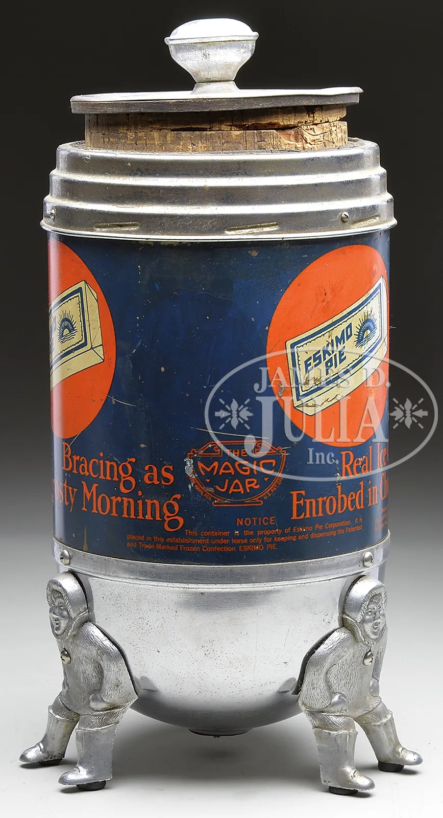 ESKIMO PIE STORE COUNTER TOP DISPENSER.This glass-lined, lithographed metal ice cream cooler is supported by three cast figural Eskimo feet. Manufactured for the Eskimo Pie Corporation, Louisville, KY by the Thermos Company of Norwich, CT. Includes original nickel plated lid with cork stopper marked “THERMOS”. Patent numbers date production to 1928. SIZE: 16″ h x 7-1/2″ dia. CONDITION: Good to very good; one of the figural feet is cracked at the neckline; rubber gasket inside the neck of the cooler has hardened and cracked with age; light wear to painted areas. 1-13742 (800-1,200) – Lot 3576 Auction: Advertising, Toy & Doll - Spring 2014 Please Note: All prices include the hammer price plus the buyer’s premium, which is paid by the buyer as part of the purchase price. The prices noted here after the auction are considered unofficial and do not become official until after the 46th day. |