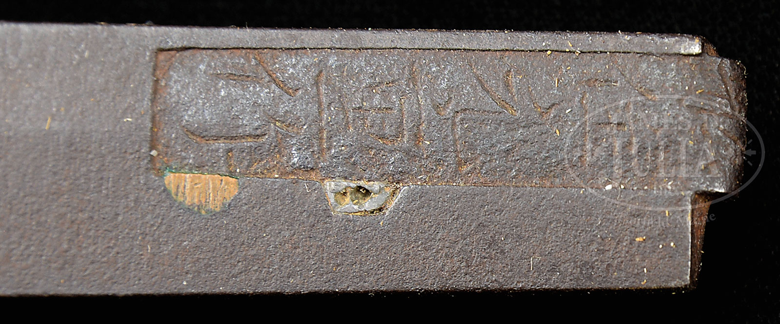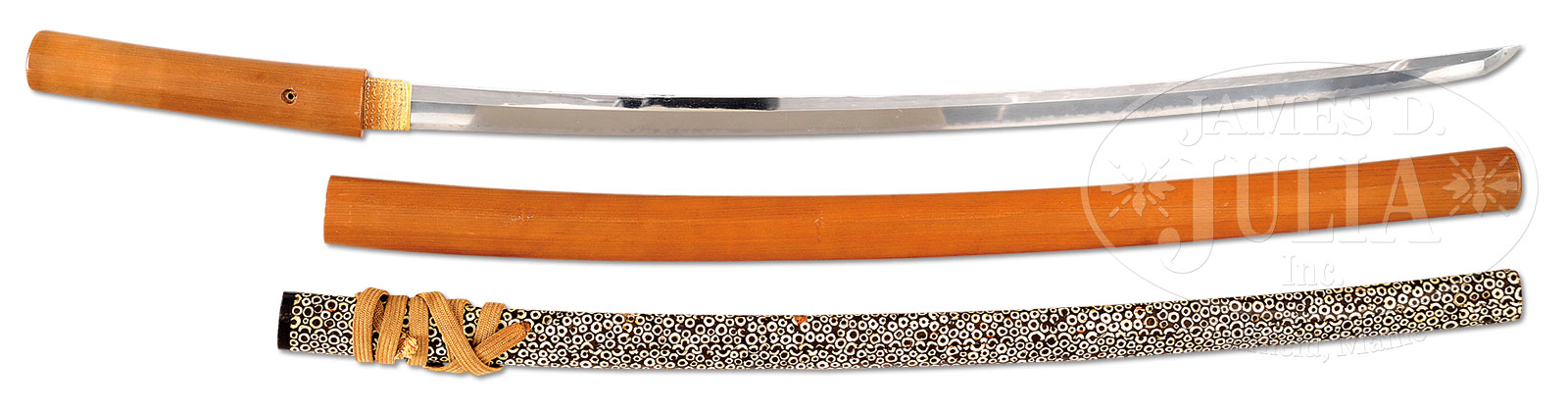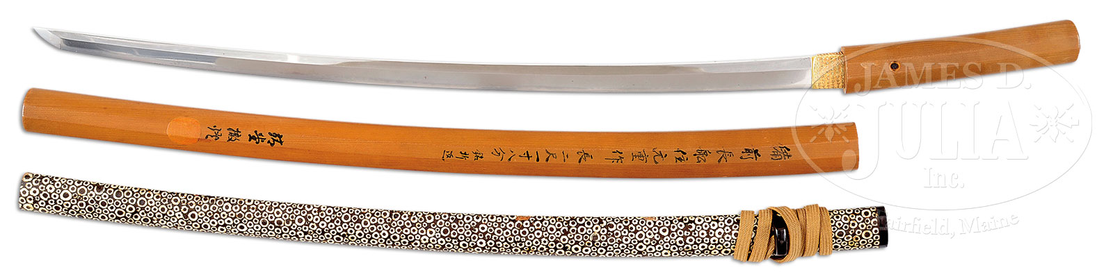 Signed “BIZEN OSAFUNE MOTOSHIGE SAKU” Oriikoshi mei (folded over signature) with origami (certificate of appraisal) by the well known famous appraiser of the early 20th Century, Fukushima Seido. Of the existing swords by MOTOSHIGE very few are signed, most are attributed. He lived and worked in the village of Osafune (now Okayama) & he worked early to mid 14th Century. Tempering and point are typical of his work, possibly re tempered. Translation of envelope: “FUKASHIMA SEIDO, SENSEI SHINTEI”. Translation of paper: BIZEN OSAFUNE MOTOSHIGE SAKU – MEI (signature) BIZEN OSAFUNE MOTOSHIGE SAKU – JIDAI JOJI KORO (about mid 14th century) – NAGASA (length) NI SHAKU ICHI SUN HACHI BU (about 65 cm or 26-1/16 length) – ORIKOSHI MEI (folded over and inlaid signature) – SHINOGI ZUKURI (ridge blade) KOGISAKI (small point) – YAKIBA (temper pattern) KOGUNOME (small rounded bead pattern) JIAETSU SEIHI NISHITE – NIOI SHIMARI BOSHI (temper pattern in the point) TOGARITE NOBITE AGARI – SUKOSHI MARUKUKDERU KONO OSHI NI KOMOSAKUNO – TOKUCHO ARA WARU – SHOWA ROKU NEN GO GATSU ( date of paper May 1931). – SAIDO (name with seal). REFERENCE: Fujishiro kotohen page 559, rating JO JO saku, old Hawley’s first edition MO 639 rating 100 BKS 300. CONDITION: Blade in very good old polish in old shirasaya (resting case) with purple bag along with its original saya (scabbard). With excellent worked gold foil habaki (collar). 52387-1 (10,000-15,000) – Lot 3578