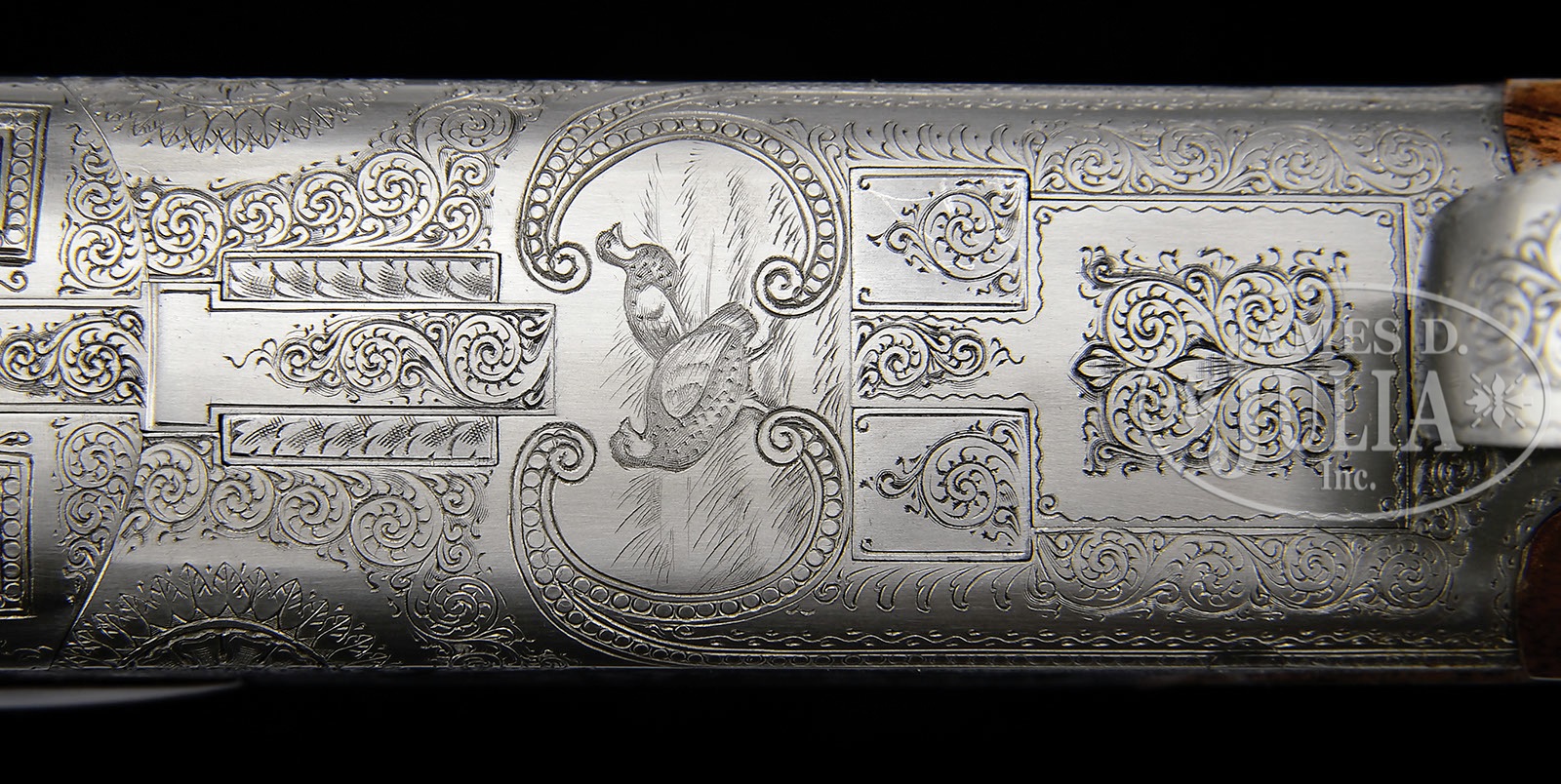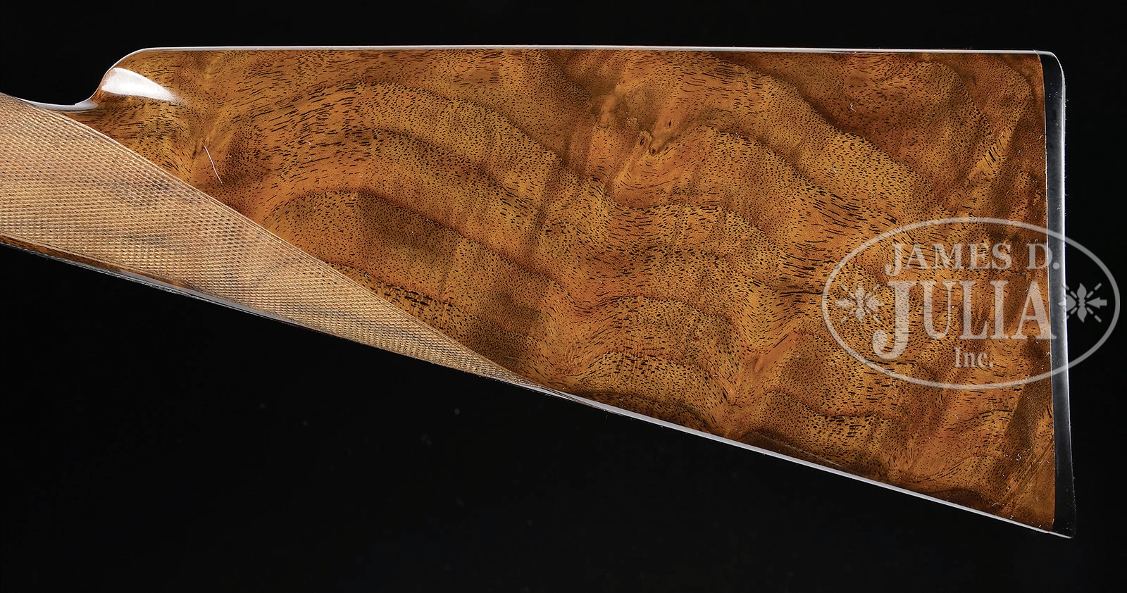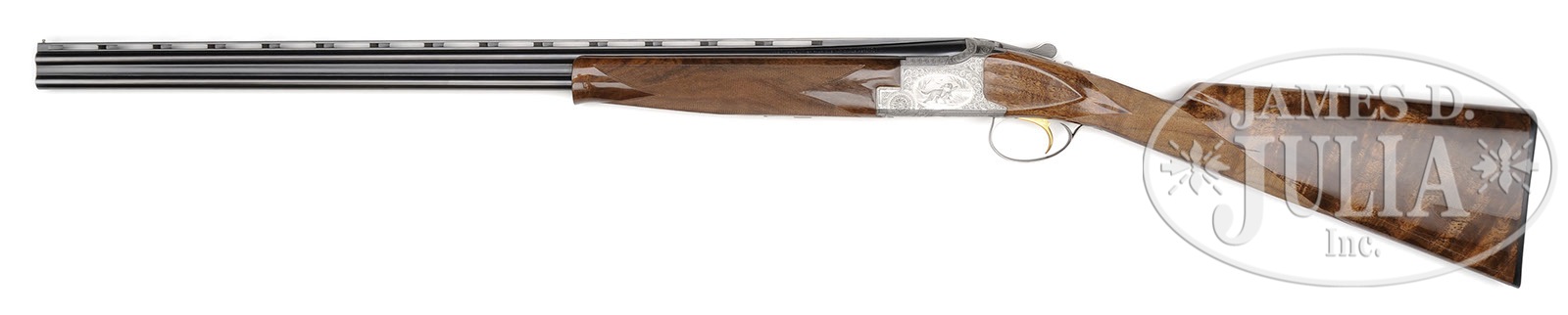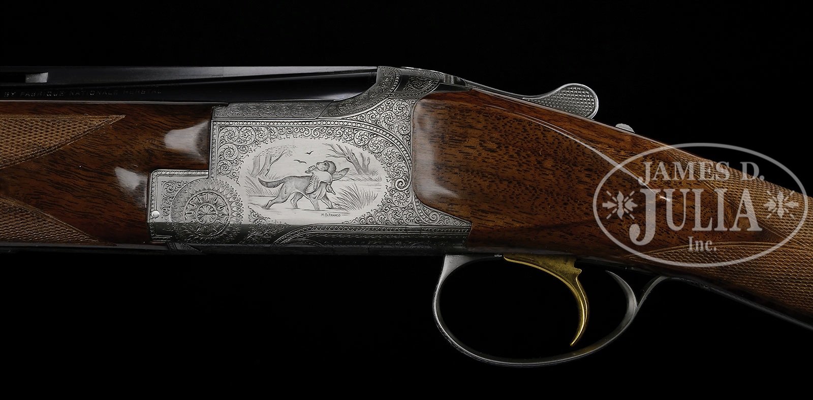 *RARE .410 BROWNING SUPERPOSED SUPERLIGHT POINTER GRADE ENGRAVED BY M. DIFRANCO.SN 457J83. Cal. .410. 3″ Chambers. 28″ Bbls with ventilated rib are choked modified and full, and are marked with usual Browning Arms addresses and information on top bbl along with “MADE IN BELGIUM”. Typical gray finished action is engraved with small shaded scroll with beaded borders framing vignettes of dogs retrieving birds; a Labrador has mallard on left, and a pointer is retrieving a pheasant on right. Bottom of action depicts a pair of grouse, and a pair of pheasant, one resting, the other flushing, on trigger guard bow. Engraver’s signature, M. DiFranco, is at lower right of left hand scene. Broadly flame figured claro walnut straight grip buttstock measures 14-1/4″ over Browning composition buttplate. Modified point pattern checkering is at grip. Schnabeled superlight forend matches buttstock well. Drop at heel: 2-1/16″, drop at comb: 1-5/16″. Weight: 6 lbs. 5 oz. LOP: 14-1/4″. PROVENANCE: Factory letter indicating that it was shipped January 4, 1984. Letter from Jaqua’s Fine Guns indicating that this is one of the “final series of all Belgian .410’s.” and consignor states that it “originated from Robert Peterson Museum”. CONDITION: Excellent, essentially as new, appears unfired except for proof, with only the slightest hint of assembly mark on bottom bbl, and some light rubs and a couple of marks in gloss finish of stock. Mechanically crisp. 4-51909 MGM189 (15,000-25,000) – Lot 3579
