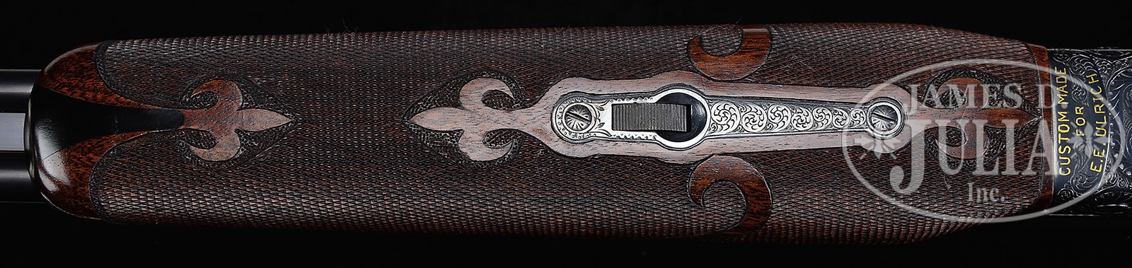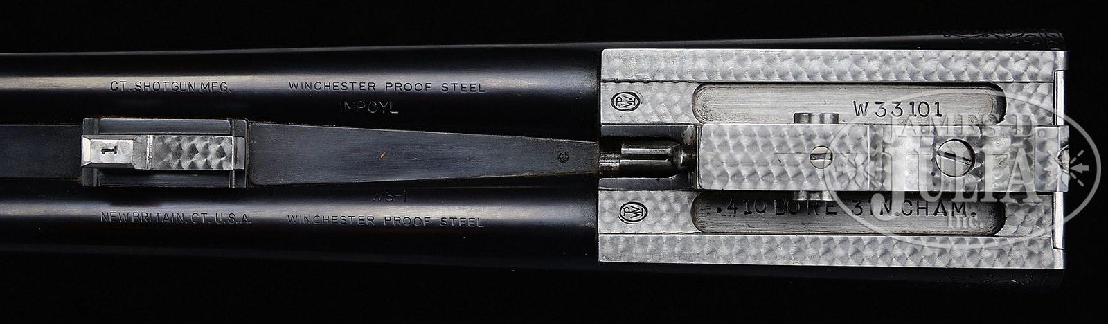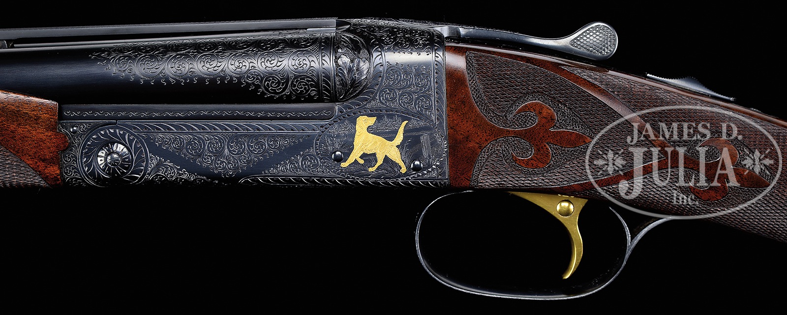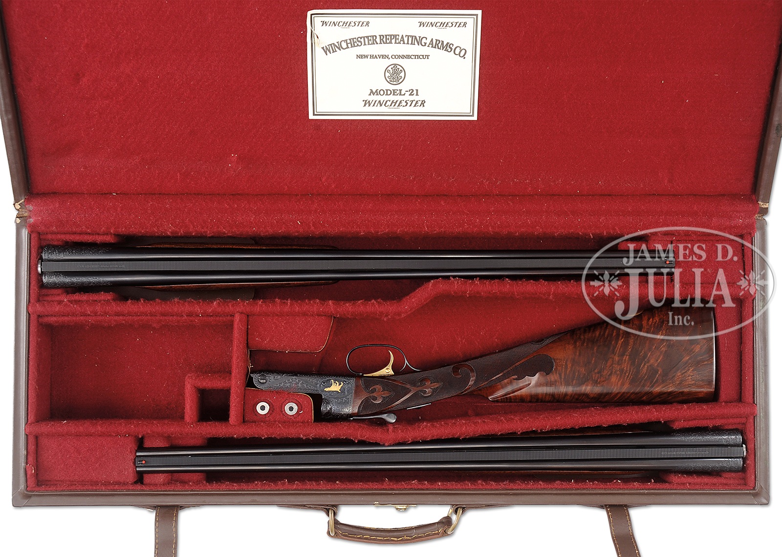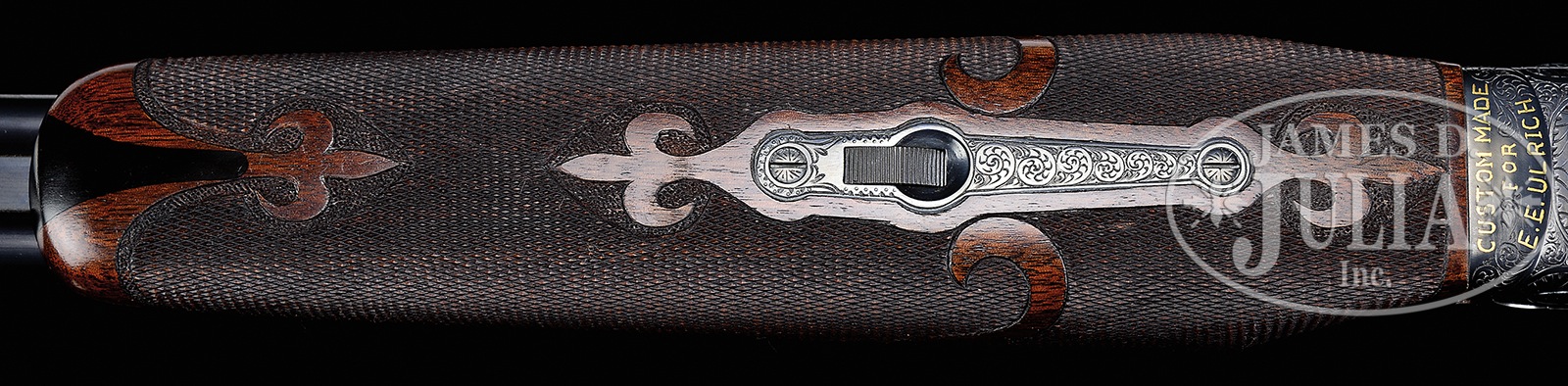 *CULMINATION OF A DREAM. RARE .410 WINCHESTER MODEL 21 “GRAND AMERICAN” WITH EXTRA BARRELS AND SPECIAL ENGRAVING, AS THE FINAL GUN OF A SET CONCEIVED BY ED ULRICH MANY YEARS AGO.SN W33101. Cal. 410. 3″ Chambers. Well known Model 21 specialist and author, Ed Ulrich, conceived the idea of putting together a special set of “Grand American’s”. (I should probably continue in Ed’s own words as written in his article “The Winchester Model 21 Grand American” as appeared in the Double Gun Journal Autumn 1999) “This set is featured in Ned Schwing’s book WINCHESTER’S FINEST, THE MODEL 21, I decided back in the mid seventies to order a “Grand American”. A lot of thought went into this project as I wanted something very special and outstanding compared to anything that had been done previously by Winchester.” He goes on to list Winchester employees, including Nick Kusmit, that had an influence on his final decision. “With the input I received from these men I decided to build a three gauge set of “Grand Americans” in twelve gauge, sixteen gauge, and twenty gauge, with consecutive serial numbers. This would be the first such set ever built. I also planned to add a .410 gauge and a 28 gauge “Grand American” at a later date which would make it a five gauge set.” He goes on to describe making engraving changes from the usual, and selecting wood, etc. He further states that Nick Kusmit did the engraving, and John Dirkin did the “B” carving. He also states “When I took delivery I was told that it was the highest priced gun ever sold in the history of Winchester.” With regard to this particular gun, in a letter dated May 8, 2008, Ed says “In regard to Winchester Model 21’s, specifically SNs W33100 and W33101, which were built in the 1980’s, both Model 21’s were originally conceived to be part of a Model 21 – 5 gauge set, consisting of 12, 16, 20, 28, and .410 gauges. However, at the time that I had the 12, 16, and 20 gauges made, Winchester could not build the 28 – 410 gauge for me. The reason being, that I had insisted on consecutive serial numbers to follow the 12, 16, and 20 numbers. Consequently the project was put on hold. … A couple of years later, Winchester was able to provide me with consecutive serial numbers 33100 and 33101, but not in sequence with the 3 – gauge set. So, I continued the project with help from both Winchester and Connecticut Shotgun Manufacturing Company. I was also fortunate enough to have Nick Kusmit, Winchester master engraver, retired, do the same pattern, as was on the original M21 – 3 gauge set. The woodwork was done by John Dirkin, Winchester master wood carver, retired.” This gun, typical of all “Grand Americans” has two sets of bbls. 26″ Bbls are marked “Skeet” and “IC” and 27″ bbls marked “Mod” and “full”, each with raised, ventilated ribs marked “CUSTOM BUILT BY WINCHESTER”. There are 3″ triangles of scroll at breech ends. Engine turned bbl flats are stamped with Winchester proofs, and are marked with SNs, gauge, and chambers in milled out lightening cuts. Bottoms of bbls are stamped “WINCHESTER PROOF STEEL” along with choke markings, as well as, “CT. SHOTGUN MFG.” “NEW BRITAIN, CT. USA”. Each bbl set has its own beavertail ejector forend with either “1” or “2” stamped on front interior of irons and on loops. Blued flat side Model 21 action has water table stamped with Winchester proof and considerable milling for lightening. Action features usual automatic safety and single selective gold-plated trigger. Action is engraved in Model 21 “Grand American” style with near full coverage varying sized scroll with fences carved in acorns and oak leaves. Specially selected gold inlays picture a setter looking back over its shoulder as it crosses a fence line on left side of action, and a pointing pointer on right. Trigger plate has unusual, and unique to this set, scene of bald eagle with captured salmon in its talons rising from a lake with mountains in background. Trigger guard bow has gold inlaid portrait of a spaniel. Superb feather/ flame crotch figured American walnut straight grip buttstock measures 14-1/4″ over checkered wood butt, and is carved in 21-B style with many fleur-di-lis and ribbons through pattern. Matching braced beavertail forends with inset ebony tips and engine turned internals, are gold inlaid on bottoms of irons “CUSTOM MADE” “FOR” “E. E. ULRICH”. 26″ BBL set “1”: Bore diameter at muzzles: left -.404, right – .425. Drop at heel: 2-7/16″, drop at comb: 1-1/2″. Cast: neutral. Weight: 6 lbs. 15 oz. LOP: 14-1/4″. 27″ BBL set “2”: Weight: 7 lbs. 0 oz. LOP: 14-1/4″. Brown leather case with leather corners is lined in burgundy felt, and has paper Winchester 21 label in lid. Case contains a pair of snap caps. PROVENANCE: DGJ with article, letter from Ed Ulrich, various other paperwork including some concerning Model 21’s and/or Ed Ulrich. Copy of Final inspection report for this SN. CONDITION: Excellent, close to new, appears unfired, with only a few handling and assembly marks in all fine factory finishes, most notably some marks on buttstock which have been toned down. Mechanically crisp. Case leather has a considerable number of minor marks and a rather large scuff on top. Straps and handle are good. Interior is very fine, lightly soiled and rubbed. Some blocks are loose. Label has a rub-through. 51033-5 MGM318 (40,000-80,000) – Lot 3579 Click here to view provenance