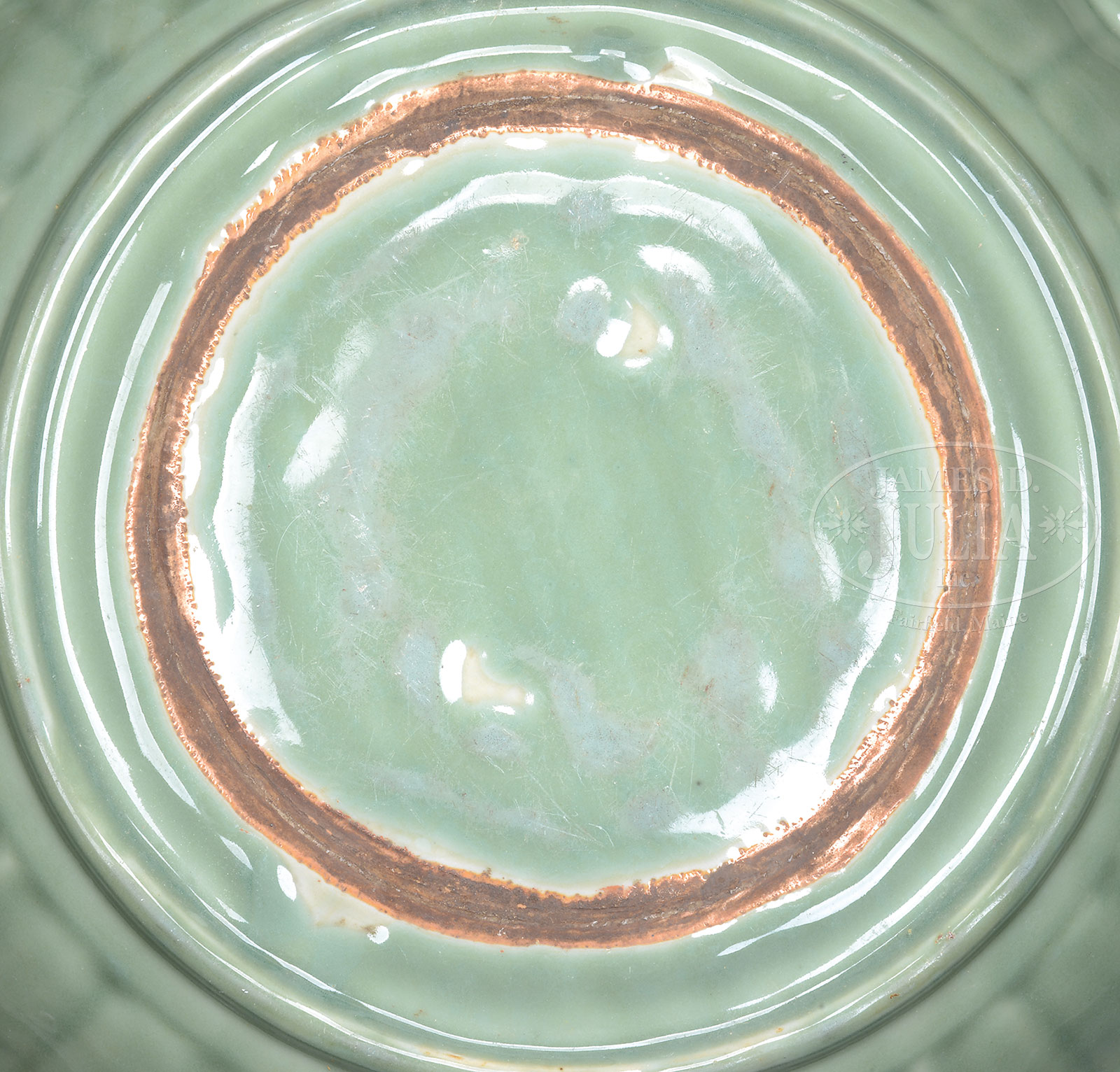 LARGE CELADON GLAZED CHARGER.China. The large strongly potted charger molded with numerous flutes encircling the center surrounded with a foliate shaped rim. SIZE: 18-1/2″ dia. PROVENANCE: The Webster Family Trust descended from the Rockefeller/Dodge Family. CONDITION: Stains to the interior. 51508-7 (800-1,200) – Lot 3580