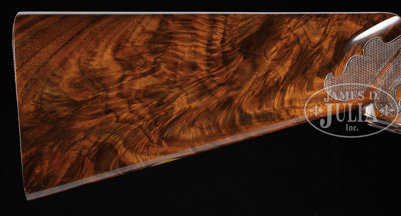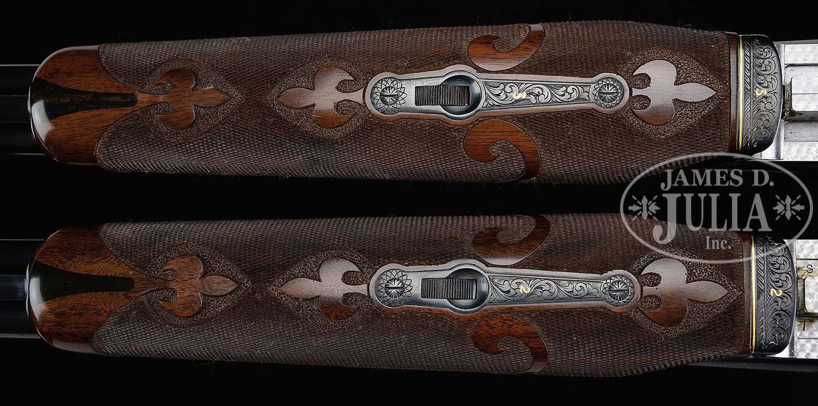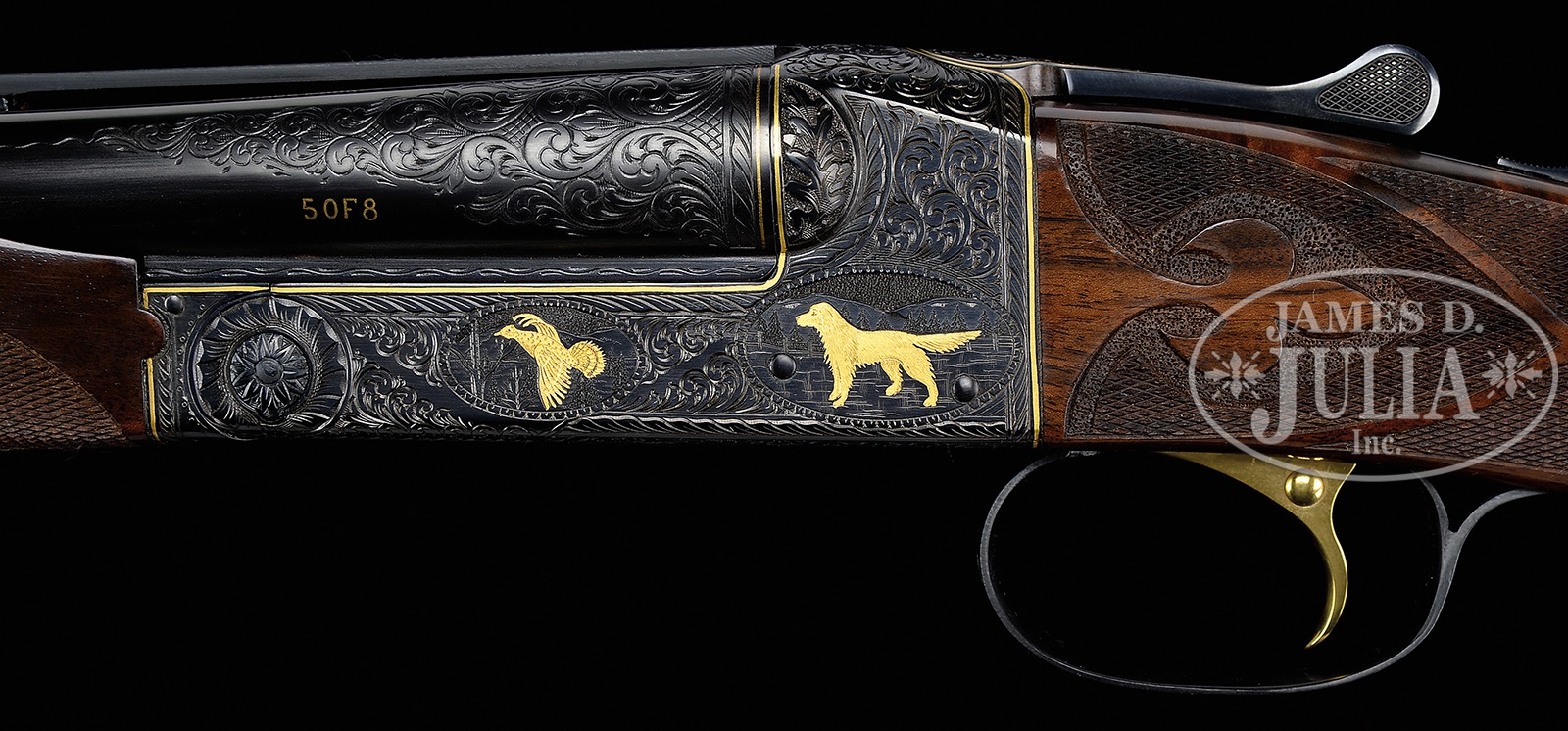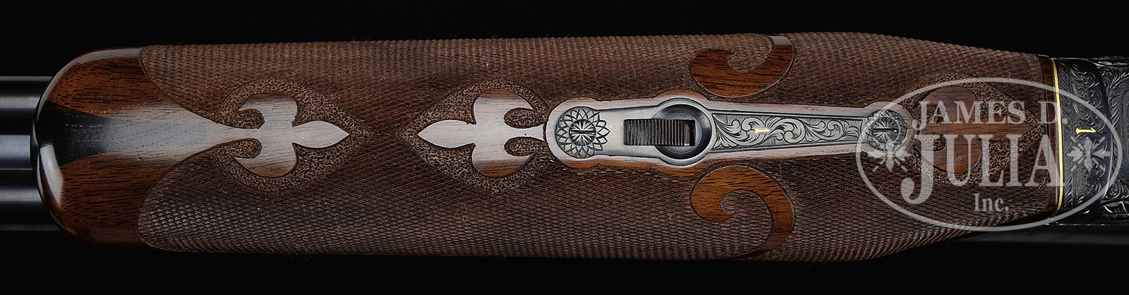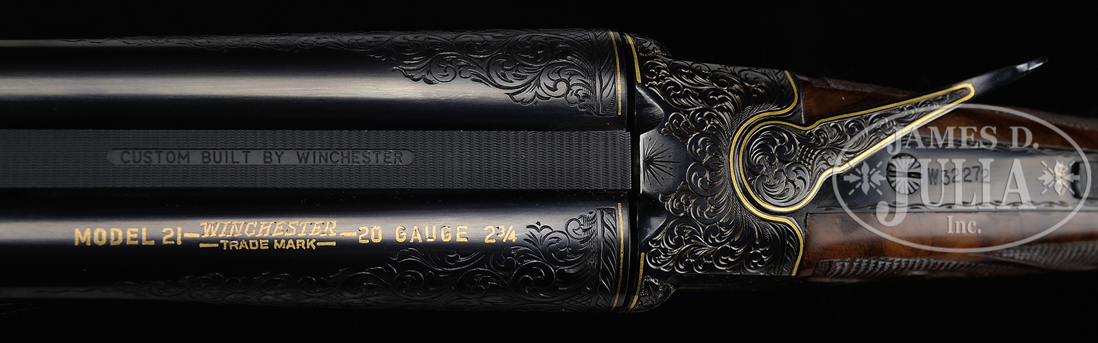*NUMBER “FIVE OF EIGHT” WINCHESTER MODEL 21 “GRAND AMERICAN SUPER” SMALL GAUGE THREE BARREL SET WITH CASE.SN W32272. Cal. 20 ga. and 28 ga have 2-3/4″ Chambers, and .410 ga has 3″ chambers. All bbl sets are 26″ and fitted with raised, matted, ventilated ribs marked “CUSTOM BUILT BY WINCHESTER”. All are marked for skeet and skeet. There are 4″ triangles of varying sized scroll and gold bands at breech ends which are also gold inlaid “5 of 8”. Tops of bbls are also gold inlaid with model, Winchester trademark, gauge, and chamber length. Engine turned bbl flats are stamped with matching numbers and Winchester proofs. Each set has its own forend, and bbls are stamped “1”, “2”, and “3” on loops and front portions of forend irons, and gold inlaid on bottoms of forend irons. .410 Bbls have milled out lightening cuts on flats. Blued flat side action with lightened water table features automatic safety and gold-plated sgl selective trigger. Action, most likely by Nick Kusmit, is engraved in special “21-6” style with seven extra gold inlays and borders. Fences are carved with oak leaves and acorns. Remainder of action has 80% coverage of scroll within geometric borders, in usual “Grand American” style, gold inlays include a setter on left side rear, with grouse toward front, and a pointing pointer on right with another grouse flushing toward front. Bottom of action depicts classic Winchester rider in circular central vignette and flushing woodcock toward front. Trigger guard bow has a gold portrait of a dog. All within gold wire inlaid borders. Exceptional exhibition feather crotch figured American walnut capped pistol grip buttstock measures 14-5/8″ over checkered wood butt. Steel grip cap with gold line border is also inlaid “1 of 8”. Stock and all matching beavertail forends are carved in “21-B” style. BBL set “1” 20 ga.: Bore diameter: left -.618, right -.617. Bore restrictions: left -.007 (skeet), right -.004 (skeet). Drop at heel: 2-1/8″, drop at comb: 1-3/4″. Weight: 7 lbs 3 oz. LOP: 14-5/8″. BBL set “2” 28 ga.: Bore diameter: left -.549, right -.550. Bore restrictions: left -.006 (skeet), right -.006 (skeet). Drop at heel: 2-1/16″, drop at comb: 1-3/4″. Weight: 7 lbs 2 oz. LOP: 14-5/8″. BBL set “3” .410 ga.: Bore diameter at muzzles: left -.402, right -.420. Bore restrictions: left – (skeet), right – (skeet). Drop at heel: 2-1/8″, drop at comb: 1-3/4″. Weight: 7 lbs 9 oz. LOP: 14-5/8″. Oak and leather case by Huey (no. 336) with stitched leather corners has green canvas outer cover with leather trim, and is lined in purple suede, with gold embossed black leather WRA Model 21 label in lid. Bottom section has wood topped dividers for action and all three sets of bbls, and contains gold-plated Winchester marked snap caps for each gauge, gold plated oil bottle, and 2-pc rosewood and brass cleaning rod. PROVENANCE: Factory specification sheet listing options and all extras included with these special sets. Appraisal. CONDITION: Excellent, essentially as new, appears unfired. with only a few of the faintest of handling and assembly marks in all fine factory finishes, most notably some case rubs on buttstock. Mechanically crisp. Case is excellent. 51033-7 MGM320 (60,000-100,000) – Lot 3581 Click here to view provenance