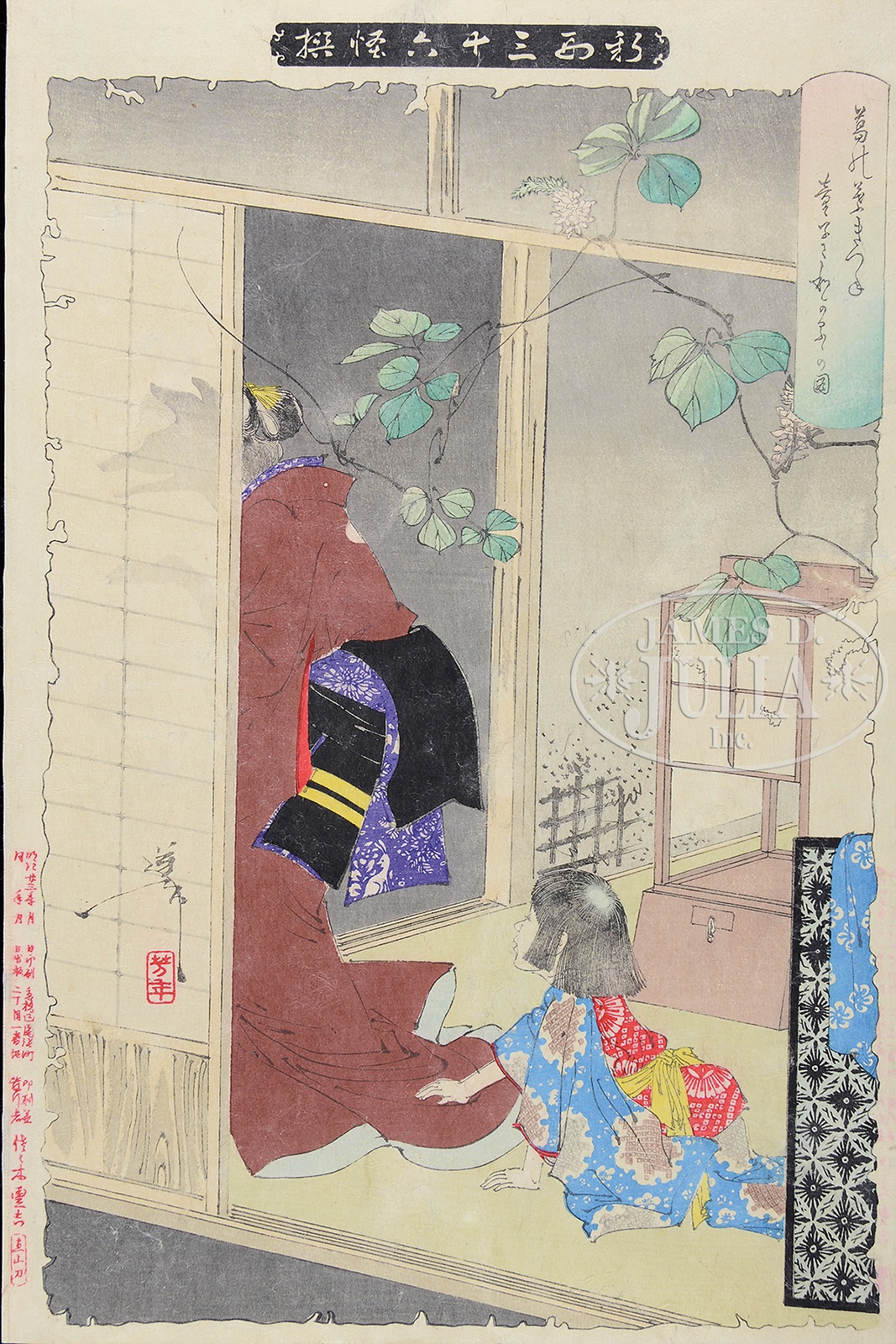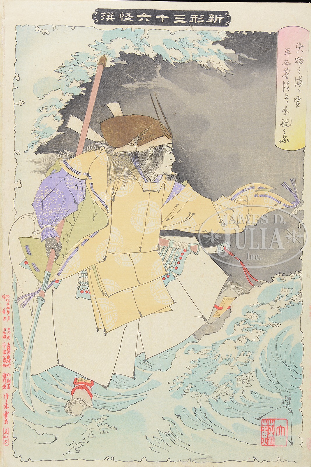 SIX WOODBLOCK JAPANESE PRINTS FROM YOSHITOSHI FROM THE SERIES “NEW FORMS OF 36 GHOSTS”.Late 19th century. Titles “Ghosts of Taira”, “Foxwoman”, “Takeda Killing Badger”, “Good Woman’s Spirit”, “The Lady Of Hell”, and “The Heavy Basket”. SIZE: ōban tate-e. Block size 14-1/2″ x 9-1/2″, 36.83cm x 24.13cm. PROVENANCE: From a Maine collection, purchased from Fuji Arts. CONDITION: Some staining. 9-96011, 9-96012, 9-96013, 9-96014, 9-96016, 9-96018 (2,000-3,000) – Lot 3582