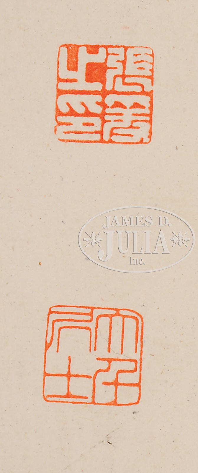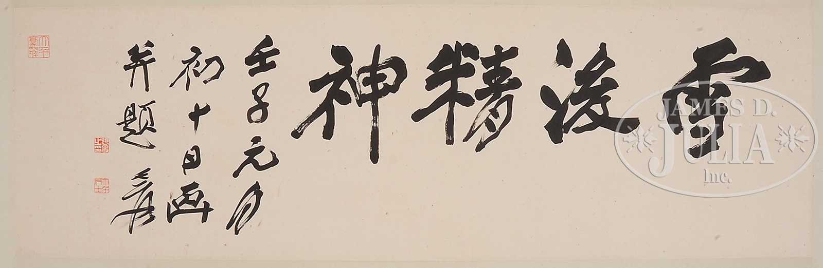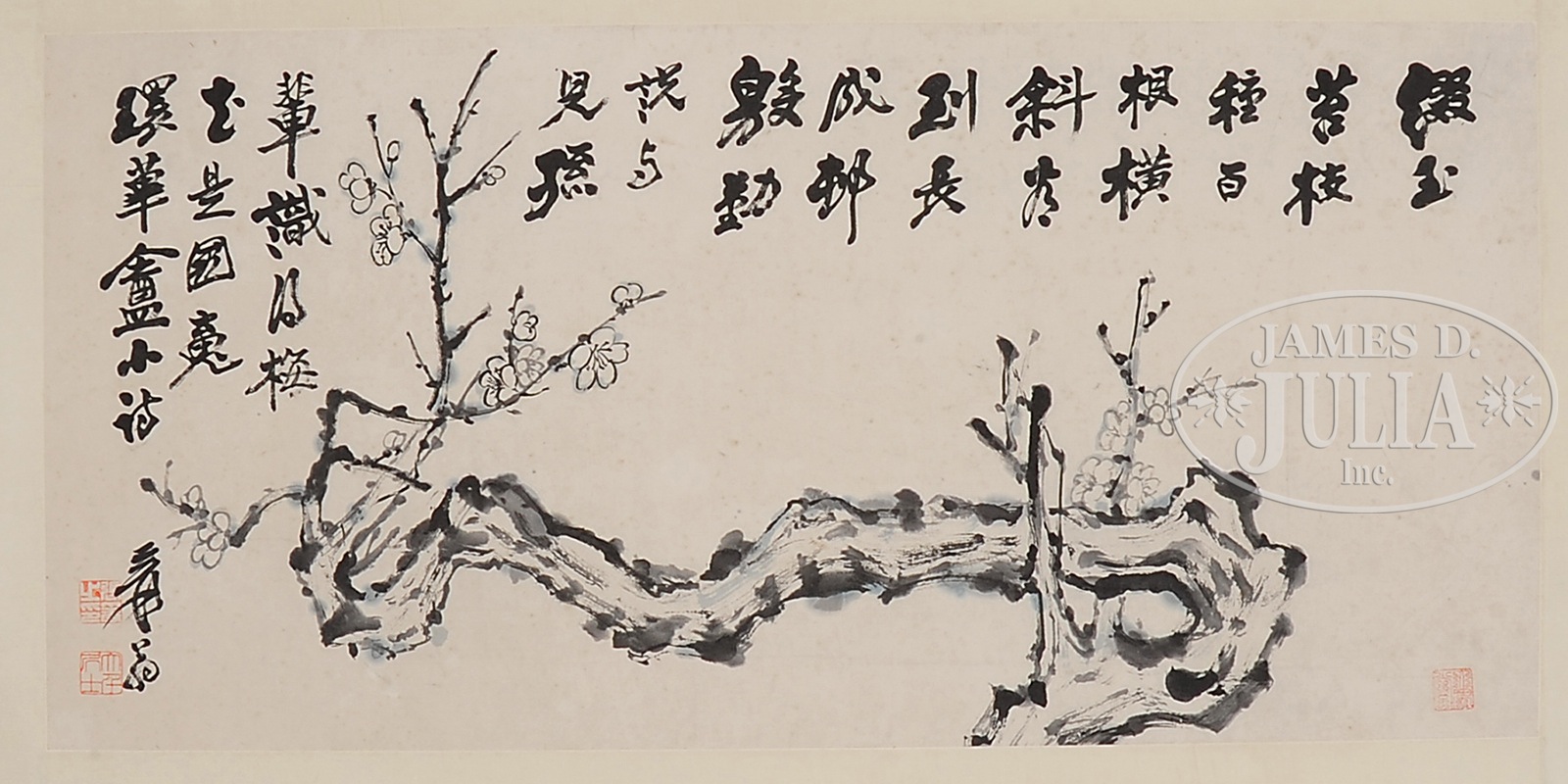 HANDSCROLL IN THE MANNER OF ZHANG DAQIAN.China, ink and light color on paper, depicting plum blossoms; frontispiece inscribed with “Xue Hou Jing Shen,” dated renzi year, signed “Yuan,” with seals; accompanied by lengthy colophon. SIZE: 13” x 17 ¼”, 13” x 41 ½”, 13” x 178” CONDITION: Good condition. 9-91450 (700-900) – Lot 3583