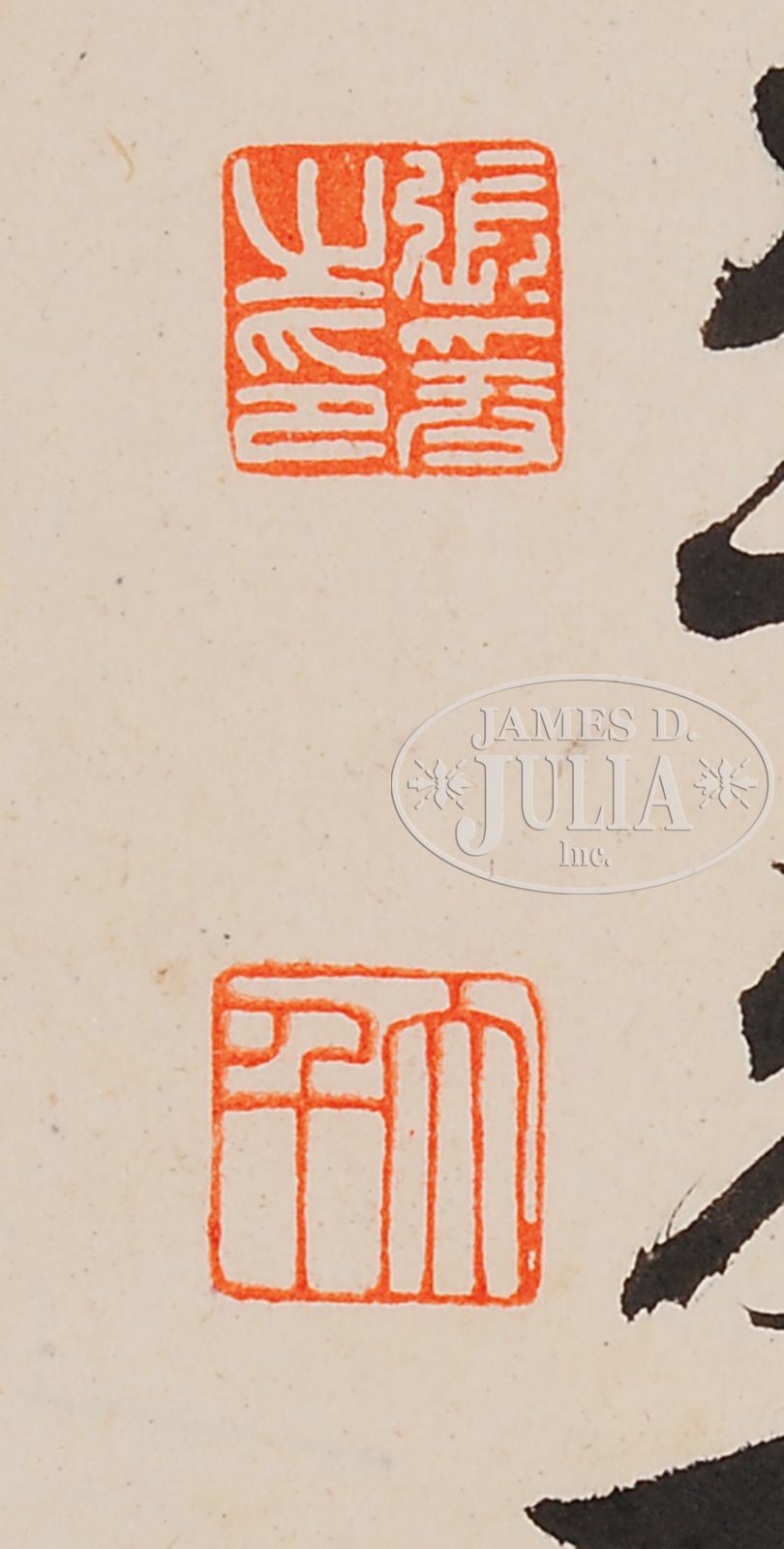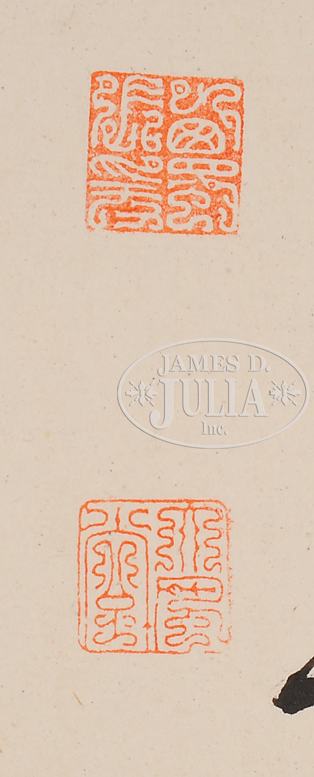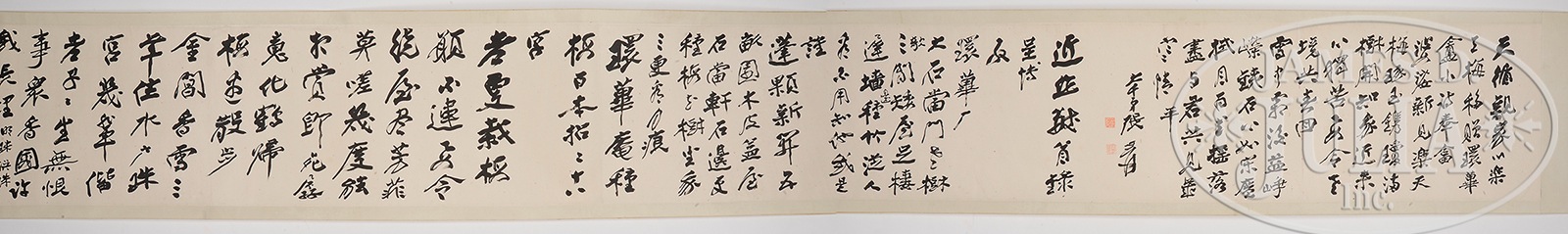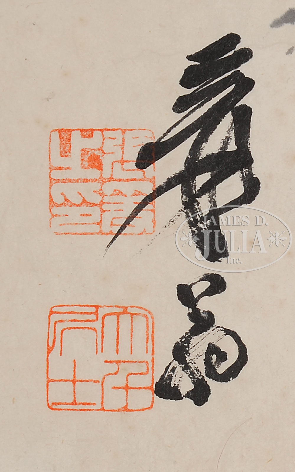 HANDSCROLL IN THE MANNER OF ZHANG DAQIAN.China, ink and light color on paper, depicting plum blossoms; frontispiece inscribed with “Xue Hou Jing Shen,” dated renzi year, signed “Yuan,” with seals; accompanied by lengthy colophon. SIZE: 13” x 17 ¼”, 13” x 41 ½”, 13” x 178” CONDITION: Good condition. 9-91450 (700-900) – Lot 3583