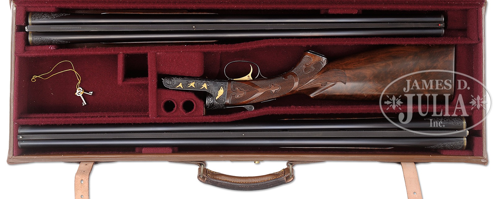 *FINE HIGH QUALITY CUSTOM WINCHESTER MODEL 21 WITH EXCELLENT ENGRAVING AND GOLD INLAY BY ARNOLD GRIEBEL (?) WITH EXTRA BARRELS AND CASE.SN 27801. Cal. 12 ga. 28″ Marked “Skeet 1” and “Skeet 2″, and 30” bbls marked “mod” and “full”. Bbls are fitted with raised, ventilated ribs marked “CUSTOM BUILT BY WINCHESTER” in milled out portions. There are 2-3/4″ triangles of large scrolling open acanthus and two gold bands at breech ends. Engine turned bbl flats are stamped with SNs, proofs, gauge, and chamber information. Flat side blued action features non-automatic safety and gold-plated selective single trigger. Action is engraved with near full coverage large open scrolling acanthus matching that on bbls, surrounding well done relief gold inlaid game scenes; setter and pointer pointing a trio of pheasant on left, and a fox approaching a trio of quacking mallards flushing from marsh, on right. Bottom of action has oval vignette of California condor flying past cliffs. A ruffed grouse flies across trigger guard bow. Fences are nicely carved in foliate motif. (Consignor states engraving is by Arnold Griebel, however no signature is found. This is not unusual, as Mr. Griebel did not sign much of his work, but the quality of the work on this fine gun could certainly have been by him.) Nicely crotch figured American walnut steel capped pistol grip buttstock measures 14″ over checkered wood butt, and is carved in 21-B style. Each bbl set is accompanied by its own dedicated braced beavertail ejector forend, marked “1” or “2”. BBL set “1” 28″: Bore diameter: left -.728, right – .728. Bore restrictions: left – .012 (mod), right – .009 (IC). Drop at heel: 2-1/2″, drop at comb: 1-9/16″. Cast: neutral. Weight: 7 lbs. 12 oz. LOP: 14″. BBL SET “2” 30″: Bore diameter: left -.729, right – .729. Bore restrictions: left – .034 (full), right – .014 (mod). Drop at heel: 2-7/16″, drop at comb: 1-9/16″. Cast: neutral. Weight: 7 lbs. 15 oz. LOP: 14″. Leather case by Abercrombie & Fitch with stitched leather corners has tan canvas outer cover with leather trim. Interior is lined in burgundy cloth. PROVENANCE: Cody Firearms Records Office information confirming both sets of bbls and pistol grip stock with pad, and 21-B carving, with inspection finished August 14, 1953. CONDITION: Excellent, retaining nearly all of its custom finishes on wood and metal, with a number of light crazes and scratches on stocks. Checkering is lightly worn. Mechanically excellent. Case is excellent, as protected by its outer cover which is good. Interior is fine. 51058-4 MGM264 (12,500-17,500) C&R – Lot 3583 Click here to view provenance