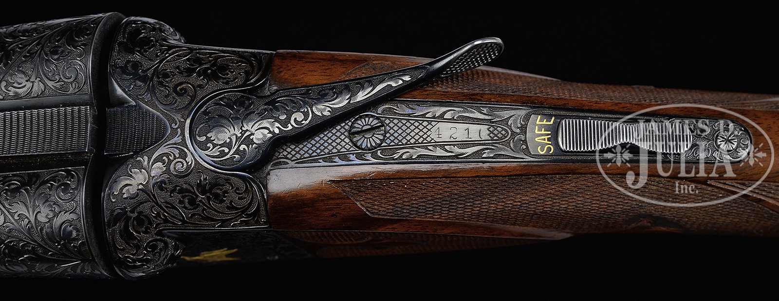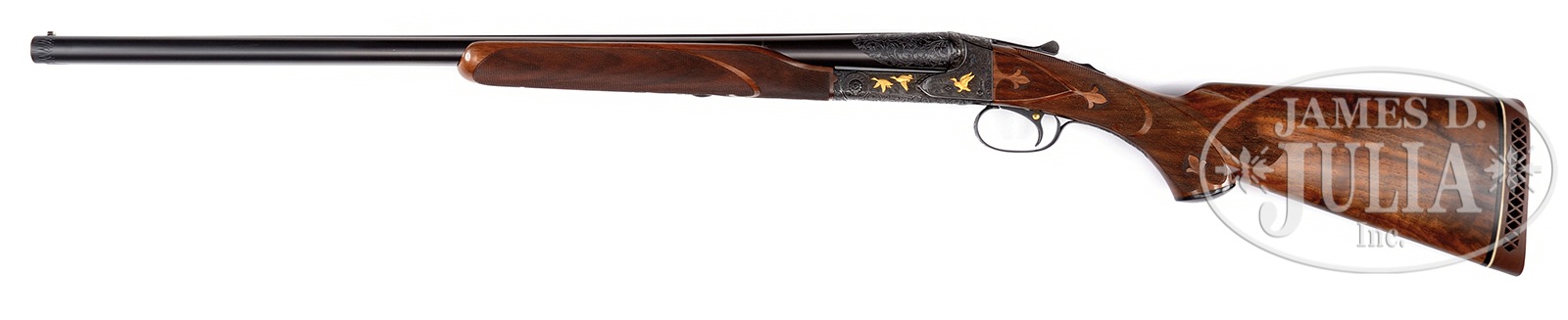 *FINE WINCHESTER CUSTOM MODEL 21 FOUR BARREL SET BY PAUL JAEGER WITH EXTRA STOCKS AND CASE.SN 4210. Cal. 12 ga. This interesting, high quality, custom set, features four pairs of 26″ bbls choked skeet and skeet, IC and mod, mod and mod, and full and full. Each bbl set has narrow, matted ribs and 2-3/4″ areas of exceptionally well cut open shaded scrolling acanthus at breech ends. Each bbl set is stamped with SN on flats and is marked with chokes and “WINCHESTER PROOF STEEL”. Each bbl has ivory bead sights. Blued action with standard frame has patent and makers marks on water table. Action features non-automatic safety and blued, non-selective single trigger and is engraved with 100% coverage scrolling acanthus matching that on bbls, which surrounds exceptionally well rendered relief gold inlaid game scenes in nicely detailed backgrounds. A trio of mallards are in marsh on left side of action, and a pointer points a pair of rising pheasant on right. Trigger guard has more acanthus scroll. Nicely fiddle figured and smoky marbled European walnut horn capped pistol grip buttstock measures 14-1/4″ over open sided Pachmayr white line pad. Checkering is of 21-B style with fleur-di-lis and ribbons through pattern. Bbls are fitted with two different forends, one beavertail with brace, and another splinter type. Bbls appear to be choked as marked. Drop at heel: 2″, drop at comb: 1-7/16″. Weight with beavertail forend: 7 lbs. 2 oz. LOP: 14-1/4″. Old leather case with stitched leather corners is lined in purple cloth and has Winchester black leather label in lid. There is space for action and all four sets of bbls. Case contains A & F marked oil bottle and snap caps, as well as cleaning equipment. Also included is a straight grip buttstock with solid Winchester pad with trigger guard engraved en suite with remainder of gun, along with a large beavertail forend and another splinter forend, all with factory type standard checkering. PROVENANCE: Cody Firearms Records Office information confirming 26″ IC and Mod as well as full and full bbls (1945), straight grip stock, and beavertail forend with final inspection date of Dec 20 1934, with other dates listed, July 9, 1946 and Jan 10, 1950. And that it was made for Paul Young. Special Note: This item(s) contains plant or animal properties that may be covered by the Endangered Species Act (ESA). We have taken care to ensure that this item(s) meets the standard for sale under the ESA. However, certain states and other countries have laws that are more restrictive than the ESA. It is the bidder’s responsibility to ensure that it is lawful to purchase or transport this item(s) into their state, and to obtain the necessary import and export approvals. Delay or failure to obtain any such permit or approval does not relieve the buyer of paying for the item(s) and consummating the purchase. CONDITION: Excellent, as custom finished. Bbls retain nearly all of their re-blue with a few light marks. Action retains 85 – 90% of its blue, silvered from normal hand wear, on bottom and left side, with high edge wear elsewhere. Stocks retain nearly all of their finish with numerous scratches and marks. Checkering is lightly worn. Bores are excellent. Action is tight. Mechanically excellent. Case leather has considerably darkened and has many stains, marks and rubs. Interior cloth has compressions and rubs. Accessories are good. Spare stocks are excellent. A well done, useful set, with bbls, forends, and buttstocks for any application. 51058-5 MGM263 (12,500-17,500) C&R; IVORY – Lot 3584 Click here to view provenance