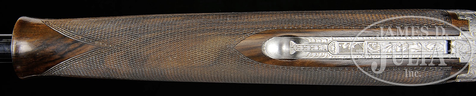 *28 GAUGE FN GRAND LUXE SUPERPOSED WITH EXHIBITION ENGRAVING BY J. H. DIET WITH BOX.SN 145F73. Cal. 28 ga. 28″ Bbls choked modified and full, with narrow, ventilated rib, are marked “FABRIQUE NATIONALE HERSTAL BELGIQUE” and with steel, gauge, and 2-3/4″ chambers on left side of top bbl. right side is marked “MADE IN BELGIUM – BROWNING PATENTS”. There are 2-1/2″ wedges of relief shaded scroll on breech ends. Coin finished superposed action with gold-plated selective trigger is engraved in nearly full coverage with exceptionally well cut, open, shaded, scrolled acanthus in semi-relief. This fine scroll outlines vignettes of gold inlaid game birds in well detailed settings; a pair of black grouse are battling in open meadow on left side of action, a pair of mallards spring from marsh on right. Bottom of action depicts a quail in open meadow. Monogram “J D” is on trigger guard bow. Engravers name “J. H. Diet. de SAROLAY” is on trigger plate. Dark, fiddle figured, and nicely marbled European walnut swan-necked buttstock measures 14-1/2″ over skip line checkered wood butt. Modified point pattern checkering with carved beaded borders is at grip. Side panels have well shaped drop points. Matching one piece forend has dummy screws and glue line to imitate 3-pc forend. Drop at heel: 2″, drop at comb: 1-1/2″. Weight: 6 lbs. 11 oz. LOP: 14-1/2″. Original black FN/ Browning marked box with end label giving specifications of this gun, has had Midas mistakenly written in at later date. Box contains brown wrapping paper and original foam. CONDITION: Excellent, showing very little use. Bbls retain nearly all of their orig blue with a few light marks, mostly from sliding of forend. Action retains essentially all of its orig coin finish. Stocks retain essentially all of their orig shiny oil finish with a few light marks and rubs. Bores are excellent. Action is tight. Mechanically crisp. Box has loss due to tape removal in many spots, with edges nicked, corners slightly rubbed through, one repaired with tape. End label is slightly foxed, and has some minor rubs. 4-50143 MGM78 (12,500-17,500) – Lot 3585