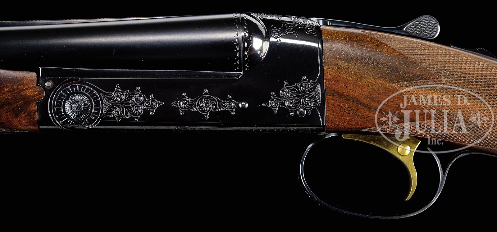 Please Note: Factory letter information indicates this was restocked and refinished in 1967. *SCARCE WINCHESTER MODEL 21 CUSTOM GRADE SHOTGUN.SN 27912. Cal. 20 ga. 2-3/4″ chambers with 26″ steel bbls with full length matted top rib and steel center bead and red front bead marked “Custom Built by Winchester”. Jeweled water table with standard Model 21 markings as are jeweled bbl flats and chokes marked “WS1-WS2”. Gold plated SST, automatic ejectors, non-automatic safety. Straight grip buttstock of flame grained American walnut with vacant gold oval at toe is checkered in 3-pt pattern and finished with checkered butt. Flat side receiver is nicely, lightly scroll engraved in standard “Custom Grade” engraving pattern. A near identical example of which can be seen on page 284 of the book “Winchesters Finest the Model 21 by Ned Schwing“. Bottom of receiver, trigger plate and trigger guard are also lightly scroll engraved. Beaver tail forearm checkered in 5-pt pattern with light scroll engraving near roll type release and black triangular ebony insert at tip. Weight: 6 lbs. 9 oz. Drop at comb: 1-7/16″, drop at heel: 2-1/4″. LOP: 14”. CONDITION: Extraordinarily fine, near new, likely test fired only. Retains nearly all of its bright orig finish to both wood and metal. Only visible wear noted is trigger shows minute flaking in plating and beginning toning at trigger guard tang. Mechanics are excellent as one would expect in a near mint gun. 50819-16 JSL (12,000-18,000) C&R – Lot 3586 Click here to view provenance