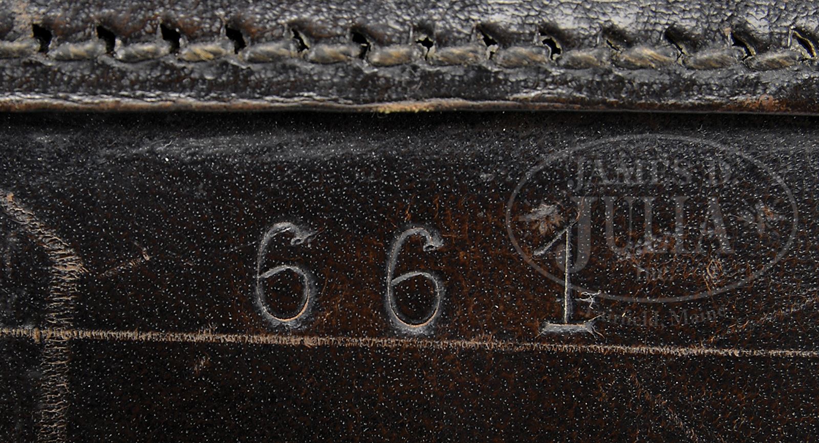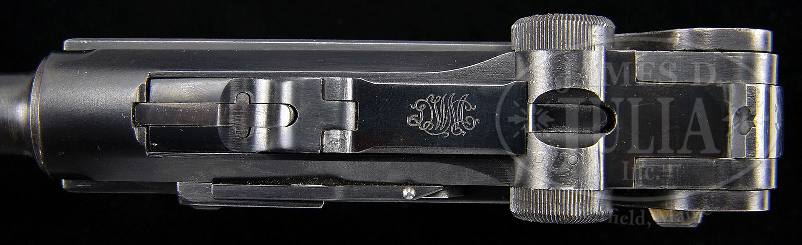 *◊ PRUSSIAN POLICE DWM/MAUSER “v” SUFFIX LUGER WITH MATCHING HOLSTER & MAGAZINE.SN 662v. 4″ 9mm bbl. DWM scroll on center toggle link. Large, fine line Crown/Crown/U on left side of receiver and bbl. Sear safety. Deactivated Walther magazine safety. Checkered walnut grips. All numbered parts are matching. Original matching numbered wood bottom magazine. Rare V Suffix Luger with parts made by DWM and finished by Mauser. This gun is featured on pp. 538, 611, 750, 768, and 1298 of Dr. Geoffrey Sturgess’ The Borchardt & Luger Automatic Pistols. Accompanied by original dark chocolate colored leather Prussian police holster of Akah manufacturing style that is numbered on the back 661, one digit off the gun serial number. PROVENANCE: Collection of Dr. Geoffrey Sturgess. CONDITION: Excellent retaining 97% original early Mauser finish with very high polish toggle assembly and matt frame recess panels. 95% original straw. Bore is sharp with frosting. Grips are sharp with very little wear and nice wood grain. Left grip is missing upper left hand corner from installation of magazine safety. Magazine is very good. Some corrosion on the body. Mechanics are sound. Holster is excellent with original finish with light scuffs. 43475-739 BWS31 (5,000-7,500) – Lot 3587
