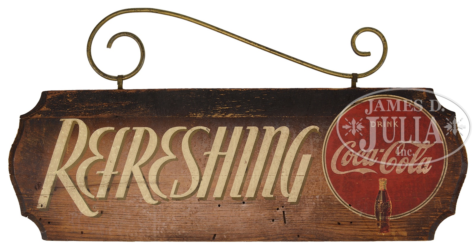 Coca-Cola made a pair of these signs, one that read “Delicious” and this one that reads “Refreshing”. The back stamp on this sign dates it between 1934-1938. Portions of it are made from American Chestnut and it appears all original including the scroll metal hanging bracket. SIZE: 24″ w x 12-1/2″ h with bracket. CONDITION: Appears to be original surface with darkening to the surface varnish concentrated across the top. Otherwise good to very good. 1-14139 (400-700) – Lot 3588