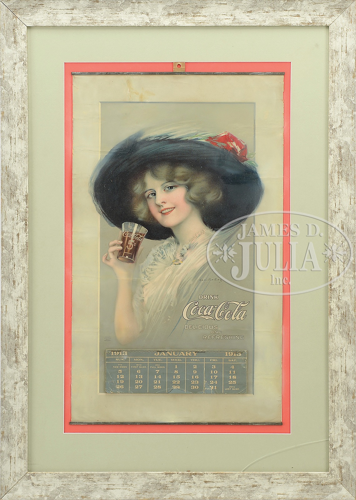 COCA-COLA 1913 CALENDAR.Hamilton King illustration of the Coca-Cola girl with a flared etched Coca-Cola glass in her hand. SIZE: Sight: 13-1/2″ w x 22-1/2″ h. CONDITION: Overall good condition with original date pad and top & bottom metal strips. Calendar has had significant repairs and inpainting to horizontal roll creases/tears which are apparent. A 4″ x 5″ portion of the top left corner appears reattached and inpainted. 1-14010 (3,000-4,000) – Lot 3589 Auction: Advertising, Toy & Doll - Spring 2014 Please Note: All prices include the hammer price plus the buyer’s premium, which is paid by the buyer as part of the purchase price. The prices noted here after the auction are considered unofficial and do not become official until after the 46th day. |