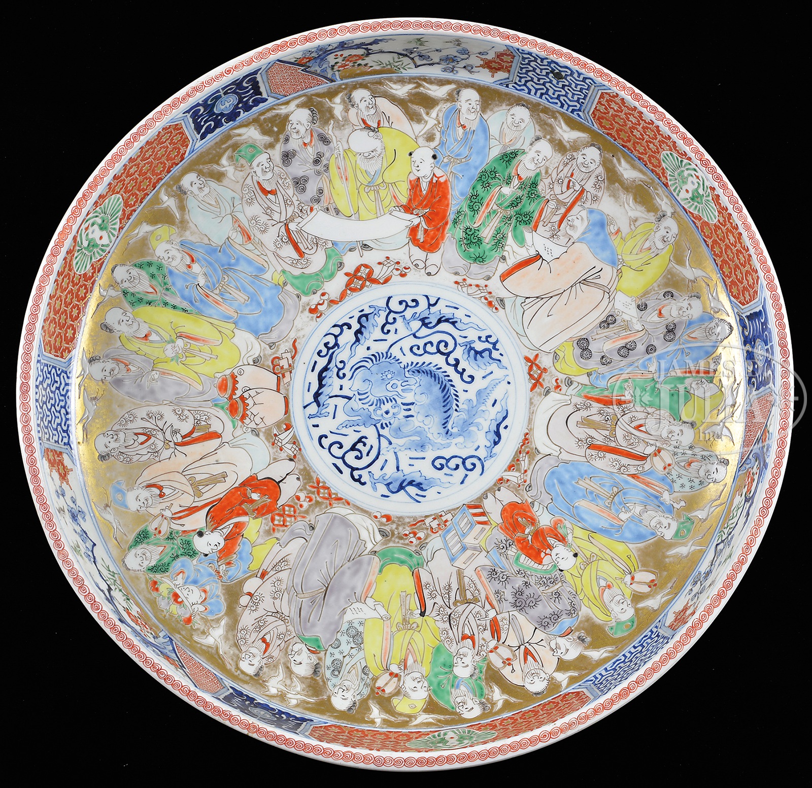 PAIR ARITA WARE PORCELAIN PLATES WITH LARGE SHALLOW SERVING BOWL.1) 18th/19th century, Japan. Lobated edge, chrysanthemum pattern of various brocades. Spurious Ming Cheng Hua mark on bottom. 2) Large round shallow bowl polychrome decorated overall with a gathering of scholars centering a rondel with Shishi amongst scrolling vinery in underglaze blue, all written in gilt and brocade border. SIZE: 1) 9″ dia. 2) 18-3/4″ dia. x 3-1/4″ h. PROVENANCE: From a private New York State collection. CONDITION: 1) Generally very good. 2) Good overall. 9-92677, 9-92637 (100-150) – Lot 3590