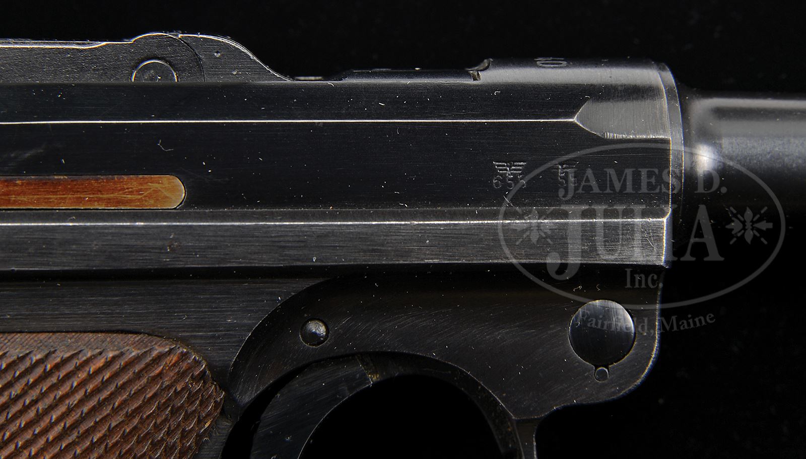 *◊ RARE WWII GERMAN ARMY ISSUE MAUSER BANNER.SN 1084x. 4″ 9mm bbl. “1940” marked above chamber. Mauser banner on center toggle link. Eagle/N proof on the left receiver. Eagle/655 proofs on right receiver. All numbered parts on the gun are matching, including the matching military style checkered walnut grips. Extruded aluminum bottom “FXO” magazine does not match. This gun is featured on p. 772 of Dr. Geoffrey Sturgess’ The Borchardt & Luger Automatic Pistols. Manufactured for police use. The receiver has holes for a sear safety that was never installed, instead the gun was diverted for military issue. PROVENANCE: Collection of Dr. Geoffrey Sturgess. CONDITION: Excellent retaining 98% original blue with a few light scratches. Bore bright and sharp with light frosting. Grips are sharp with beautiful wood grain and very minor wear. Magazine is near mint. Excellent mechanics. 43475-569 BWS36 (5,000-7,000) – Lot 3593