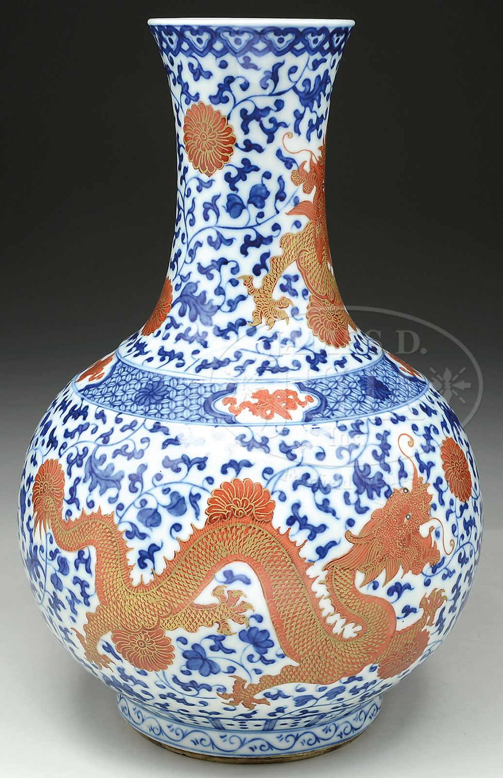 PORCELAIN BOTTLE. Ch’ing dynasty, 19th century, China. Decoration of dragons and floral scrolling in iron red and underglaze blue with gilding. SIZE: 16″ h x 10″ dia. CONDITION: Very good. 7-74563 (400-600)