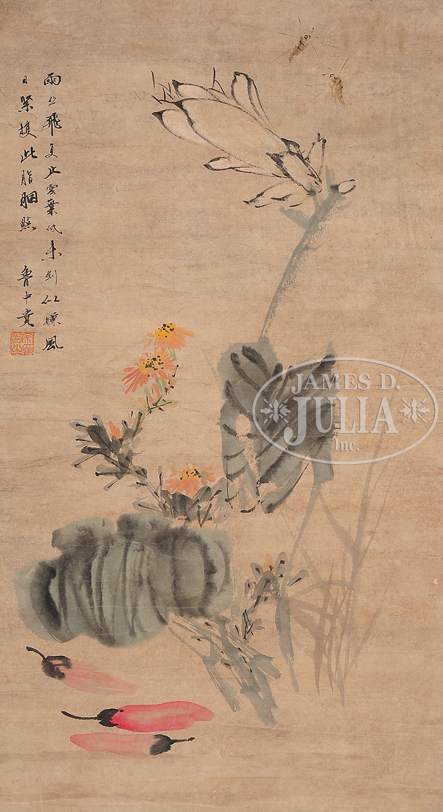 THREE HANGING SCROLLS.China, 20th century, ink and colors on paper. 1) After Ren Yi, depicting wild geese amidst herbaceous peonies and reeds, inscribed, dated wuzi year, signed “Ren Bonian,” with one seal. 2) Depicting magnolia and daisies, inscribed, signed “Lu Zhongui,” with one seal. 3) Depicting peacocks amidst peonies, inscribed, dated jiayin year, signed “Binghua,” with two seals. SIZE: 1) 51″ x 25-1/2″ 2) 25-3/4″ x 14-1/2″. 3) 41-1/2″ x 20″. CONDITION: 1 & 2) Stain, surface grime, & abrasion. 3) Good. 7-75160-1 (400-600) – Lot 3594