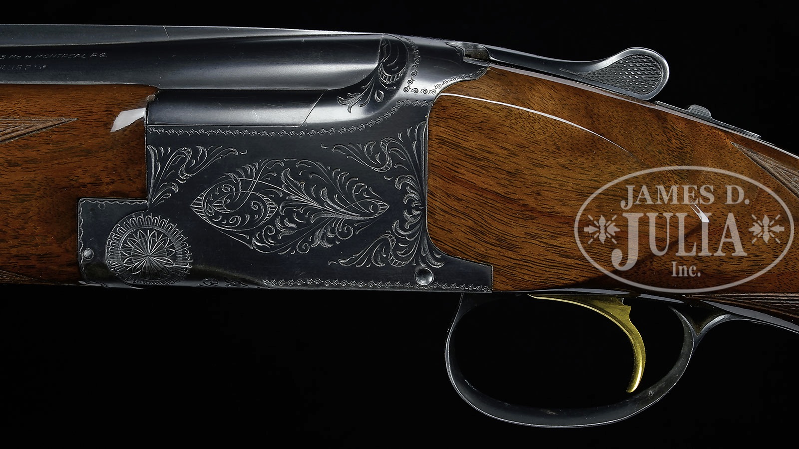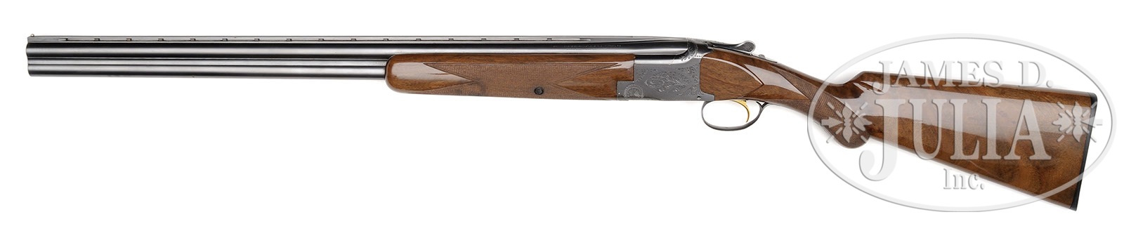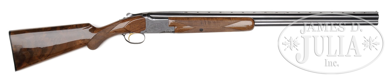 *BROWNING SUPERPOSED GRADE 1 “LIGHTNING”.SN 81080. (1960) Cal. 12 ga. 2-3/4″ Chambers. Standard nomenclature is on tops of 28″ ventilated rib bbls, choked modified and full. Typical blued action features single selective gold-plated trigger. Nicely crotch figured claro walnut long tang, round knob buttstock measures 14-3/8″ over Browning composition buttplate. Point pattern checkering with line borders is at grip, and on matching one piece forend. Drop at heel: 2-3/8″, drop at comb: 1-7/16″. Weight: 7 lbs. 4 oz. LOP: 14-3/8″. CONDITION: Excellent, retaining approx 95% orig blue on bbls and action, with some light flecking on bbls, and silvering of sharp edges on bottom of action. Stocks retain nearly all of their fine gloss finish with a few light marks. Bores are excellent. Action is tight. Mechanically excellent. 4-49526 MGM104 (1,500-2,500) – Lot 3599