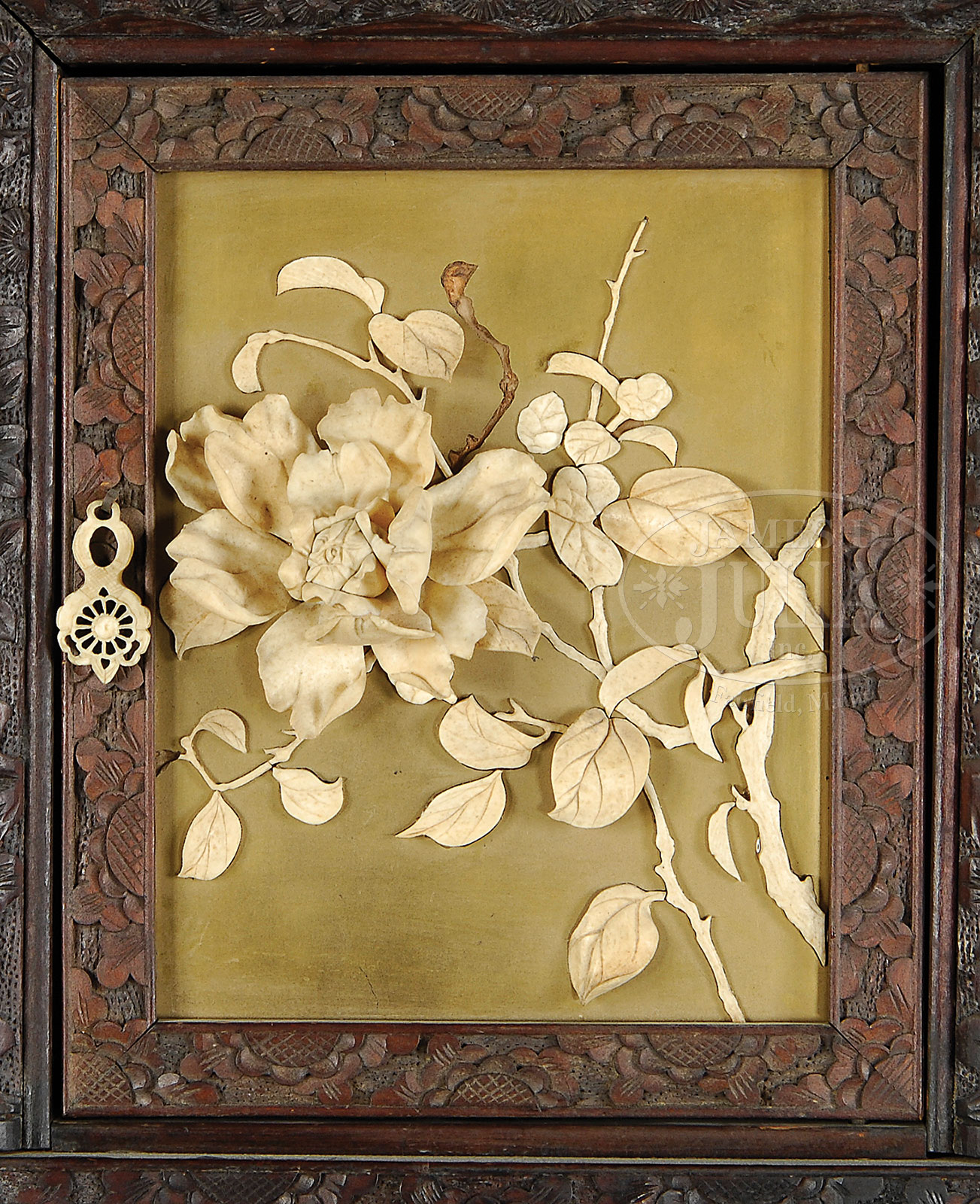 ELABORATE CARVED ORIENTAL HARDWOOD CABINET.Second half 19th century. The rectangular case with deeply carved arch crest depicting opposing fighting dragons within cloud bands above the rectangular case, densely carved overall. With prunus, conifers, cranes, songbirds, and multiple dragons. The cabinet fitted with an arrangement of doors, drawers, and open shelves centering an arched footbridge. Valance and side panels with foliate pierce carved panels. The door panels, drawer fronts, and medial back panels each fitted with a gold lacquer plaque inlaid with ornately carved chrysanthemums, peonies, iris, and other floral sprigs and sprays, in deep relief and of excellent quality. The whole on a carved base of opposing dragons centering a foo dog mask, all with inlaid abalone eyes. The whole raised on scrolled feet. SIZE: 82″ h x 48″ w x 20″ d. PROVENANCE: The cabinet was originally part of the Christian Heurich, Jr. family collection of Washington, D.C. CONDITION: Generally very good with original surfaces. Most carved elements in place with minimal and minor losses of some petals. 52380-36 (2,000-4,000) – Lot 3599
