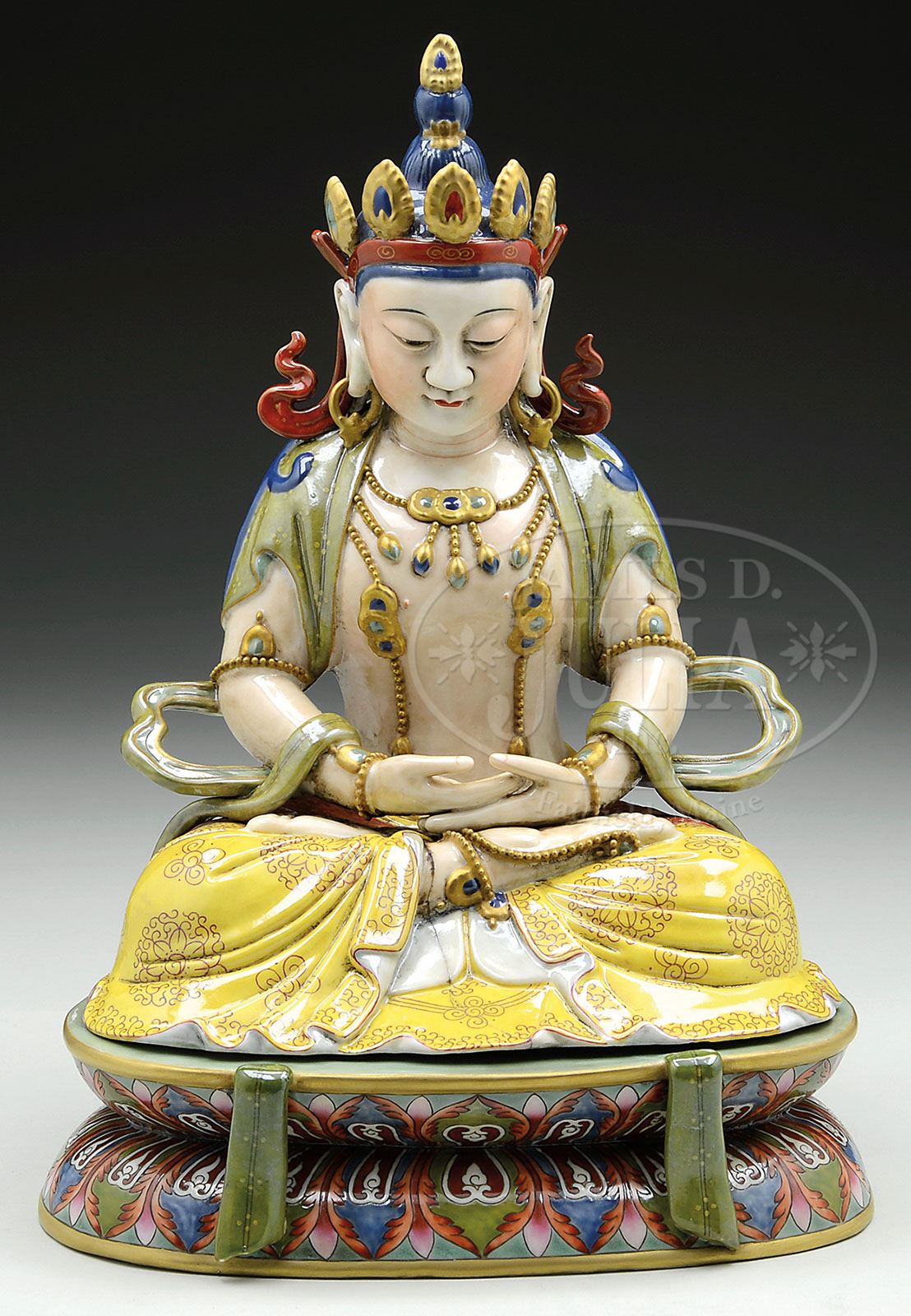 PORCELAIN BUDDHA ON LOTUS BASE. 20th century, China. Seated jeweled figure on a detached lotus throne. Famille rose enameled surface. SIZE: 12-3/4″ h. CONDITION: Crack through the base of the figure, otherwise very good. 7-70506 (2,000-3,000)