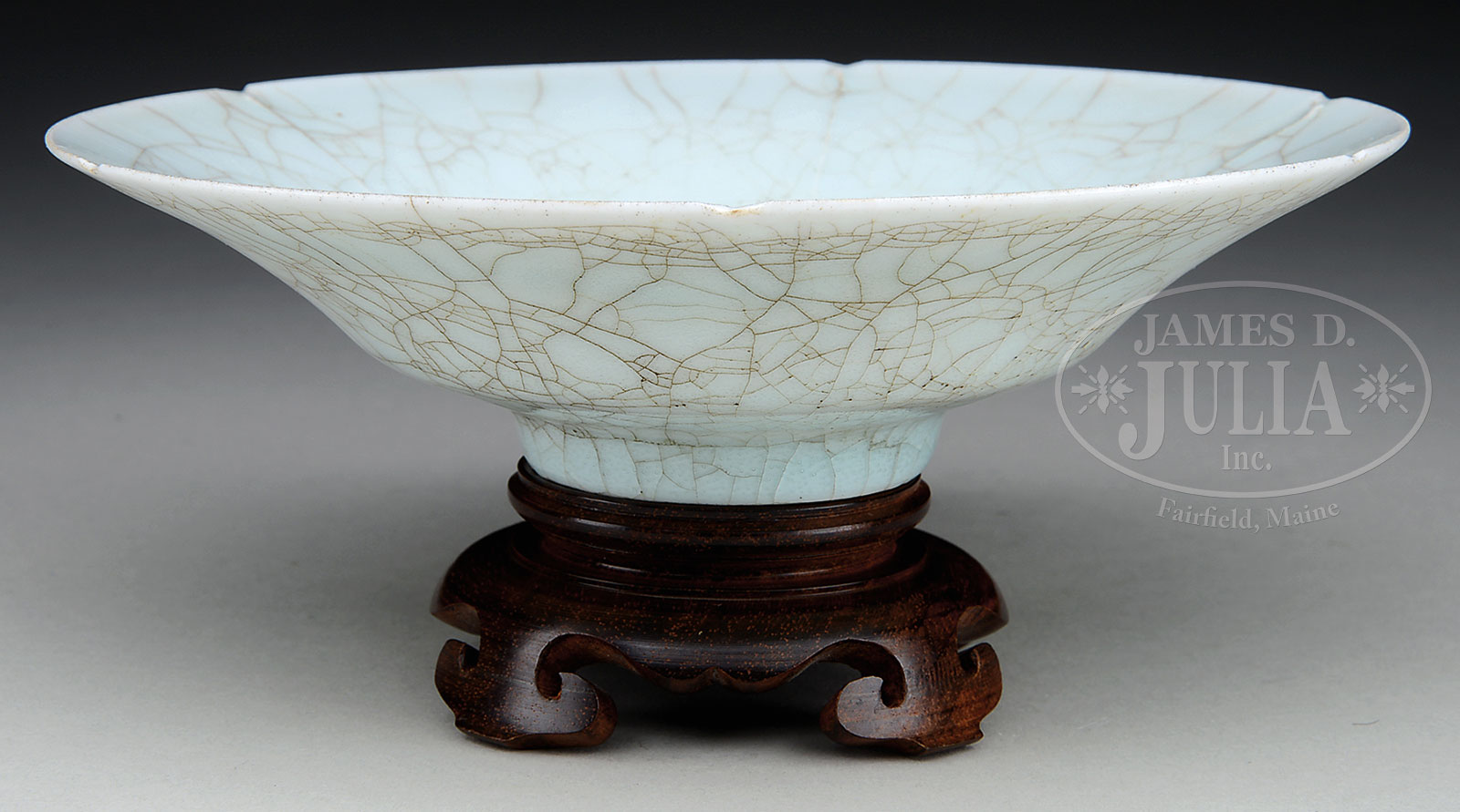 QINGBAI GLAZED PORCELAIN DISH.China. The dish with flaring walls and standing on a narrow foot with a lightly applied glaze having a crackle finish and revealing a light teal color where pooled. Comes with wood stand. SIZE: 6-1/2″ dia. CONDITION: Very good. 52078-1 (1,500-2,000) – Lot 3606