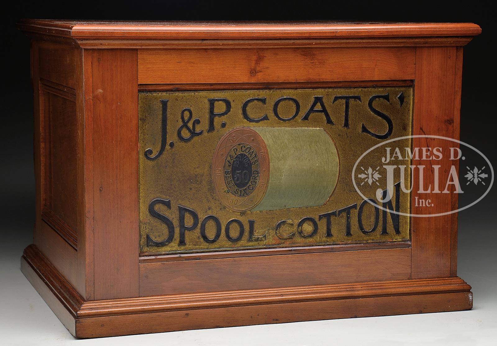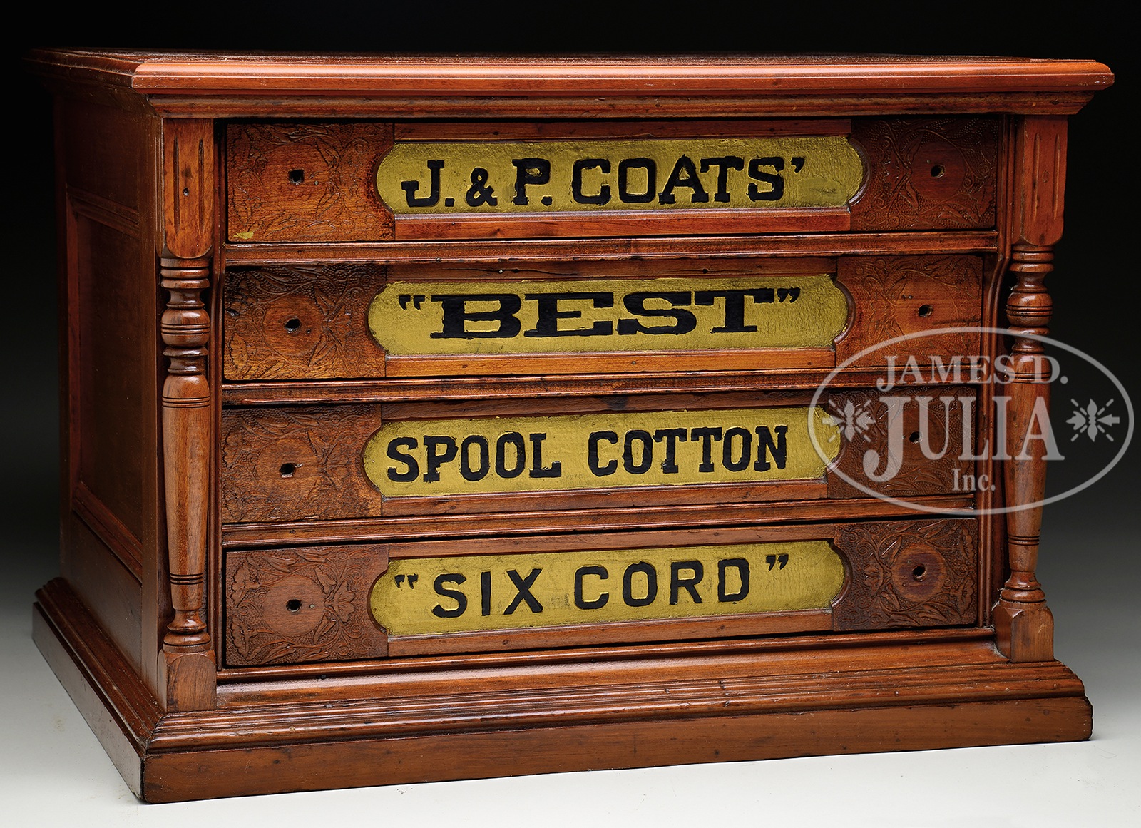 J&P COATS FOUR-DRAWER SPOOL CABINET.Cherry cabinet with original raised letter drawer fronts which read “J&P Coats”, “Best”, “Six Cord”, and “Spool Cotton”. This cabinet has an embossed rear tin panel with a thread spool and “J&P Coats Spool Cotton”. Circa 1900. Missing drawer pulls. SIZE: 22″ w x 15-3/4″ h x 17-1/2″ d. CONDITION: Very good with refinished surface. 1-13746 (300-500) – Lot 3611 Auction: Advertising, Toy & Doll - Spring 2014 Please Note: All prices include the hammer price plus the buyer’s premium, which is paid by the buyer as part of the purchase price. The prices noted here after the auction are considered unofficial and do not become official until after the 46th day. |