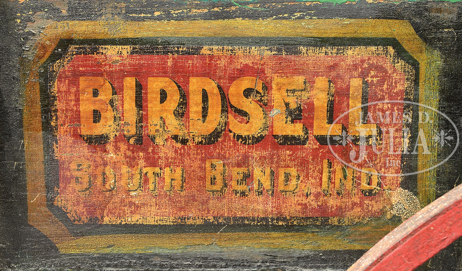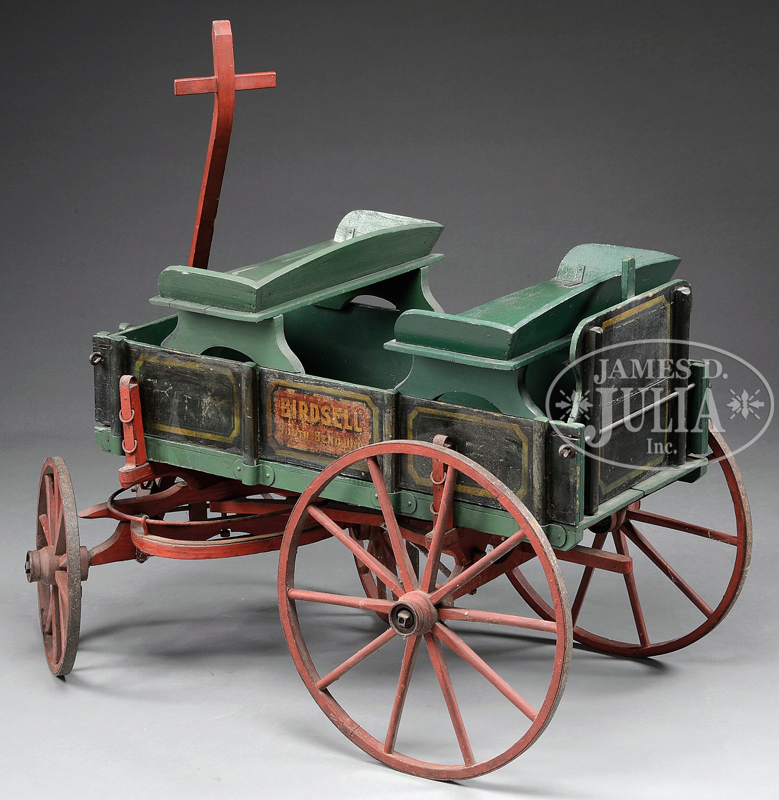 BIRDSELL ADVERTISING WAGON.Wooden two seat goat wagon with removable bench seats and hand painted decoration stating “BIRDSELL SOUTH BEND, IND” on left and right side. Complete with pull handle and steel hardware including wheel slips. SIZE: 42″ l x 26-1/2″ w x 28-1/2″ h. CONDITION: Structurally very good. Most of wagon has been repainted with exception of exterior walls that show original advertising. 1-13707 (400-800) – Lot 3614 Auction: Advertising, Toy & Doll - Spring 2014 Please Note: All prices include the hammer price plus the buyer’s premium, which is paid by the buyer as part of the purchase price. The prices noted here after the auction are considered unofficial and do not become official until after the 46th day. |