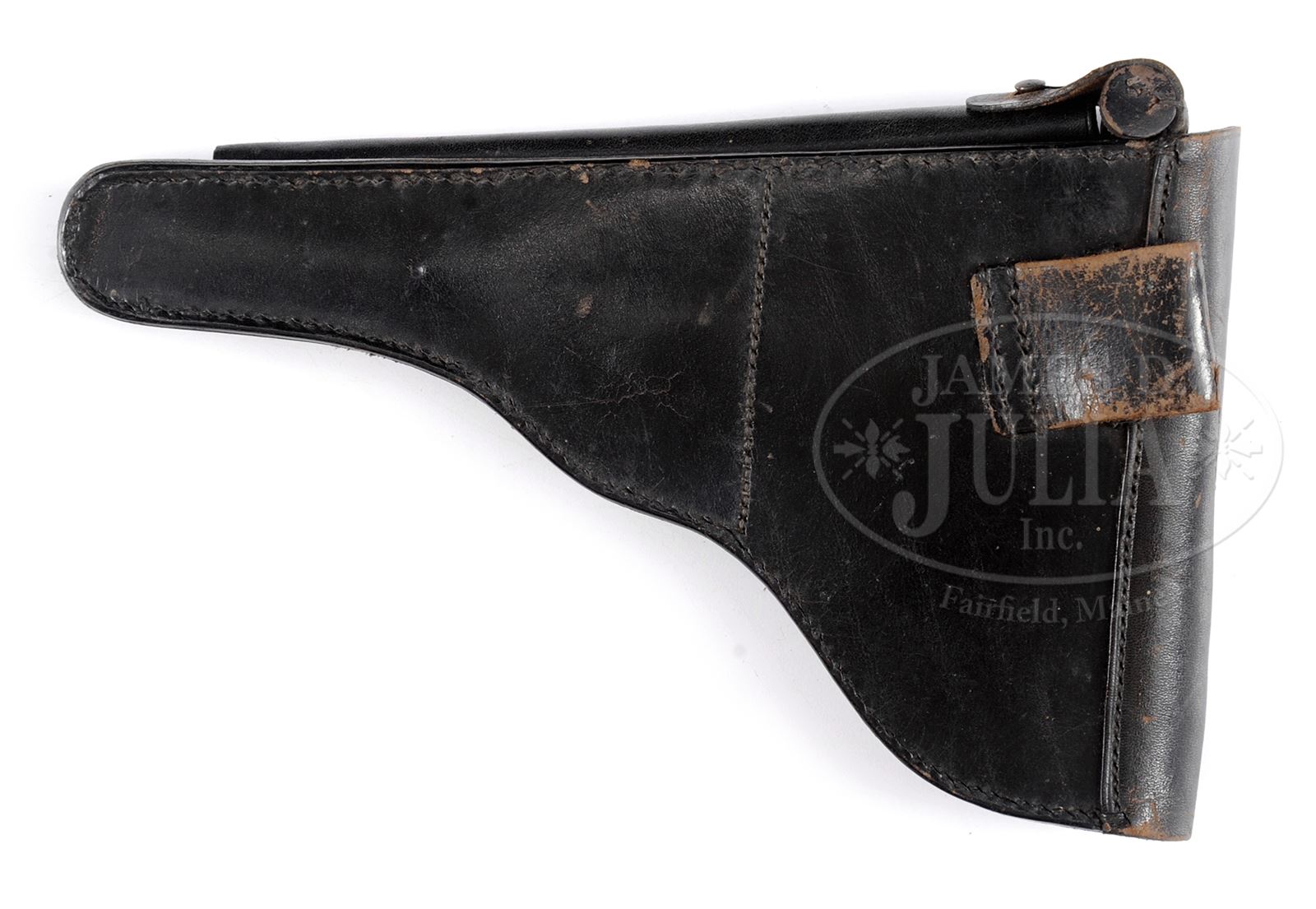RARE EARLY 1900 LUGER PISTOL COMMERCIAL HOLSTER.Black leather with brass studs for closure of flap lid, and takedown tool & cleaning rod flaps. Black stitching. Single 37 mm wide belt loop sewn on back. This holster is pictured on pg 1169 of The Borchardt & Luger Automatic Pistols by Joachim Gortz and Dr. Geoffrey Sturgess. PROVENANCE: Collection of Dr. Geoffrey Sturgess. CONDITION: Very fine, orig dye with minor wear on edges. Minor flaking at front and around closure stud. Cracking on crease of belt loop. Patina on brass. 43475-1076 BWS (2,000-3,000) – Lot 3615