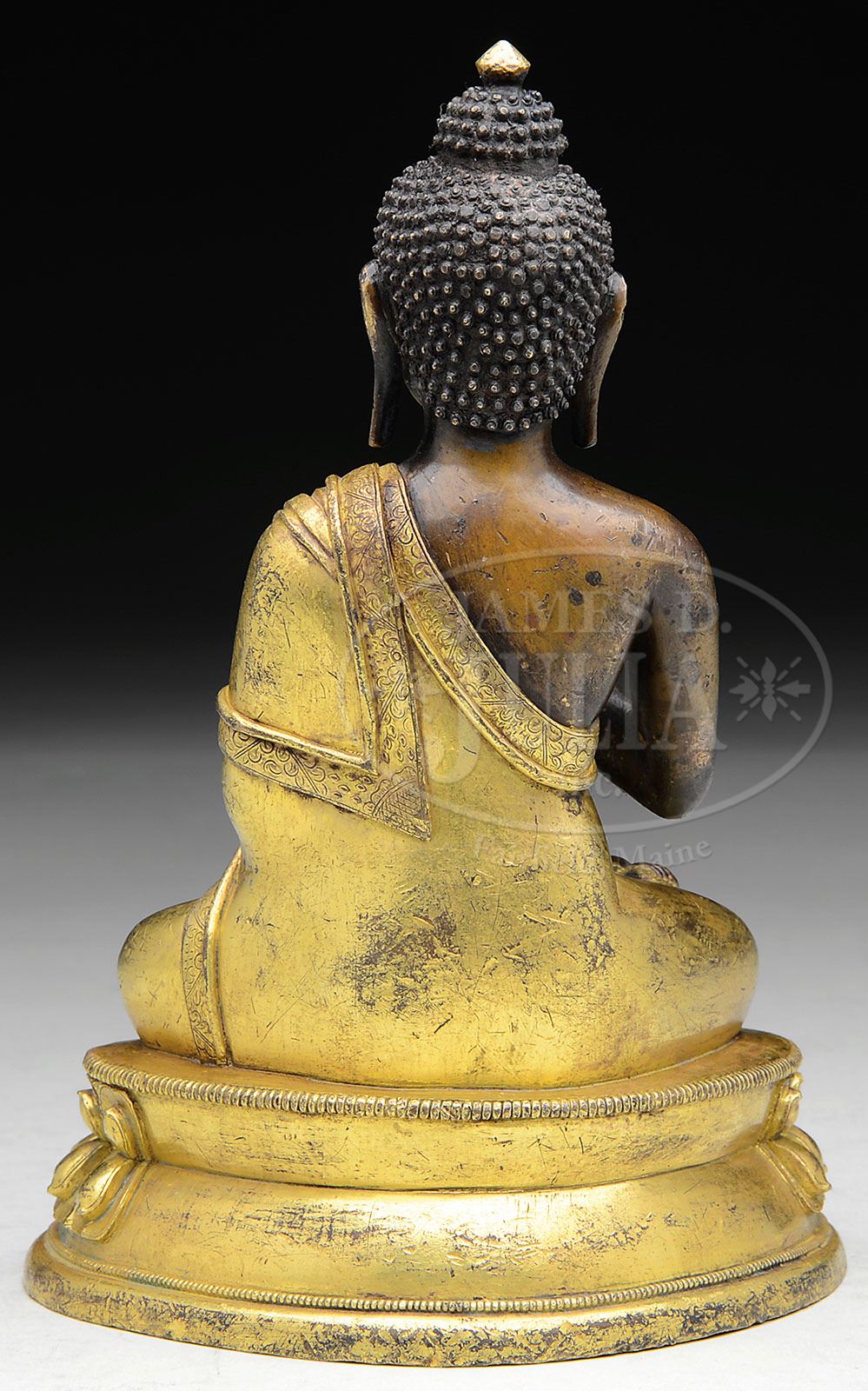 BRONZE IMAGE OF A BUDDHA. 20th century, China. Parcel gilt image of Amida Buddha. Accompanied by box. SIZE: 7” t x 4-1/2” w. PROVENANCE: The Estate of John Gerhardt Family Trust. CONDITION: Good to very good with deterioration to plaque at bottom of bronze Buddha. 9-25044 (1,800-2,500)