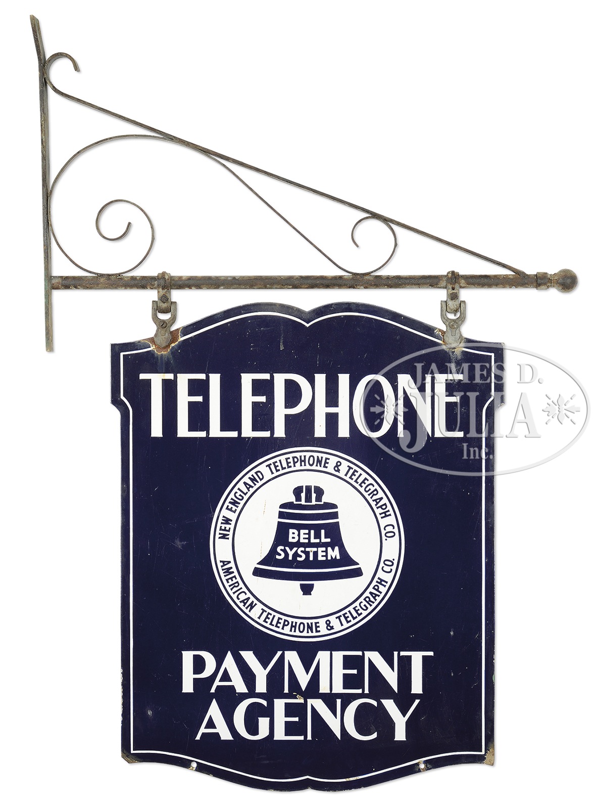BELL TELEPHONE “PAYMENT AGENCY” PORCELAIN SIGN WITH BRACKET.Two-sided sign which originally hung outside a payment office for the New England Telephone & Telegraph Co. / American Telephone & Telegraph Co. which were both part of the Bell System. Includes original galvanized steel wall mount bracket. SIZE: Sign: 24″ w x 30″ h. Bracket: 32″ l. CONDITION: One side grades very good with porcelain loss at mounting brackets, bottom perimeter edge and 1″ field chip. Other side appears very good to excellent with some porcelain loss at mounting brackets and bottom corners. Appearance would be enhanced with a thorough cleaning. 1-14148 (500-1,000) – Lot 3616 Auction: Advertising, Toy & Doll - Spring 2014 Please Note: All prices include the hammer price plus the buyer’s premium, which is paid by the buyer as part of the purchase price. The prices noted here after the auction are considered unofficial and do not become official until after the 46th day. |