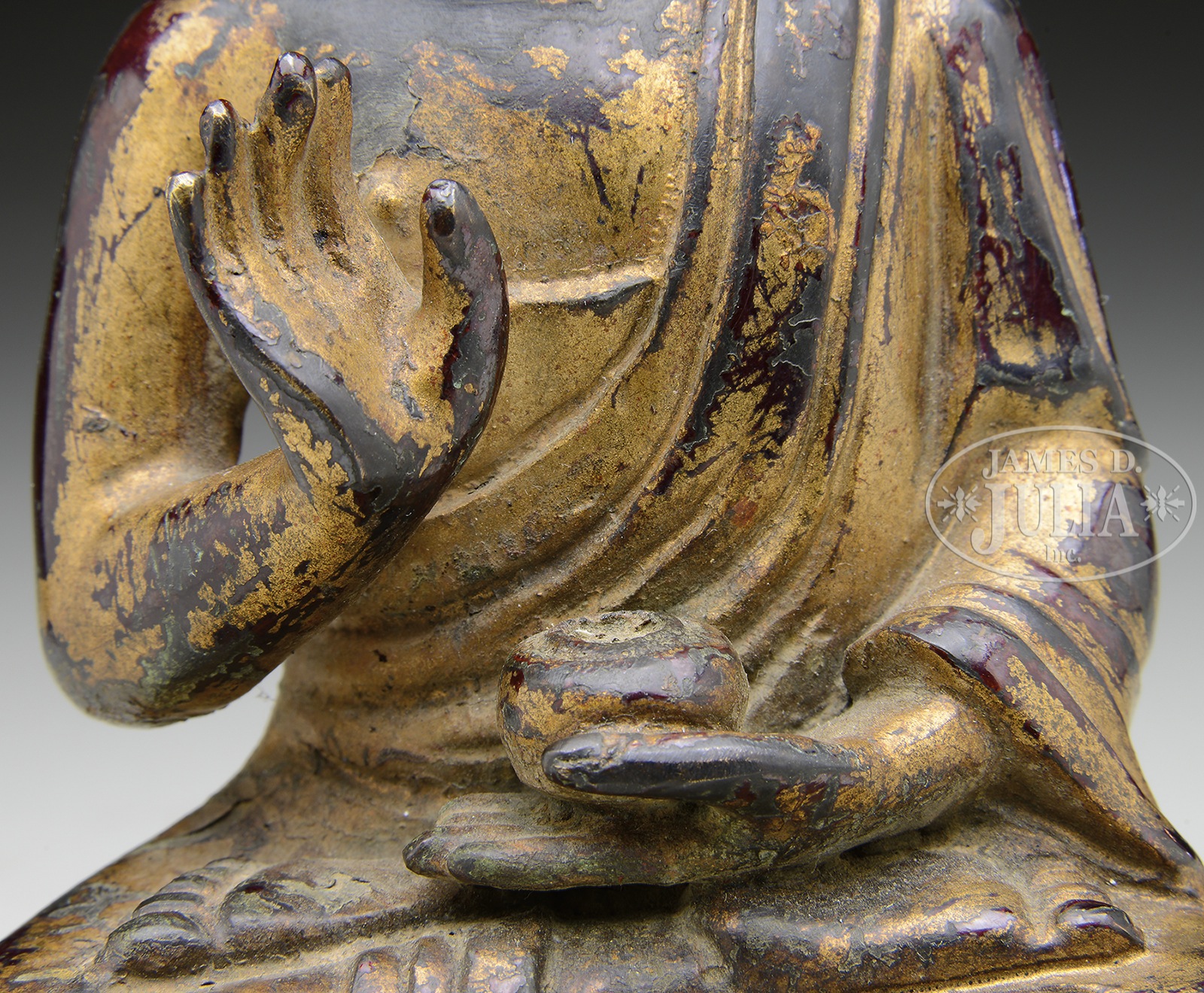 GILT BRONZE BHAISAJYAGURU FIGURE.China. The gilt bronze Bhaisajyaguru figure seated on double lotus throne, with flowing robes and serene expression. SIZE: 8-1/8″ h. CONDITION: Age related loss of gilt, discoloration, and distortion. 7-75283 (500-700) – Lot 3618