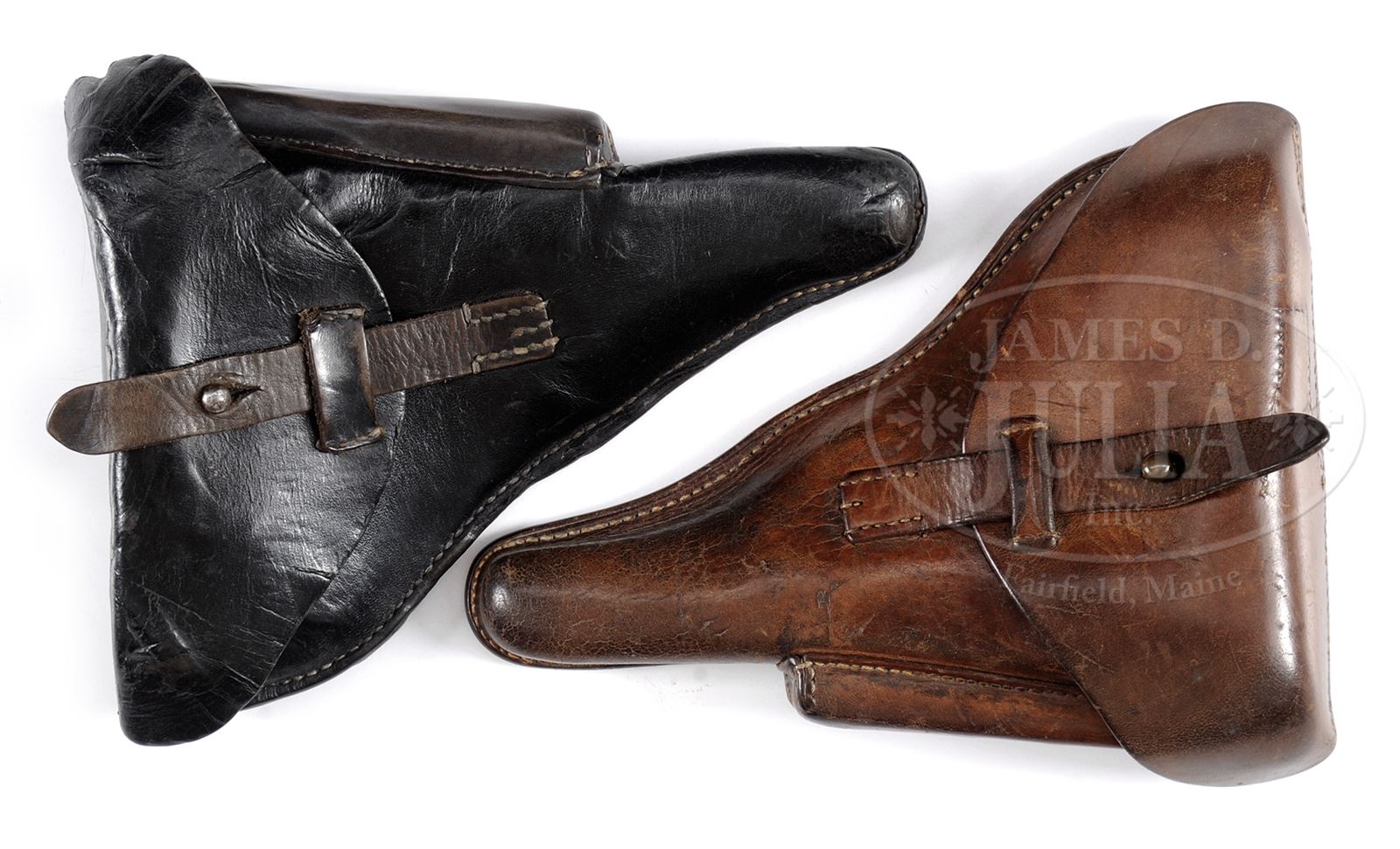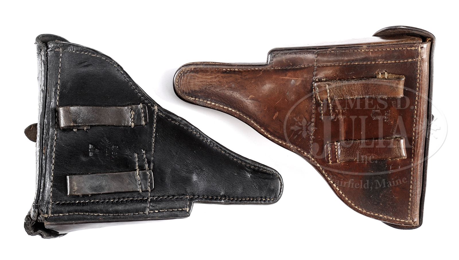 RARE PAIR OF GERMAN POLICE LUGER PISTOL HOLSTERS.First is a brown leather holster marked “GUSTAV REINHARDT/BERLIN/1929” above “K” in starburst Police acceptance stamp. Back is also police unit marked “L.Sch. 108.” (Luftfahrt-Überwachungs-Abteilung (Air Surveillance Unit) Schleswig-Holstein, weapon no. 108 under the 1922 Prussian marking instructions) Police style up-strap, with brass stud closure, takedown tool pouch closure flap also has brass stud. Second is an extremely rare black impregnated pressed paper holster marked “SCHAMBACH & Co./BERLIN/1943” on back with very clear Police Eagle/B acceptance stamp. Straps and pouches are leather. Studs are metal. Black paper holster is pictured on pg 1245 in The Borchardt & Luger Automatic Pistols by Joachim Gortz and Dr. Geoffrey Sturgess. Brown leather holster is pictured on pg 1265. PROVENANCE: Collection of Dr. Geoffrey Sturgess. CONDITION: Brown leather holster retains orig dye that has darkened and stitching is orig color. Normal wear with light scuffs and cracking on straps. Some verdigris around brass, minor burn area on back. Black paper holster shows very little wear, other than age wrinkling from drying and warping of the impregnated paper. 43475-1091 BWS (2,000-3,000) – Lot 3620