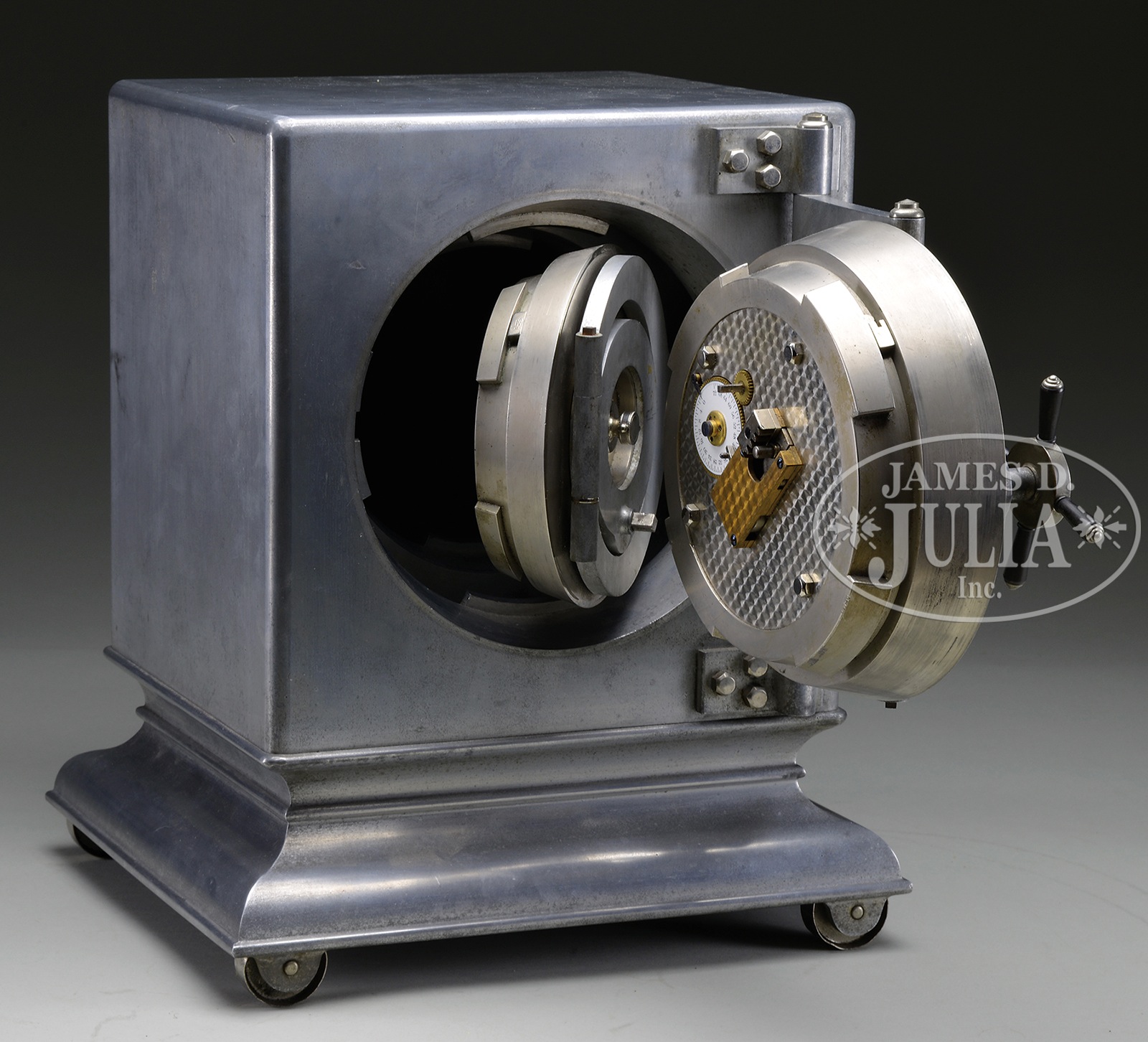 SALESMAN SAMPLE SAFE/VAULT.One of the most unusual and interesting salesman samples we have had the pleasure of offering. The polished aluminum cubicle case stamped “12” is on four caster feet and features an exterior double hinged door with four handle turn lock and a 72-hour time lock on the reverse that appears to be reset by the accompanying ratchet key. Upon opening, a second double hinge door is revealed that contains a combination lock for added security. With open interior. SIZE: 12-1/4″ w x 14-1/2″ h x 11″ d. CONDITION: Near excellent. 1-14283 (2,500-3,500) – Lot 3621 Auction: Advertising, Toy & Doll - Spring 2014 Please Note: All prices include the hammer price plus the buyer’s premium, which is paid by the buyer as part of the purchase price. The prices noted here after the auction are considered unofficial and do not become official until after the 46th day. |