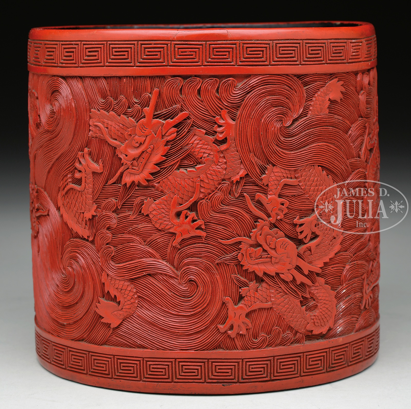 CINNABAR BRUSH POT.19th century, China. Surface carved with dragons and swirling waves with thunder meander borders. SIZE: 6-1/2″ dia x 6-1/2″ h. CONDITION: Very good. 7-75050 (600-800) – Lot 3622