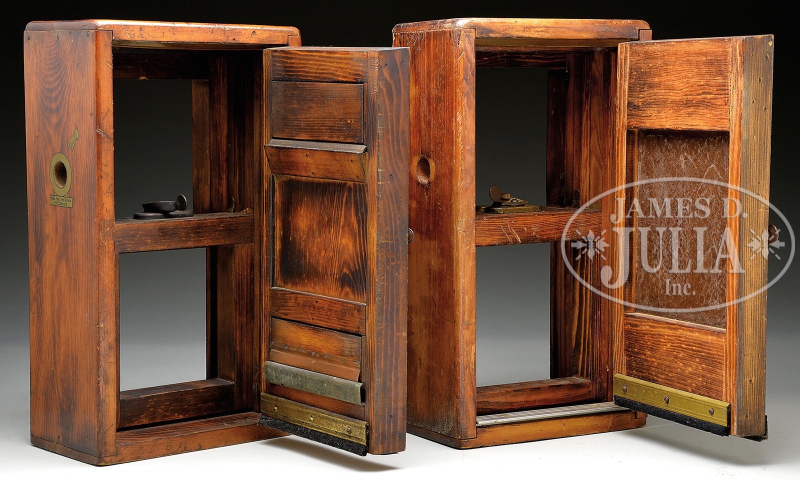 LOT OF TWO SALESMAN SAMPLE WINDOW SASHES.A pair of store display wooden boxes with hinged doors that open to reveal locking window frames from the Numetal firm that specialized in weather stripping for windows and doors. One door has its original Numetal decal while the other has an entire paper on wood panel devoted to advertising of the company (label has soiling, scuffs and missing small sections). This second example also retains metal makers plaque from Macklanburg-Duncan Co. SIZE: Each is 9-1/4″ w x 16-1/2″ h x 5-1/2″ d. CONDITION: Very good overall with scattered scrapes and chips to finish. 1-13983 (400-600) – Lot 3624 Auction: Advertising, Toy & Doll - Spring 2014 Please Note: All prices include the hammer price plus the buyer’s premium, which is paid by the buyer as part of the purchase price. The prices noted here after the auction are considered unofficial and do not become official until after the 46th day. |