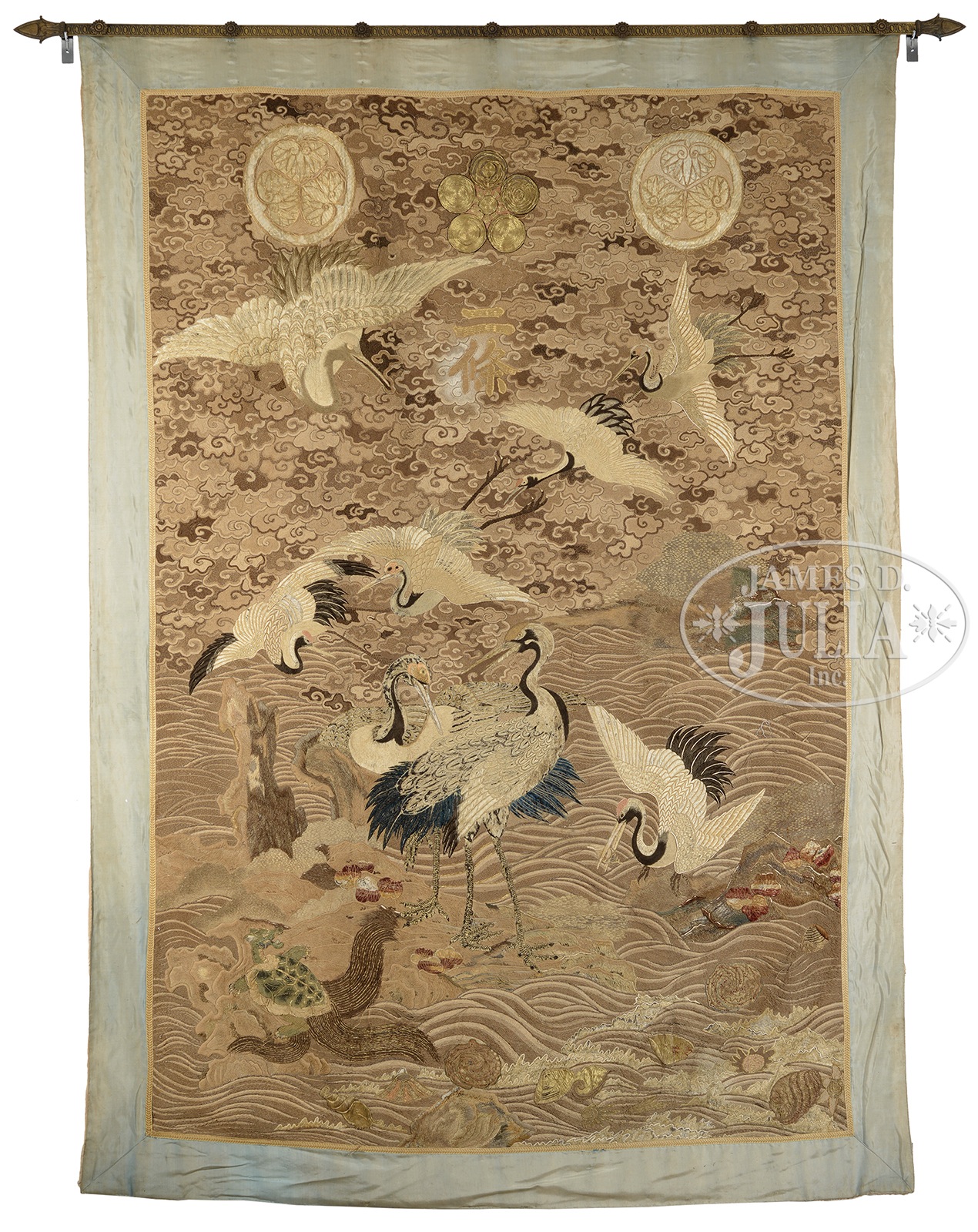 Please Note: There are no images showing this tapestry in a Victorian home that will accompany this lot. The date should be 19th/20th Century. LARGE SILK KESI EMBROIDERY OF HERONS AND DEITIES.China, late 19th century or earlier. The large silk kesi embroidered with the heron and deities in ocean setting motif, woven partially with golden thread, scrolled onto a decorated bronze horizontal bar. Lot is accompanied by images of the tapestry hanging in a magnificent ancestral Victorian home taken in 1897. SIZE: 88″ l x 59-1/4″ w CONDITION: Age related wear, loss of lining, and discoloration, a small amount of pulling has occurred at the top of the embroidery resulting in circles of metallic thread uncoiling. 50660-1 (1,200-1,800) – Lot 3627