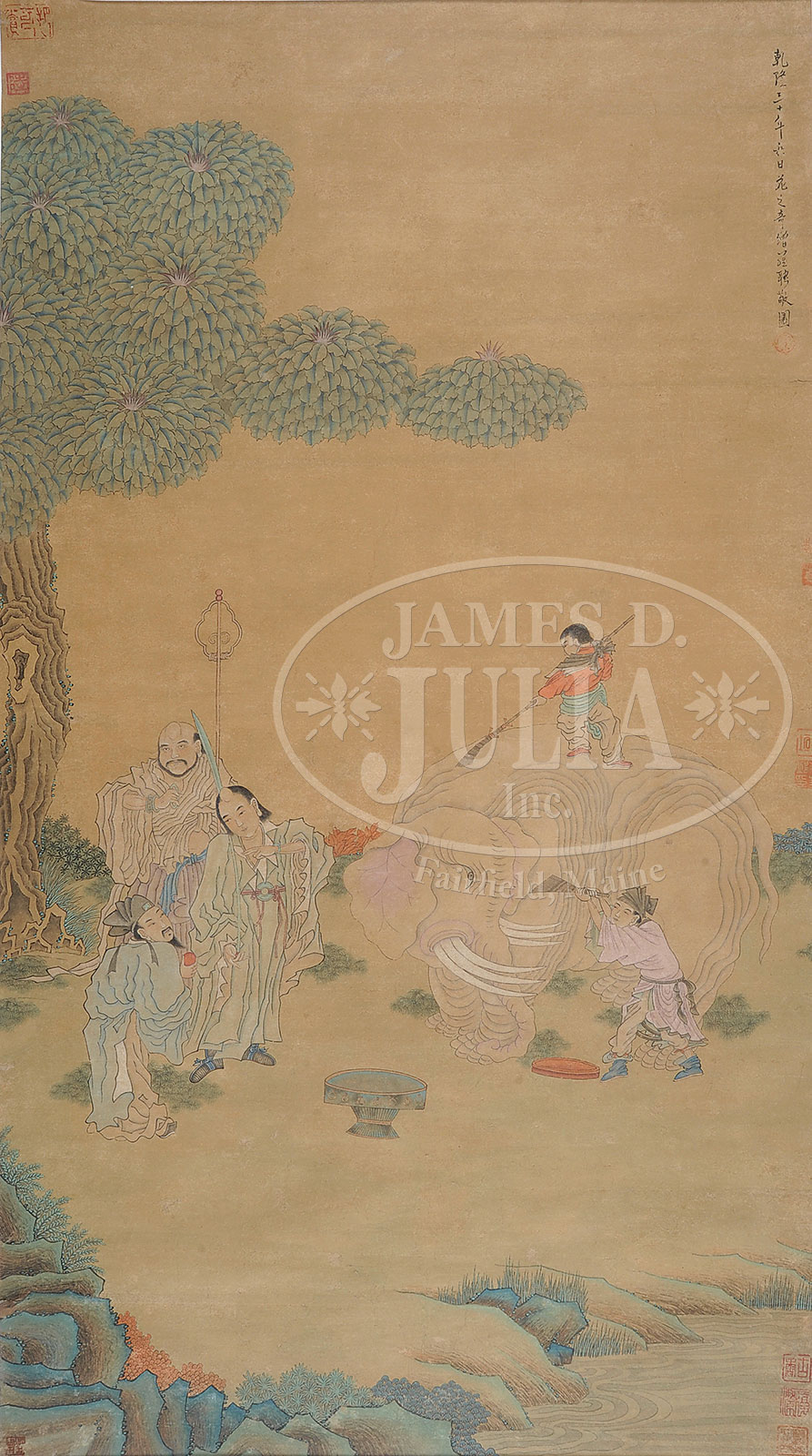 SCROLL OF FIGURES IN LANDSCAPE.China. 20th century. Image depicts a group of figures in a landscape including two attending an elephant with a quiet stream below. Script upper right along with numerous seals along margin. Possibly an embellished print. SIZE: 54″ h x 30-1/2″ w. CONDITION: Toning, couple small tears along margins, trimmed. 52038-4 (400-600) – Lot 3628
