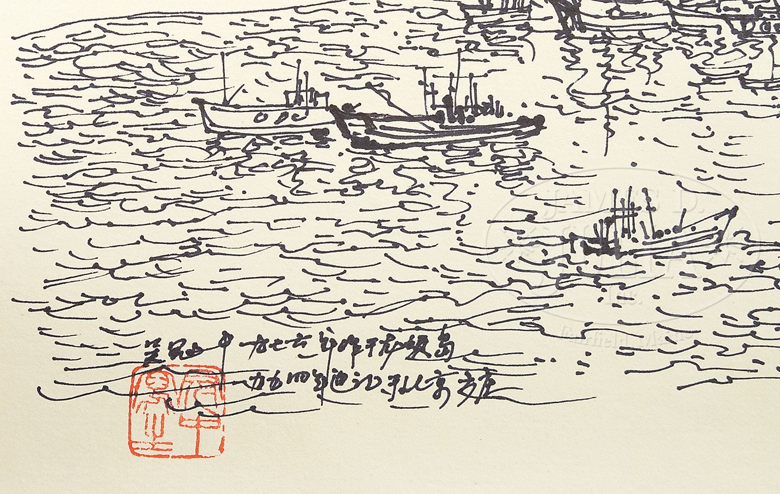 LOOSE PAINTING IN THE MANNER OF WU GUANZHONG. China, ink sketch of Longxu Island, inscribed, signed, dated with one seal “Guanzhong xie sheng” SIZE: 21-1/2″ x 18″ CONDITION: Good 9-92953 (750-1,000)