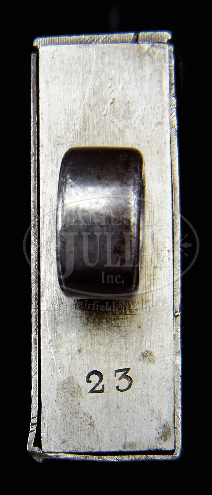 *◊ HIGHLY DESIRABLE GABBETT-FAIRFAX MARS M1901, CALIBER 8.5MM, OCTAGONAL BOLT HOUSING, EXTENDED MAGAZINE.SN 23. Cal. 8.5mm. At the turn of the last century, the Mars Automatic Pistol Syndicate made a small number of big bore pistols, the most powerful semi-automatic pistols of their time. This example has a bbl length of 9-1/2″, though at least 5/8″ of that length houses the bolt. Fixed front & rear sights. Lightly hand engraved on the rib is “MARS PISTOL. 8.5MM.”. Unusual octagonal bolt housing. The SN “23” appears at the bottom of the frame and is repeated on bottom of the magazine. Two separate sets of numbering have been added. According to the consignor, the large “93/648” notations on the left side of the gun, one electro-penciled on the forward frame extension, the other scribed upside down on the frame were applied by Kynoch as part of their inventory system. A separately stamped “629” is twice repeated on the frontstrap along with initials “EBL” within a shield – these were applied by the Eley Co. As true for most Gabbett-Fairfax pistols, this one is rust blued except for a few small parts, including the magazine, that were left in-the-white. Checkered walnut grips are each secured with a central screw. To open the action, the hammer is cocked and the carrier knob twisted 45 degrees counterclockwise, which unlocks the bolt from the bbl. As the bolt is withdrawn, a cartridge from the top of the magazine is drawn backwards onto a carrier which lifts the cartridge up, above the upper magazine extension, for chambering. There is no holdopen. Releasing the carrier knob allows the bolt to fly forward and lock into place, though sometimes the carrier ears need to be nudged clockwise to lock into place. The extra-long magazine, protruding about 1/2″ below frame, is loaded with the nose of the top bullet bearing against the elevated extension. PROVENANCE: Ex Visser Collection. Illustrated HBSA Journal, Vol. 2, No. 8. Collection of Dr. Geoffrey Sturgess. CONDITION: Orig blue with approx 70% coverage, with sharp edge wear, fading and patchy oxidation, particularly on left side of gun. Comparable staining & oxidation of small parts except hammer that has been lightly cleaned. The same considerations hold true for the magazine whose protected walls are in better condition. Grips have much orig varnish, darkened from oil, with blunted checkering & scattered handing marks. Near mirror bore. Perfect manual mechanics. An very interesting & all matching Gabbett-Fairfax Mars that is seldom offered for sale. 43475-241 LMA C&R (25,000-35,000) – Lot 3634